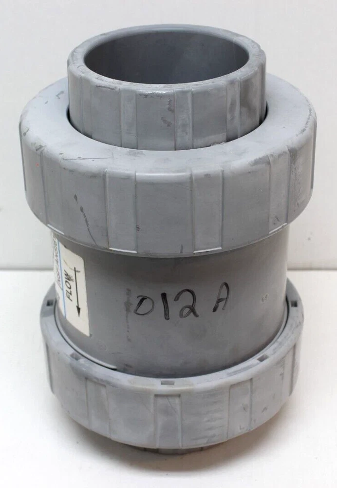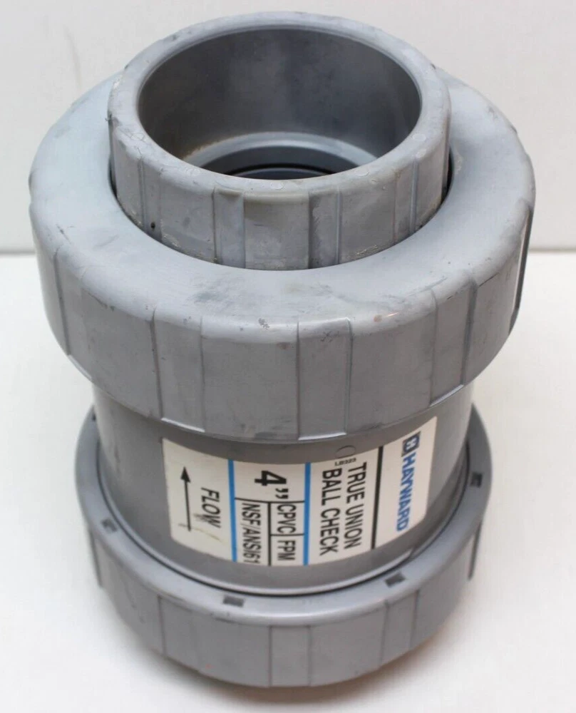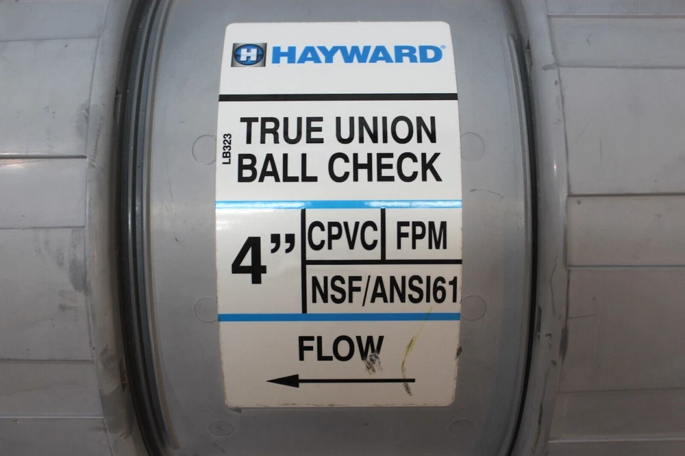 The Hayward True Union Check Valve is a 4" valve made of CPVC material with FPM seals, designed for use in industrial applications. It is NSF/ANSI61 certified, ensuring it meets quality and safety standards.