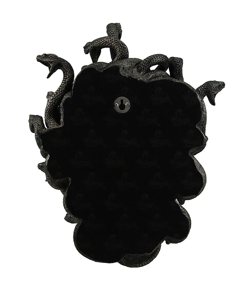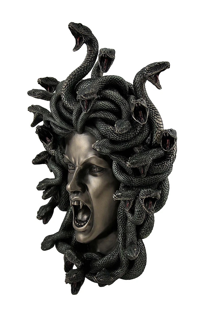 It's said that looking into the eyes of medusa instantly turns her victims to stone. The snake-haired gorgon serpent seemingly comes to life in a cold cast bronze sculpture, so you can proudly hang her head on your wall. Cold-cast bronze is a method of mixing bronze powder into a resin mixture to give it the look of solid metal with a striking bronze finish. The only color on this medusa sculpture is on the venomous snakes in green with red tongues, and the texture looks so real, it'll make you do a double take. And you thought you had morning hair! Medusa may be menacing, but you can tame her by hanging her head on the wall as a trophy! Our eBay Store About Us Add to Favorite Sellers Head of Medusa the Greek Gorgon Serpent Bronze Finish Statue 14.5 in. High, 11.5 in. Long, 4.5 in. Wide Expertly Sculpted in Cold Cast Bronze in Intricate Detail with an Amazing Realistic Texture Mixing Bronze Powder with Resin Creates a Solid Metal Appearance with a Striking Finish Hand Painted with Green as the Only Color Seemingly Brings the Snakes to Life, and It's Said that Looking Into the Eyes of Medusa Instantly Turns the Victim to Stone A Must-Have Piece for Any Fantasy or Mythology Art Collection It's said that looking into the eyes of medusa instantly turns her victims to stone. The snake-haired gorgon serpent seemingly comes to life in a cold cast bronze sculpture, so you can proudly hang her head on your wall. Cold-cast bronze is a method of mixing bronze powder into a resin mixture to give it the look of solid metal with a striking bronze finish. The only color on this medusa sculpture is on the venomous snakes in green with red tongues, and the texture looks so real, it'll make you do a double take. And you thought you had morning hair! Medusa may be menacing, but you can tame her by hanging her head on the wall as a trophy! Product Details Color Bronze Height 14.5 Length 11.5 Weight 4.85 LB