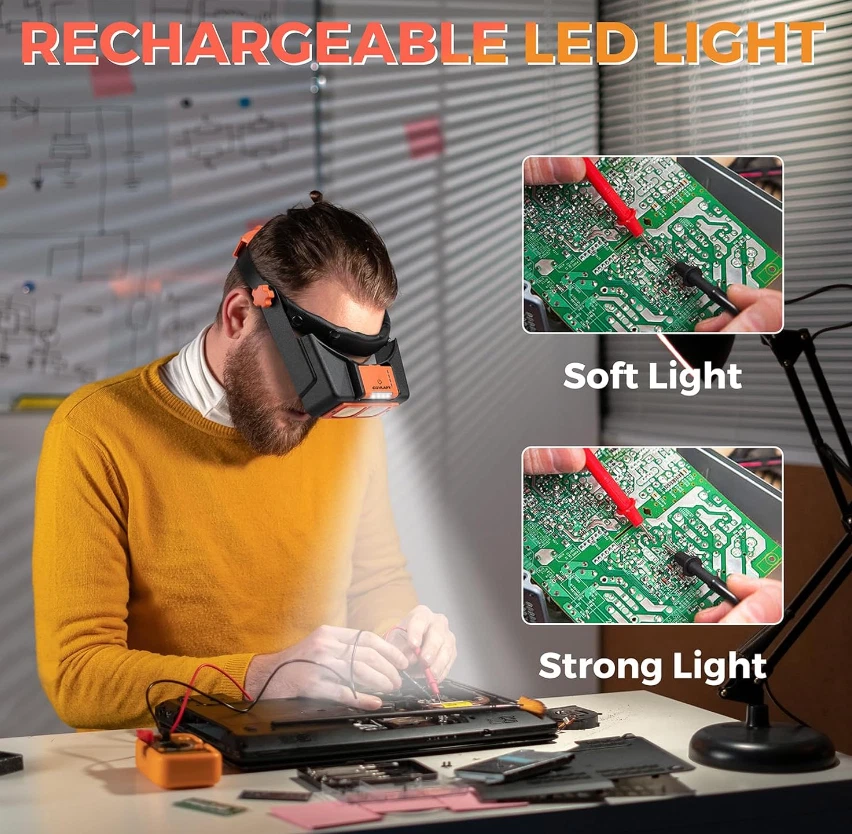 Free eBay listing template designed by dewiso.com Headband Magnifier with Light, Rechargeable Magnifying Glasses for Close Work, 1.5X - 3.5X Magnifying Headset with 4 Lenses, Jewelers Magnifying Glass Loupe Visor for Reading,Crafts, Hobby 【Rechargeable & Adjustable Led Lights】 This newest magnifying glass headband magnifier has 4 bright LED lights with 2 illumination modes for enhanced visibility in any dark or dim environment. More precise lighting area can be obtained by adjusting the light angle. The magnifying headset light can be charged via Type-C cable, and it can work continuously for 4-6 hours after 1.5 hours of full charge. With this hands free magnifying glass, productivity can be improved. 【Replaceable High-Definition Lens】 As a useful gift magnifying glass for elderly or any person dedicated to close work, this head magnifier comes with 4 replaceable acrylic crystal clear lenses of magnification 1.5x, 2x, 2.5x, 3.5x, which can meet various needs. Perfect optivisor headband magnifier for reading, painting, repairing, sewing, soldering, ect. All lenses can be easily assembled and disassembled. 【Fits with Eyeglasses】The magnifying glasses with light for close work is lightweight and nicely padded, you can wear it on top of your prescription eyeglasses. Also, you can adjust the height of the magnifier headset with light by loosening the knobs on both sides. Usually, you can use the 1.5x magnification lens in combination with your regular eyeglasses to zoom in extra and see the smallest prints on medicine bottles clearly and without eye strain. Perfect soldering magnifying glass. 【Widely Used】Our magnifying headset can be used as a hobby tool magnifier, cross stitch magnifying glass, lash magnifying glasses for lash extensions, soldering magnifying glass, magnifying glass for seniors for reading, loupe magnifer jewelers tools. It is also suitable for other hobbies like needlework, miniature painting, beading, carving, manicure, coins, crafts. This head mount magnifier is really a great helper for micro hobby projects. 【Comfortable To Wear】The headband magnifier releases your hands, making it easy to finish close work. Our magnification glasses with light can fit over prescription glasses. The headband is padded with soft sponge with leather cover, which makes it comfortable and suitable for long-time wearing. If you are a jewelry maker, this magnifying gasses can be a practical jewelers magnifying glass. The optivisor headband magnifier is also friendly for the elderly and kids. NOTE: This magnifier with light can fit normal head circumference of 19-23 inches.You can adjust the size by loosing / tightening the rear wheel (pull to adjust, press to lock). For larger head size, please serch COYLAPY 1x - 14x headband magnifier (Black or White), which can fit head circumference of 20 - 25.5 inches. Features and further details Lights Up Working Area 4 led lights ensure uniform illumination in a large area. The light with 2 brightness, and angle can be adjusted to make it more comfortable. More Comfortable The headband is padded with soft sponge with leather cover, which makes it comfortable and suitable for long-time wearing. Convenient To Recharge The Led light battery pack of the magnifying glasses is detachable and convenient to charge via type C cable. Easy To Assemble The lens can be easily fixed with 2 small plastic nails, and it is also easy to replace different lenses to meet your different needs. Contact us We can be contacted at any time through eBay messages if you have any questions, comments or product requests. We will respond to you within 24 hours and do our best to help you out! We encourage our customers to contact us with any questions or concerns! We'd like to be sure you are completely satisfied with your purchase.