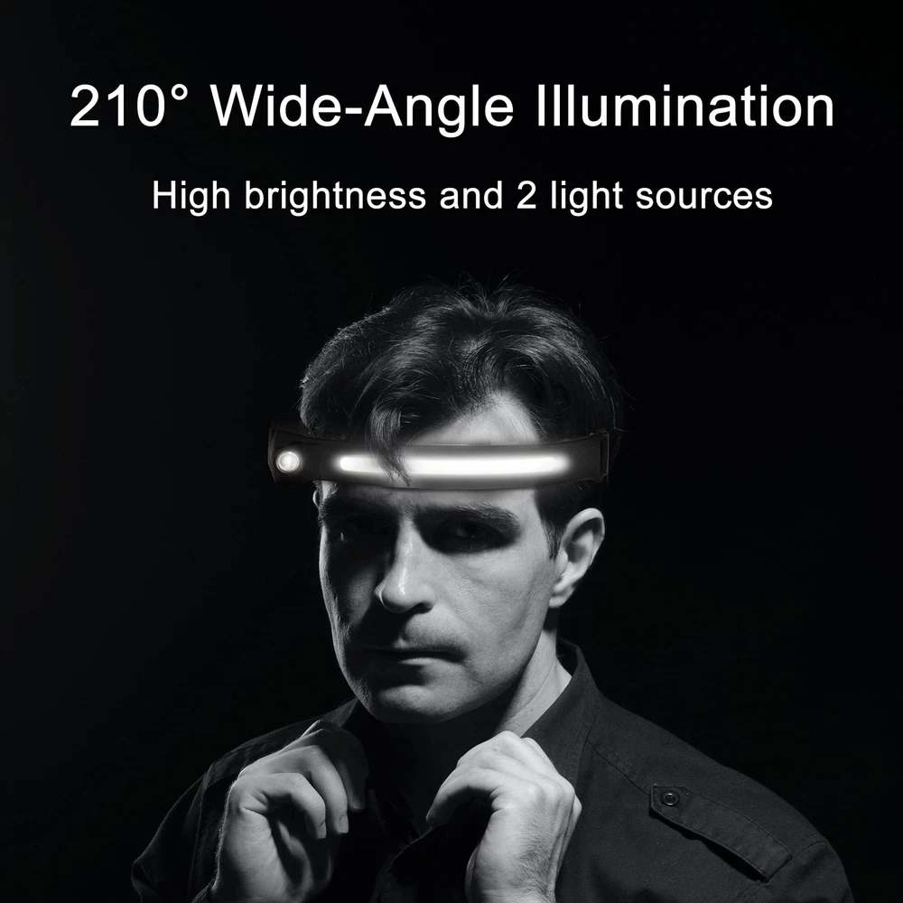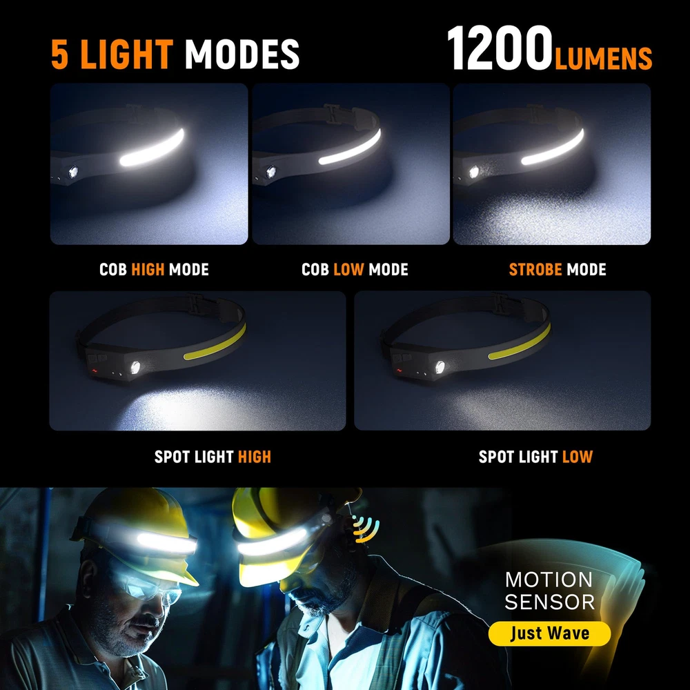 Bright & 230°Wide Beam: Featuring high bright COB and LED light source, this wide beam headlamp offers a 230°wide-angle illumination and 1200Lumens output for maximum brightness. Head Torch has a extra bright LED spot light suitable for a variety of scenarios to meet your various need, for example, night walking, running and biking. 5 Light Modes: The LED headlamp has 5 white light modes: COB High Mode, COB Low Mode, LED High Mode, LED Low Mode and Strobe Mode. In any other mode, long press the On/Off Button to transform the strobe mode, then the LED and COB light will flash at the same time. Rechargeable Batteries: This rechargeable headlamp build in large capacity rechargeable batteries, and micro USB to USB charging cable included. Rechargeable Headlight Flashlight equipped with upgraded input port for a faster charging experience. Charging function not only saves the cost of replacing batteries but can be recycled. Motion Sensor: LED head lamp has a high-quality motion sensor battery. When the sensor function switch is turned on, you can turn on/off the light by just waving your hand within the sensor function range. Whenever and anywhere the switch of lightbar headlamps can bring you convenience and protect the eyes of others whether you are hiking, camping, or mountaineering. Lightweight & Adjustable Headband: The led headband is made of ABS and silicone, it is soft and comfortable, just only 3.5 ounces. It's possible to fold but not affect the use, light weight and small size design can easily fits in your pocket. With soft and washable headband of light band headlamp fits adult. Indoor and outdoor activities used in the waterproof headlights no pressure, especially car repair, DIY work or , etc.