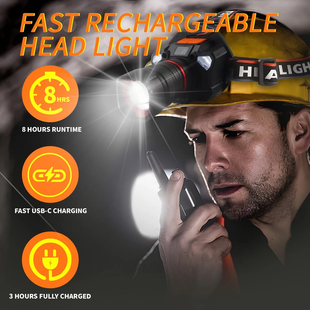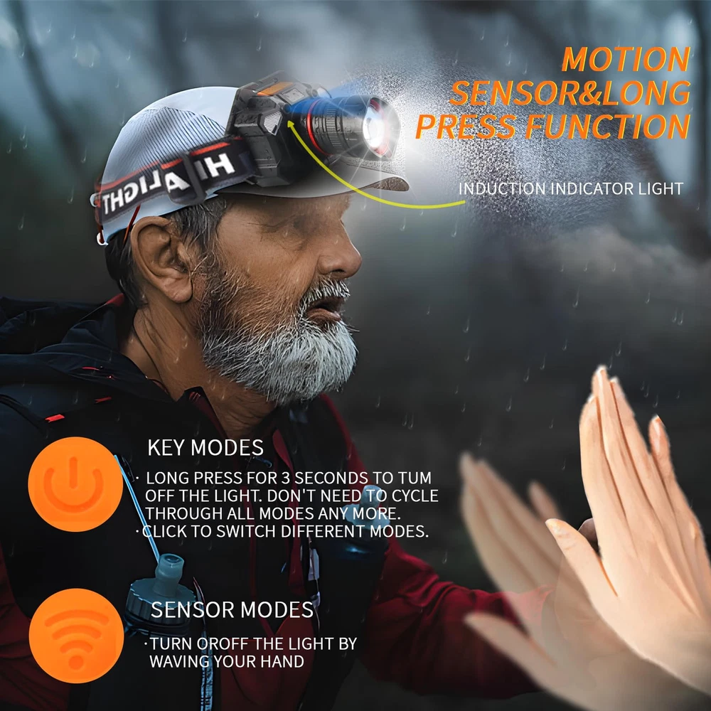 1. Removable Headband: The headlight made of 100% IPX4 waterproof rate materials, it is more sealed, suitable for rain or snow; Comfortable elastic headband, which can easily disassemble and adjust it is the best headlamp choice for outdoor activity 2. Power Display: Our led headlamp with digital display screen, helps you keep track of battery usage, include high beam, low beam, white strobe and red strobe etc 8 different working options, ensure that you can receive stable lighting in any environment 3. Power Bank Design: 2500 mah large capacity build-in battery can be used as an emergency charging bank for your phone and other device, provide you with courage and protection during the adventure process 4. Adjustable Focus And Head: The 100000 lumens rechargeable headlamp's head can 180°spin up and down, illuminate to 500 meters area; Focus adjustment function can achieve145°flood light mode and 25°spot light mode only through push-pull lens 5. Long Press Off Mode: Unlike the most market head light, led headlights has added a long press function, in any mode, if you hold the key mode button for 3 seconds, you can turn off the light directly, no longer need to cycle all modes 6. Motion Sensor Function: It also added motion sensor function mode, you can easily turn the lights ON or OFF by waving your hand, which is more convenient and avoids soiling head lamps when you hand is dirty or the environment is harsh