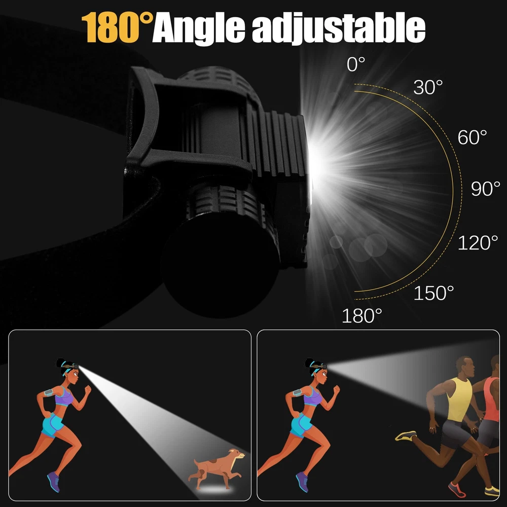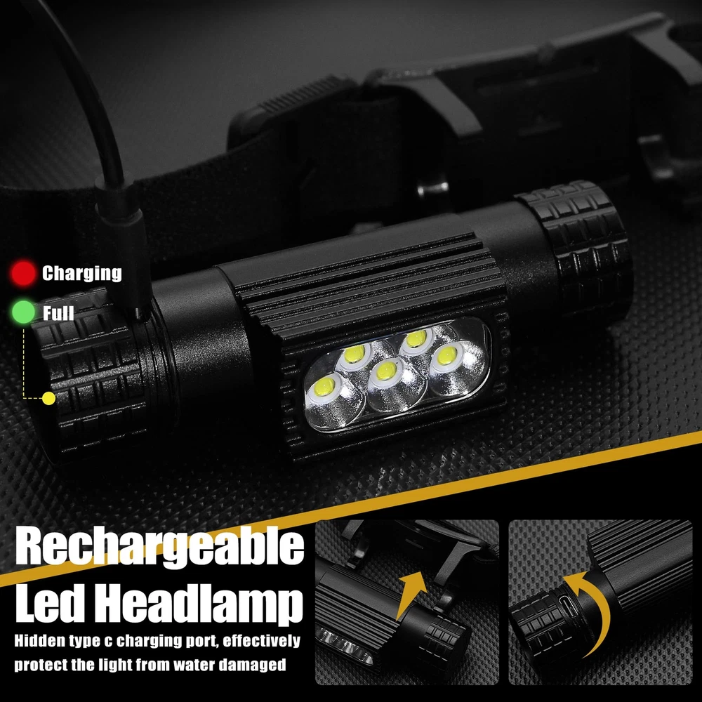 9 lighting modes: This rechargeable headlamp features a high-intensity LED chip that can provide a maximum output of 2000 high lumens and includes 9 lighting modes, including 5 different brightness levels, moonlight mode, and 3 emergency lighting modes - strobe, SOS, and beacon - to meet your different needs. Switching between modes is easy with the press of a button. The headlamp can be adjusted up and down by 180 degrees, with a wide 120-degree illumination range to light your way anytime. Rechargeable LED headlamp: Built-in with a 2600mAh high-capacity rechargeable battery, this headlamp has a long lifespan and supports multiple charging methods, including a hidden TYPE-C charging port that can be charged using a mini USB charging cable (included in the package), making it compatible with laptops, power banks, car chargers, and wall sockets. The red light will turn on while charging and will turn green when fully charged. It can last up to 8 hours after a full charge. Easy to use: With a simple on/off switch, you can easily turn the headlamp on and off without having to go through all the lighting modes. A long press of the switch for 3 seconds can adjust the headlamp to one of five different brightness levels. Quickly pressing the switch twice can activate the emergency lighting modes, and pressing it twice continuously can adjust it to different emergency lighting modes. When the headlamp is off, a long press of the switch can activate the moonlight mode. Versatile application: The adjustable and detachable design of this headlamp makes it perfect for various activities, such as running, camping, repairing, fishing, biking, hiking, and dog walking. Besides its primary use as a headlamp, it can also be used as a handheld flashlight or magnetically attached to metal surfaces for emergency or repair lighting. It can also be used as a safety helmet lamp in industrial settings, making it an essential item for every household. High-quality headlamp: The headlamp body is made of high-strength aluminum material, which is lightweight yet durable. It has undergone four layers of polishing and is combined with a wear-resistant paint layer and a unique hidden charging design. This headlamp is impact-resistant, waterproof, dustproof, and has an IP66 waterproof rating with a built-in circuit protection design that ensures a longer lifespan, providing you with convenience and safety in your daily life.