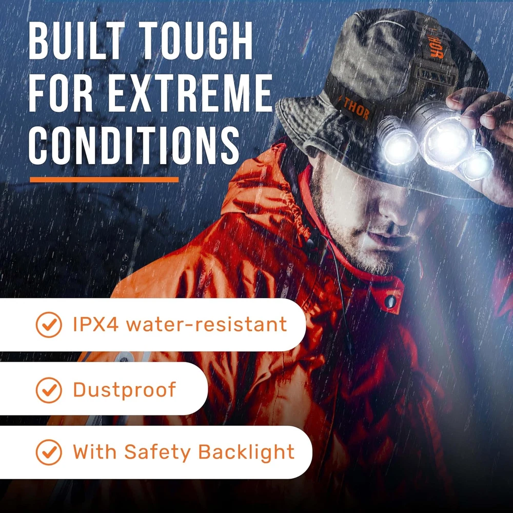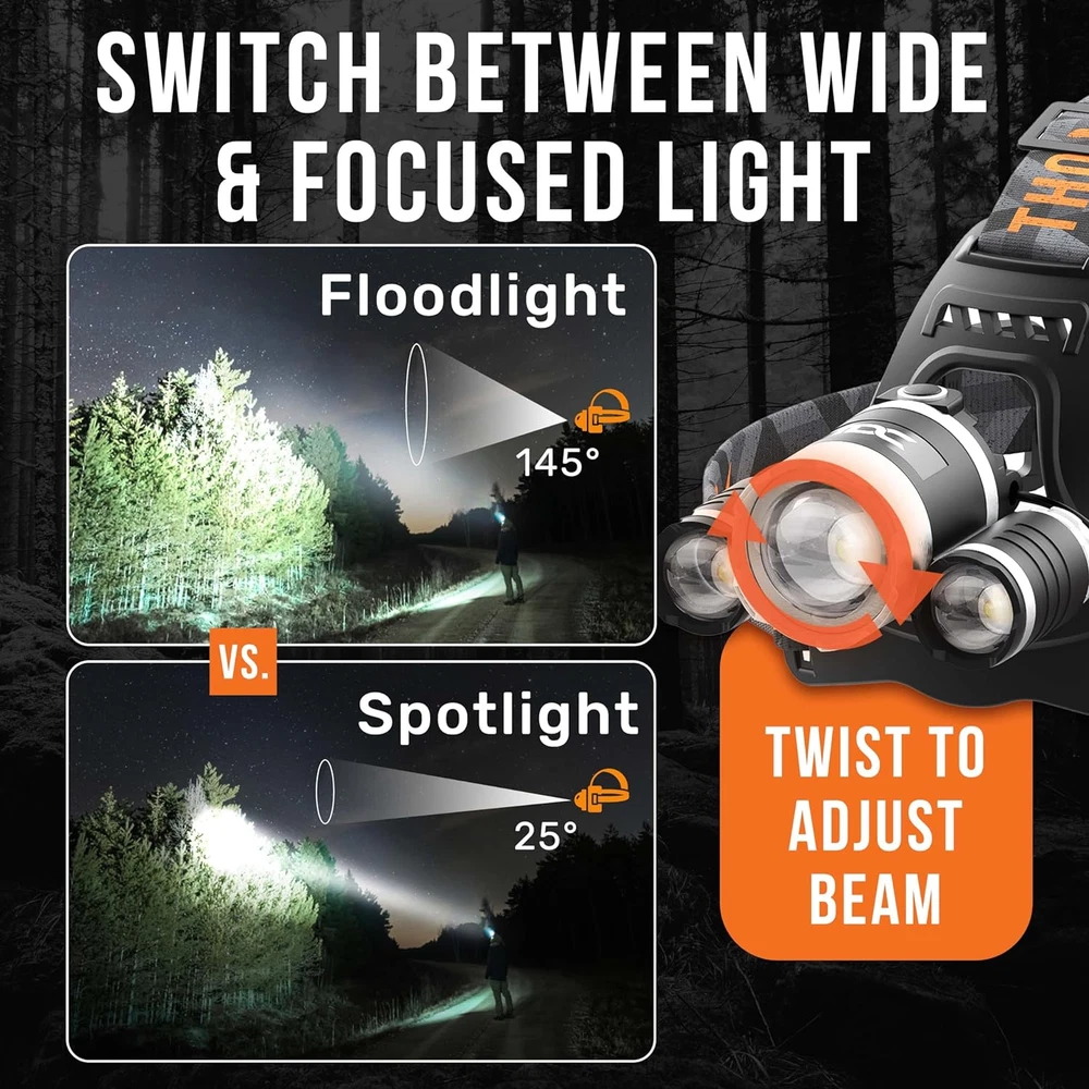 PROFESSIONAL ILLUMINATION: 1080 lumens LED delivers 1000ft beam range, switchable between 145° floodlight and 25° spotlight modes for versatile lighting needs DURABLE CONSTRUCTION: IPX4 water-resistant, dustproof design withstands extreme conditions, ideal for outdoor activities and professional use ADVANCED COMFORT DESIGN: Ultra-lightweight frame with adjustable strap ensures secure fit, perfect for extended wear during night activities EXTENDED PERFORMANCE: 8-hour runtime with fast USB-C charging capability, featuring 4 modes - Low, Medium, High, and Emergency Strobe COMPLETE PACKAGE: Includes rechargeable headlamp, USB-C cable, and 90° rotatable mount - backed by professional customer support With our tactical headlamp your camp and backpacking gear essentials are at their best and you can now cope with any low-light situation. All weather conditions ready thanks to the water-resistant components and strong ABS and alloy aluminium. Forehead light. You can easily light any corners thanks to the 90-degree rotation of the head flashlight headlamp. Outdoors, alone or in company you are always visible. Long range flashlight 500m, Powerful flashlight for Night Hunting and Fishing: you can get a good look at your prey and prepare to do your best. Work in dark environments such as attics and have your hands free to use the tools you need thanks to the super bright headlamp. Great as a hard hat light or bike helmet light and mechanic headlamp. Whether you are working, playing sport or on a vacation. You will always be certain to have a strong and reliable light source that leaves your hands free. linterna de cabeza recargable. Do not irradiate the eyes directly as the bright light of headlights for head could damage the eyes. Avoid using your headlight flashlight during charging. PACKAGE INCLUDES: 1x Headlamp LED, 1x USB Cable, 1x User Manual.