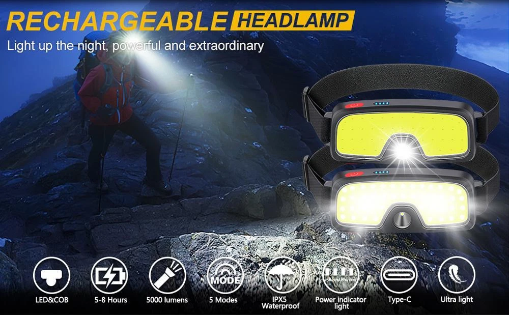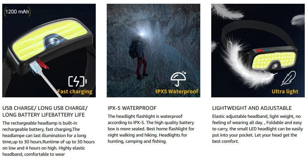 Free and fast shipping , shipping take up 1-7 Business Days 30 Day Return Accepted EASY PAYMENT via PayPal, Credit Card, PayPal Credit, Google Pay... Headlamp USB Rechargeable Battery LED Multicolor Plastic Portable Waterproof COB LED Headlamp USB Rechargeable Power Display Portable Headlight Built in 18650 Battery Camping Head Lamp Hiking Torch Product Features: [High-brightness rechargeable headlight]: This 3 wide-beam LED headlight has a built-in battery. 5000 high-lumen headlights illuminate the darkness in front of you. It can be charged by usb, has a long standby time, and has a battery life of 3.5 hours. No need to waste money to buy additional batteries. [Adjustable and Lightweight]: Elastic adjustable headband, light weight, no feeling of wearing all day. , Foldable and easy to carry, the small LED headlight can be easily put into your pocket. Let your head get the best comfort. [High lumens headlamps 3 lighting modes] Strong / Medium / Low, Rechargeable headlamp can emit large area of floodlights or spotlights. It is safe, reliable and easy to use, it is the perfect flashlight for camping, climbing, hiking, hunting, exploring. [ Power Indication]: The indicator light showing the battery power can easily remind you whether you need the power status headlight Charging can also display the remaining power that needs to be charged. [Waterproof headlights]: Lightweight led headlights, IPX-5 waterproof capability is sufficient to withstand heavy rain from all angles, and can withstand harsh conditions. It is very suitable for running, hunting, camping, fishing, climbing, etc. This lightweight waterproof lamp is your best choice for outdoor sports. [220° wide-angle lighting]: This wide beam headlight has 220° wide-angle lighting, which can cover a large area in the field of view. The high-lumen output light source keeps you away from the dark and provides the largest area ofillumination for your night work to illuminate you Surrounding environment. REVIEWS The product came very well packaged. I'm very happy. thank you for everything. Seller strongly recommended. This is great! I definitely recommend! Product looks amazing Delivery was fast. Excellent seller, great communication. I advise everyone to buy it!