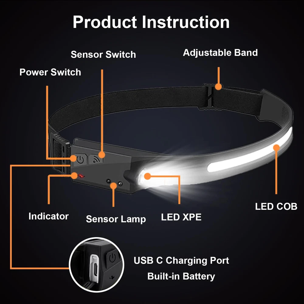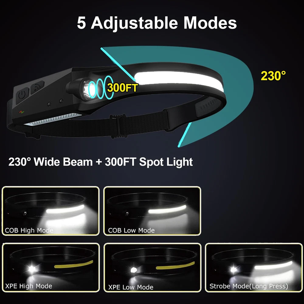 [ 230° Wide Beam & Long-Distance ] LED headlamps with COB strip floodlight can provide 230° wide angle lighting, which allows you to light up the viewing area without moving the head. Equipped with super bright XPE light on the side, headlamp rechargeable can be used as a spotlight to illuminate a distance of nearly 300 feet. [ Motion Sensor & 5 Light Modes ] Head lamps have 5 working modes, including COB high mode, COB low mode, XPE high mode, XPE low mode, and strobe mode to meet all scenarios. The head lamp has sensitive motion sensor, so that you can press the sensor mode button and turn the head flashlight on or off with a wave of your hand. [ Rechargeable & Large Capacity ] Rechargeable headlamp has a built-in 1600mAh high-capacity lithium polymer battery, ensuring long-term use and avoiding the need for constant recharging. LED headlamp rechargeable can be used for 4 - 10 hours in different light modes, and can be fully charged in 2 - 4 hours by the USB C charging cable. [ Lightweight & Adjustable ] Headlights for foreheads rechargeable weight only 2.47 ounces. Headlights for heads can be folded up and placed in your pocket at any time, and you can adjust the elastic headband of the headlight to suit your needs. [ Waterproof & Outdoor ] Head lamps outdoor with IPX4 waterproof can be used safely on rainy or snowy days, making it a great partner for camping, fishing, hiking, and running. If you have any other questions about headlamps for adults, please click “GET HELP WITH ORDER” under your order ID, and we will solve your problem within 24hours.