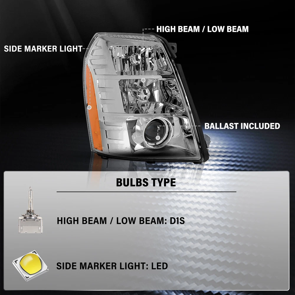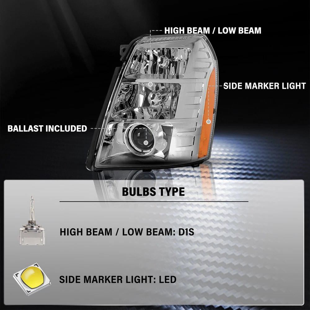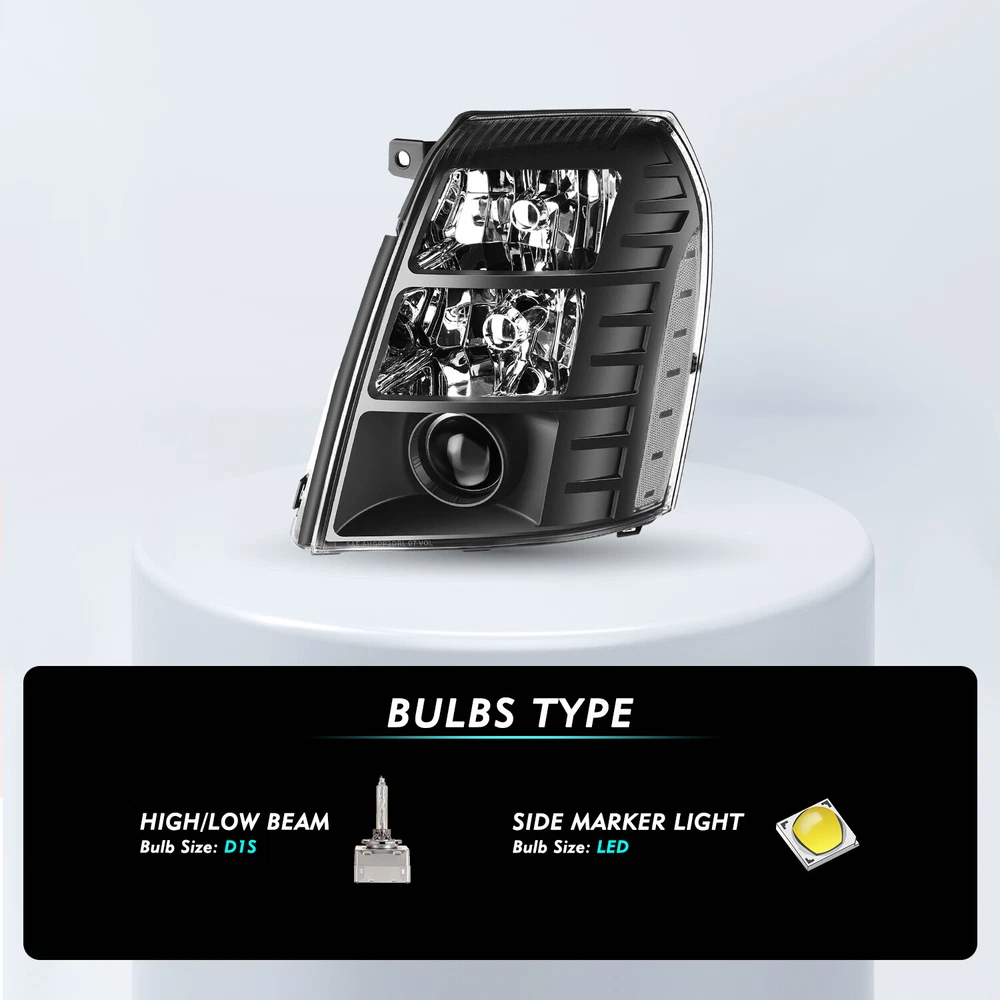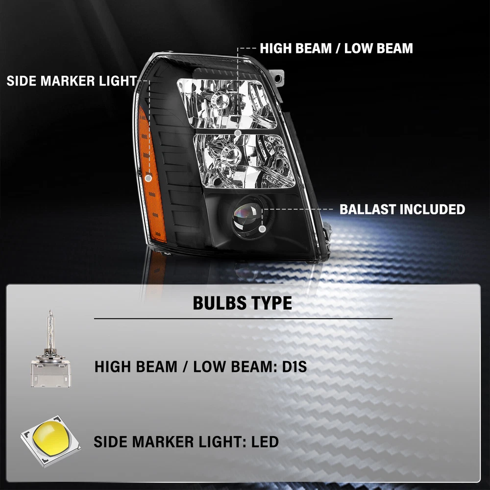 Store Categories Store Categories Other Headlight For 2007-2014 Cadillac Escalade HID Projector w/Ballast&Bulba Product Description Product descri p tion: 1 00% Brand New in Box With Customized Packaging and high-quality he adlight assembly replacement Made by an ISO certified manufacturer using materials that meet strict OEM requirements Unless Otherwise Noted, our Lights Do Not Include Bulbs Direct Bolt On Replacement For Your Original Headlights, No Wiring or Any Other Modification Needed Vehicles Types Compatibility: For 2007-2014 Cadillac Escalade Installation procedure: A. Consult your vehicle manual to know the structure of headlight assembly. B. Find the adjustment screws. C. Adjust the headlights separately. D. Adjust the vertical beam. Screw clockwise to turn the light up. Screw anticlockwise to turn the light down. E. Make sure that the assembly is sealed and then test your results. Package included: 1 Headlights. (Included Ballast and Bulbs not Include DRL Bulb) Payment Policy Shipping Policy Returns Policy Contact us Feedback Payment Policy We accept PayPal and all forms of credit card. Shipping Policy 1.We ship package directly from our CA warehouse by UPS Ground(2-5working days) or FedEx Ground(2-5working days).If you want to choose faster shipping way like Overnight Shipping.Please contact us ASAP. 2.The Item will be sent to the buyer's address registered in PayPal ONLY. If the address is not correct, please make alternation before you pay. 3.Tracking number will be provided. 4.Inspect all item upon arrival, if you found the item broken or defective, please notify us within 7 days. No claim will be accepted after 7 days. Returns Policy In the event that you would like to return your purchase, we allow returns that are processed within the defined return date (the return date is to be found in the return policy/shipping and handling section) The item must be return in good condition with original packaging and accessories, and never installed or mounted. Contact us Note: If u have any problem, complaint, advise, please give us eBay message First Before Any Feedback. We will reply your message and solve your problem during working time(Except Holiday)ASAP. Feedback Customer satisfaction is very important to us. If you have any problem with your order,please contact us and we will do our best to make you satisfied, please do not leave a negative feedback before we resolve your problem.We guarantee that your issue will be solved quickly. As long as you are happy with your purchase of , please leave us a positive feedback.Your feedback is very important to us it affects our search placement on eBay. We will leave a positive feedback for you in return automatically once we receive your feedback. Copyright © 2023 Dianxiaomi