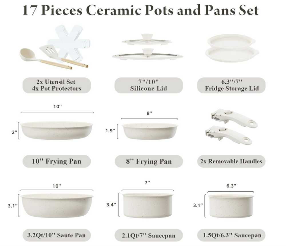 Material Aluminum Color Cream White Brand bazova Size 17-Pieces Ceramic Set Is Dishwasher Safe Yes About this item Healthy Ceramic Coating: Made of natural ceramic, our kitchen cookware set is Teflon-free and guarantees no PFAS, PTFE, PFOA, lead, or cadmium. Ideal choice for safety-conscious families, especially those with babies Effortless Storage: Save 70% kitchen space by neatly stacking pots and pans in cabinets or drawers; perfect for compact spaces, RVs and campers Innovative Detachable Handles: Transform pots with a "CLICK" into baking dishes, serving plates, or fridge storage, enhancing versatility. NOTE: The handle is made of bakelite and silicone, overheat will cause discolor or even burnt.Please detach it when you are not using it for fixing. Ultra Non-Stick Performance: Experience 5X superior non-stick cooking with minimal oil - food just slides off smoothly.No toxic fumes emitted, even when overheated. NOTE: using oil spray will damage the coating. Just add a small amount of butter or oil will be enough.Low to medium heat is suggested for better non stick performance. Easy Cleaning: While our cookware is dishwasher-safe for your convenience, we highly recommend handwashing. A simple rinse or quick wipe effortlessly removes any residue, ensuring your cookware remains spotless and maintains its pristine condition with ease Universal Cooktop Compatibility: Enlarged, thickened magnetic base ensures compatibility with all stovetops, including induction and oven; Crafted from recyclable aluminum ensures lightweight yet sturdy, and promotes rapid and even heating 17-Piece Set Includes: 1.5QT(6.3") & 2.1QT(7") saucepans, 8-inch & 10-inch frying pans, 3.2QT(10")sauté pan, 2 removable handles, 7-inch & 10-inch glass lids, 6.3-inch & 7-inch fridge lids, 4 pot protectors, silicone slotted turner & ladle Seamless mobility with a click – the removable handles provide flexibility, effortlessly transitioning cookware from stoves to the oven, grill, fridge, and finally to the dinner table. Servers as a frying pan, a dinner plate From Stove, To The Table Unlock the boundless potential of the cookware with its detachable handle – perfect for cooking on any stovetop or serving as elegant dinnerware on the table. or even a fridge container To The Refrigerator Store leftovers in the fridge with the included lids to minimize waste. Save 70% Space - Our cookware set is designed for perfect stacking in kitchen drawers, cabinets, cupboards, RVs, travel trailers and motorhomes. Important Tip- We suggest to detach the handle during cooking when you don't need it for fixing. This could greatly extend the lifespan of the handle. Ultra Smooth & Nonstick Easy Cooking Smooth interior makes it exceptionally nonstick - perfect for everyday cooking like pancakes, eggs, steaks, and fish. Please notice high temperature will damage the non stick coating. Clean with 5 Sec. Easy Cleaning Rinse or wipe clean - zero residue in 5 seconds. Alternatively, toss it in the dishwasher for time-saving convenience. Please notice disherwasher could damage the non stick coating in some conditions. Oven Safe Detach the handle for oven use. Let's whip up a delicious frittata! All Stoves Compatible Feature an enlarged and thickened bottom for rapid and even heating. The magnetic conductive bottom ensures compatibility with all stovetops, including induction. Sustainability features This product has sustainability features recognized by trusted certifications. Carbon impact Carbon emissions from the lifecycle of this product were measured, reduced and offset. As certified by ClimatePartner certified Product information Material Aluminum Color Cream White Brand bazova Size 17-Pieces Ceramic Set Is Dishwasher Safe Yes Material Type Free Cadmium Free, Perfluorooctanoic Acid (PFOA) Free,Perfluorooctane Sulfonate (PFOS) Free, PFAS Free, Polytetrafluoroethylene (PTFE) Free, Lead Free Compatibility Options Compatible Number of Pieces 1 Closure Material lid Included Components 1.5QT(6.3") & 2.1QT(7") saucepans, 8-inch & 10-inch frying pans, 3.2QT(10")sauté pan, 2 removable handles, 7-inch & 10-inch glass lids, 6.3-inch & 7-inch fridge lids, 4 pot protectors, silicone slotted turner & ladle Is Oven Safe Yes Item Volume 2.95 Liters With Lid Yes Manufacturer bazova UPC 199284844407 Manufacture Year 2024 Special Feature Induction Stovetop Compatible Package Dimensions 12.48 x 11.85 x 6.77 inches Item Weight 9.31 pounds ASIN B0CRSZ9MC5 Country of Origin China Item model number BZ101