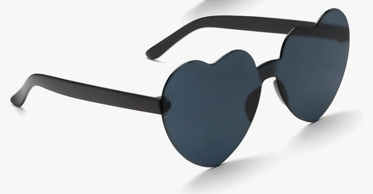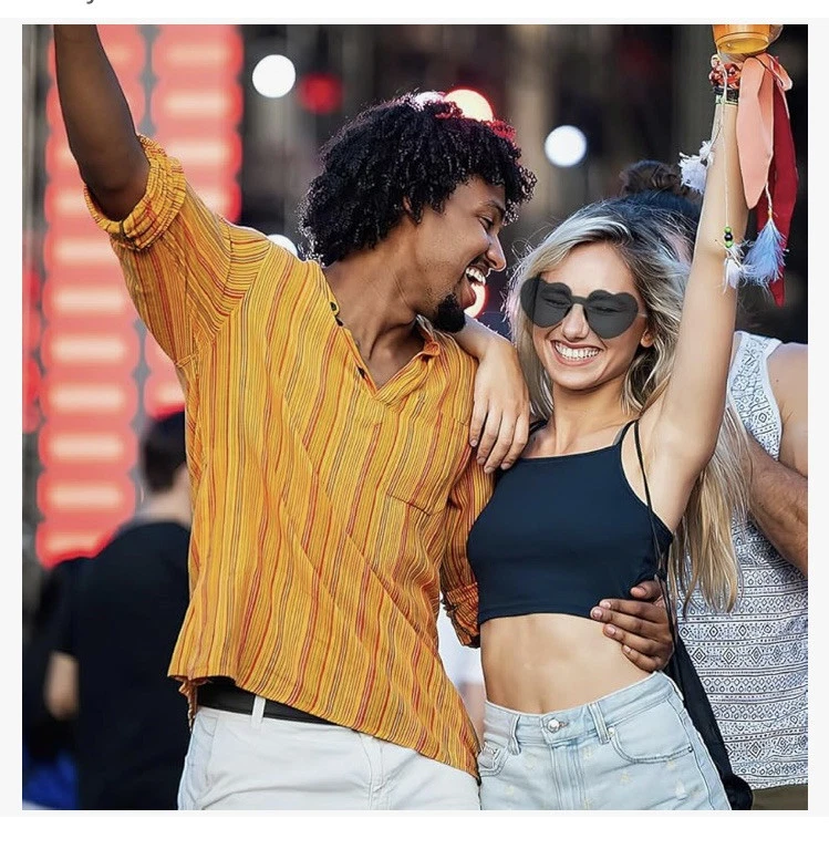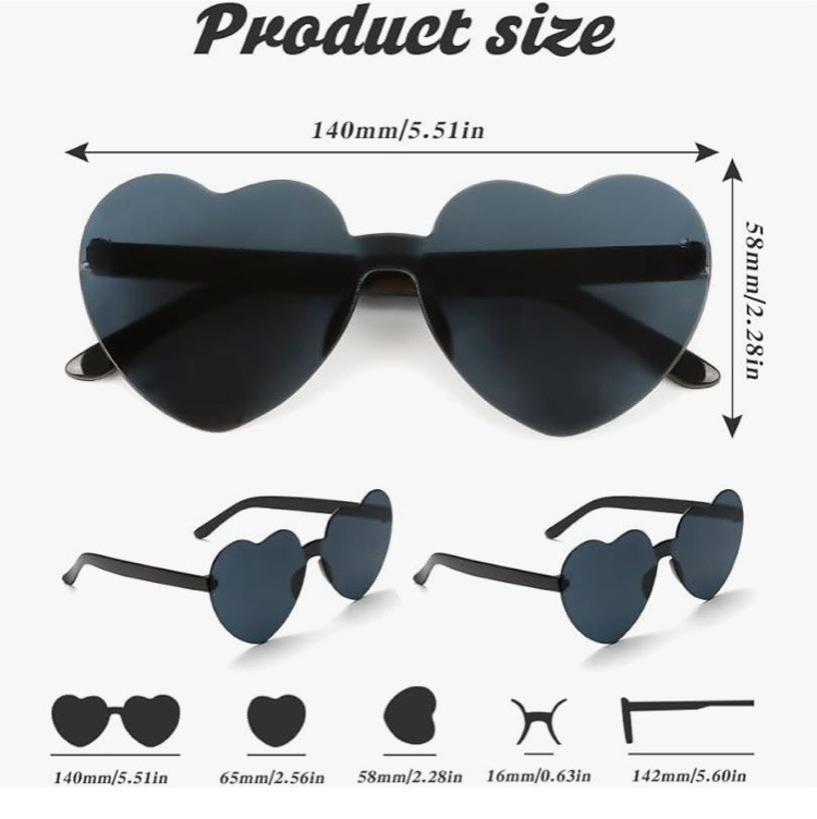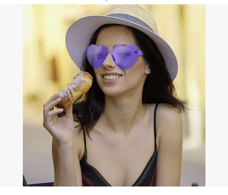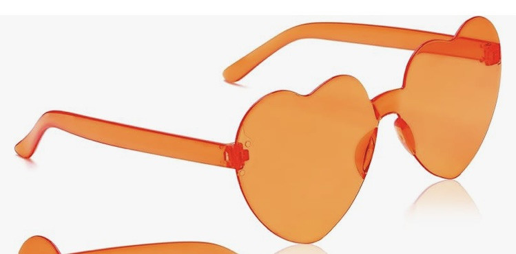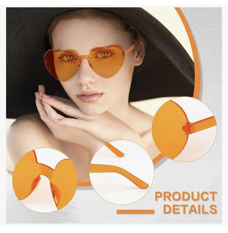 These are a set of three heart-shaped party sunglasses in purple, orange, and gray colors. The frame is transparent with a multicolor heart design, perfect for women's accessories. The lenses are made of plastic, making them suitable for a fun and stylish look. Perfect for adding a playful touch to your outfit.