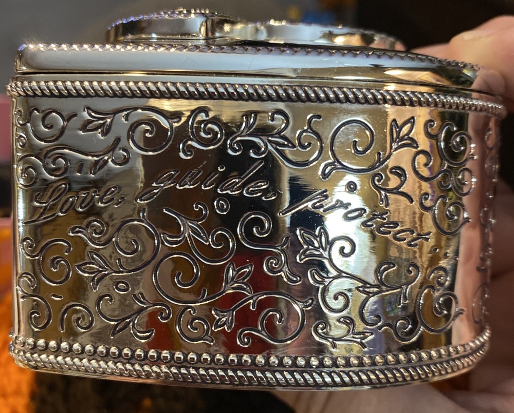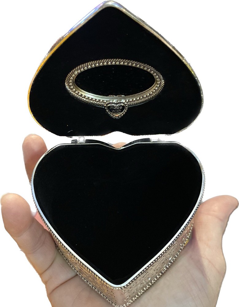This is a heart-shaped jewelry box from Things Remembered, featuring an angel design. The box is made of silver metal with a glossy finish and velvet interior. It is small in size, measuring 3.5 inches in length and 2 inches in height. The keepsake box is adorned with hearts and is suitable for all occasions, making it a thoughtful gift for adults. The jewelry box was in its gift box when both survived a house fire. The jewelry box is still brand new, however the box I’m sending it in (which has the heart shape cut into it for perfect fit) was in the house, but far enough from the fire to not burn up, yet, it did receive soot stains & looks dirty. It is perfectly clean inside. You will probably want to remove the jewelry box & toss the gift box it sits in, upon delivery. The jewelry box has never been used.