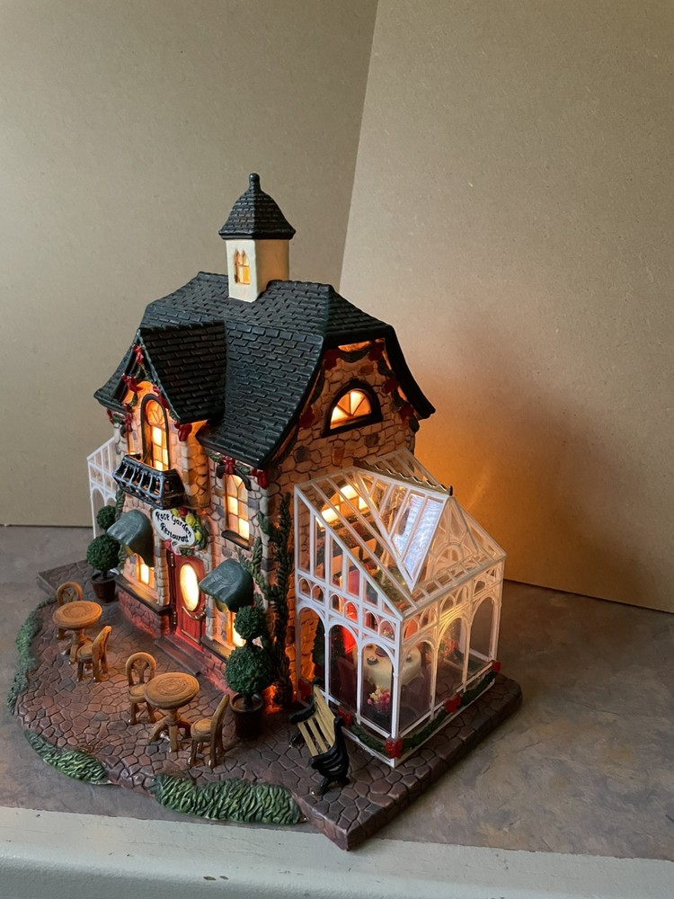 Heartland Valley Village ROSE GARDEN RESTAURANT is a limited edition 2004 O'Well Christmas lighted house. This house is in excellent condition to add to your collection! The Rose Garden Restaurant features a cobblestone building decorated with pine boughs and red ribbon with glass sunrooms on both ends with hanging wreaths and tables and chairs. Handmade and boxed, it measures 10" in length, 8 3/4" in height, and 6 1/2" in width. Perfect for Christmas decor, it is suitable for any room and weighs over 4 lbs. Please note that the styrofoam packing is in good condition but the box is torn and taped.