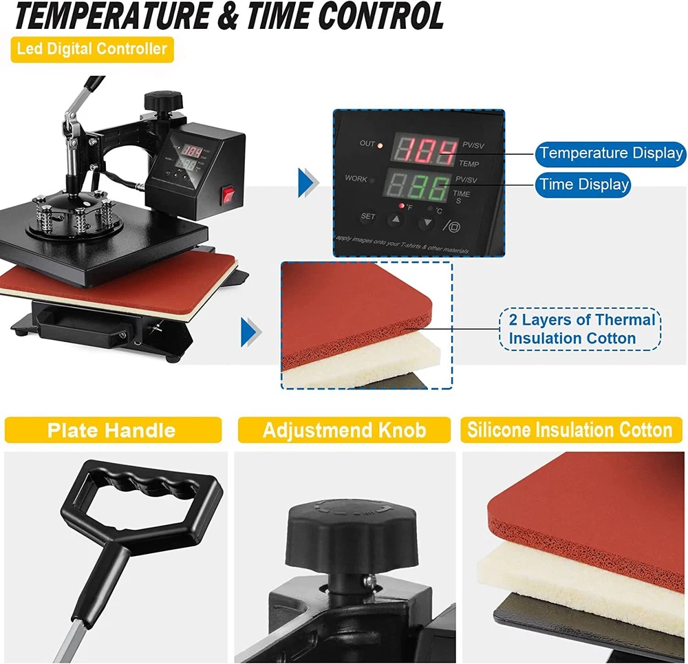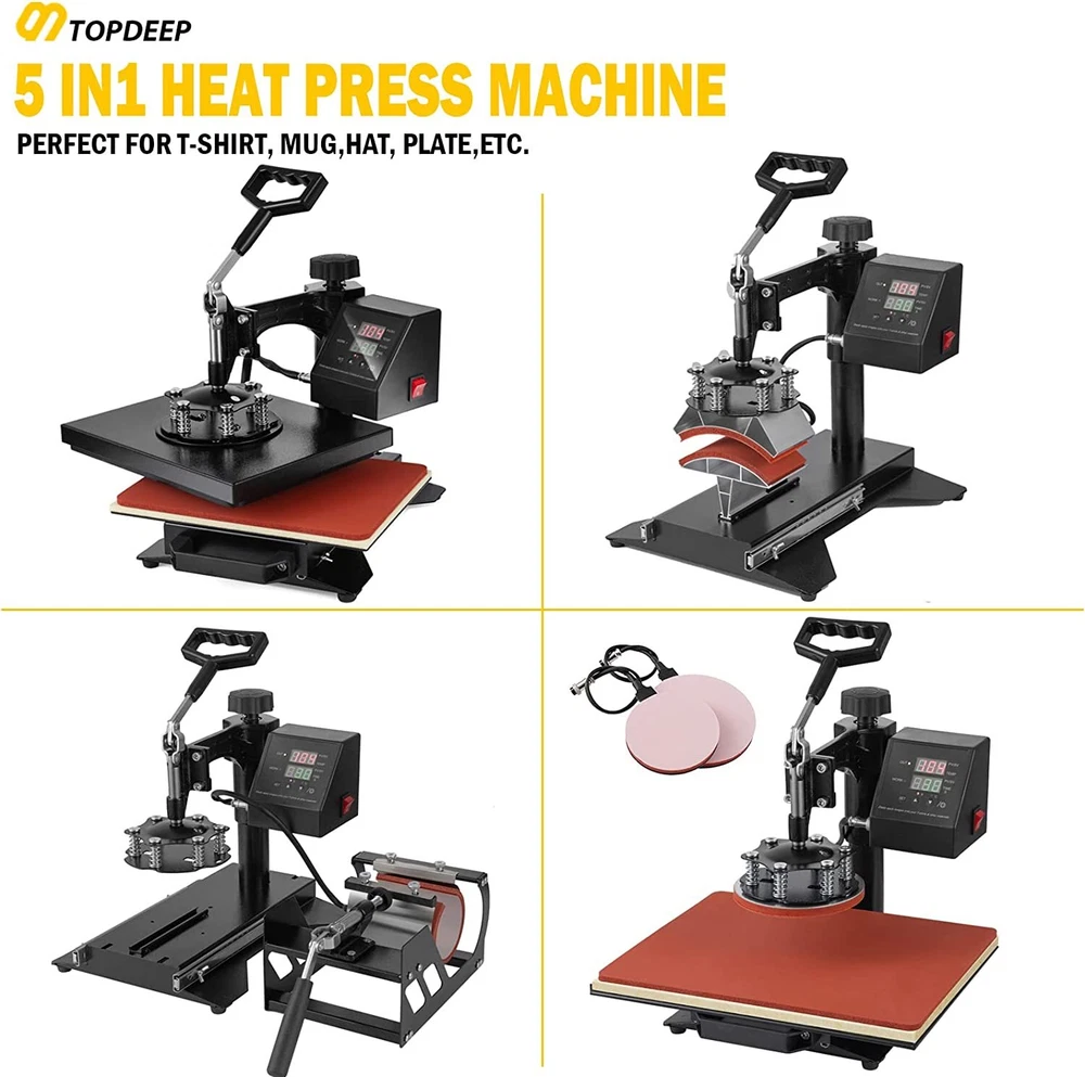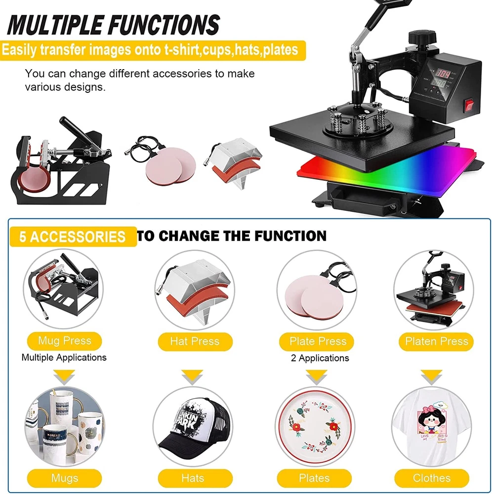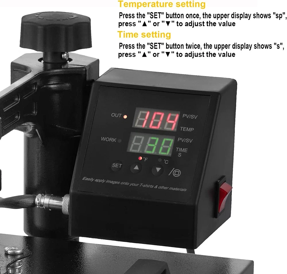 For more information on our products Please send message to us Why Choose Us 5 In 1 Digital Heat Press Machine Sublimation For T-Shirt/Mug/Plate Hat Printer eBay Best Seller, Large Quantity Sold, Commercial Warranty Fast Shipping USA Stock, United States Wide Trusted Seller 12 Months Warranty 60 Days Return Policy (conditions apply) Customer Feedback What Customers Have To About Us "Just As It Says, Got here fast. Have not used yet. Can't wait to use it" n***3(155) "Item was received quickly and was exactly as described. THANKS to a great Ebayer" s***1( 283) "Fast shipping and very good communication!" h***r "excellent, very good seller" r***a( 107) "5++ Stars the product works wonders" m***w( 93) "Great seller to work with. Extremely professional, takes care of cust. AAA+" j***8(15) "Item as described!!!!!! Thank you!!" d***s(115) "Fast ship would buy from seller again" p***4(198) Picture Description This 5 in 1 heat press machine with 2in1 digital controller is out now. This swing-away heat press boasts all of the must-have attachments. This includes flat platen, mugs and plates. It can transfer colorful pictures and characters of sublimating and dissolved printing ink onto ceramics, glasses and textiles such as cotton, flax, chemical fiber, nylon, etc. This all-in-one press can be used for T-shirts, caps, ceramic plates, ceramic tiles, mugs, coasters, mouse pads, jigsaw puzzles, lettering, other misc. fabrics & materials. Temperature setting: Press “SET”, the upper display will showing “SP”, and the lower of display will showing the temperature of last setting. Then enter into temperature setting option, press ▼ or ▲ (increase or decrease) to set the needed temperature. After setting well, please press “SET”, the upper display will show “SK” to go on the next step for time setting Time setting : Press “SET” again, H1 LDE will showing “ST”, then enter into the time setting. Press ▼ or ▲ (increase or decrease) to setting the needed time. (Normally the time is 180 seconds for mugs and 15-20 seconds for t shirt printing) Fault diagnosis and solution : 1. If the controller box showing nothing when power on, there are 2 solutions: a. Please check the fuse wire, checking the glass wire to see if the wire damaged or fusing, if damaged, please change the wire. b. open up the back cover of controller box, and examine the electricity box,to see if some thread fall off or not, if fall off, please match it accordingly. 2. When power on, if the controller display showing 3 lines, please take out the heating platen, and replaced it with another heating panel, or mug heater. If the display is normal, then maybe is the second situation of “b”, the thread wire were disconnect. If still showing 3 line, then is the first situation of “a”, the socket wire were fall out or break. a. Checking the inner wire of controller box, the white metal socket with 4 lines, please check if the thread is break or disconnect, if disconnect, please match it accordingly or replace it. b. Checking the wire of heating panel , the red cycle is showing the ends of the cable, one end is 3 thread, please replace 2 thread will be okay. 3. When power on, the controller box showing values but cannot heating up: the display showing the actual room’s temperature, please takes out the plug of head machine, and replaced it with other mugs heater or plate heater. If temperature is heating up normally, then will be the next situation “a”, if cannot heat up, will be “b”situation. a. Checking the heating wire, the red cycle showing the ends of thread, please replace the white thread will ok. b. Open up the back cover, and examine the thread to see if some thread disconnected or break, if disconnected, please follow the above “a”, if nothing showing, please following “b” to maintenance. If no break, then replace the controller box. 4. The head controller box heating up normally, the other parts will be not heating up, please change the heating part directly. 5. The head machine’s function is ok, but cannot count down, then please press the third button, this machine will count down. If still cannot count down, please replace the controller box. Application : This heat press machine enjoys multifunctions in one machine, it can be used for transferring on t-shirt, mug, plate, cap and so on. Moreover the heating accessory can be joined. You can replace the heating plate easily and conveniently without using any special tools. Advanced Characters: Fahrenheit and Celsius scale are selectable Adjustable multi-spring balancer Allows pressure to be more evenly distributed across the entire platen when it is closed 4/5" thick heating board Built-in structural support to maintain flatness Warm up quickly Offers even heating Upgraded aluminium alloy cradle Detached cradle for use of the mug elements Compact size and lightweight, as compared to standard mug cradles Press O bject I nitial T emperature H ighest T emperature P roper H eating T ime Mugs 230 360 30 Tiles 230 360 30 Metal board 230 360 30 Plate 230 360 40 T-shirt 230 360 Sublimation paper: 20~30 sec Specifications Condition Brand New Power input 110v(USA Plug) Wattage 900W Temperature range 32 - 430 Fahrenheit degree (0 - 250 Centigrade) Timer control 0 - 999 seconds Cord length 4.5" Adjustable height 13 1/2" to 17" Platen Press (telfon-coated) 12" x 10" Hat/Cap Press 6"x 3"( curved ) Plate Press #1 5" max diameter Plate Press #2 6" max diameter Mug Press 3"-3.5" diameter ( 11oz ) In The Box Fully-assembled machine with platen press x 1 Hat press x 1 Mug press x 1 Plate presses x 2 Silicone pad x 1 Cotton pad x 1 Manual x 1 Feature Brand new 5 in 1 heat press machine Large 12" x 10" transfer element Provides a big surface to create your own custom T-shirt Digital LED controller Temperature: set the desired temperature Timer: set the desired time Intelligent audible alarm after the transfer done Full 360-degree rotation of swing-away