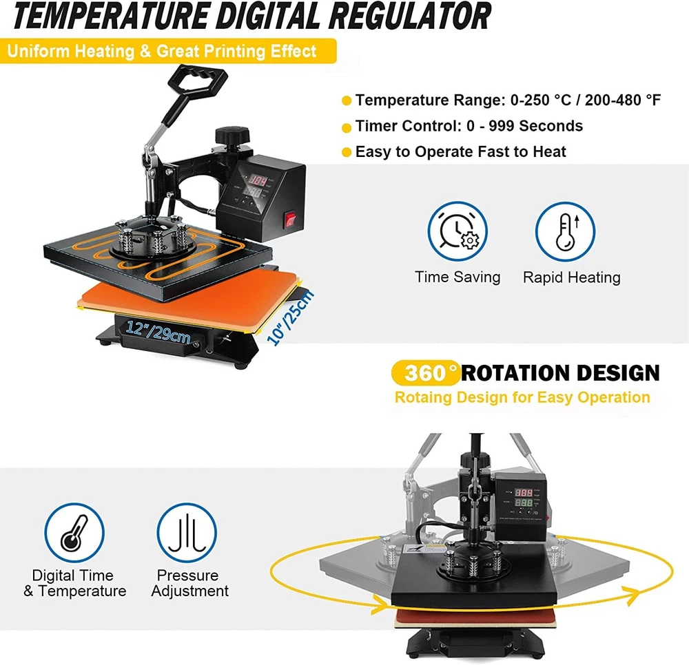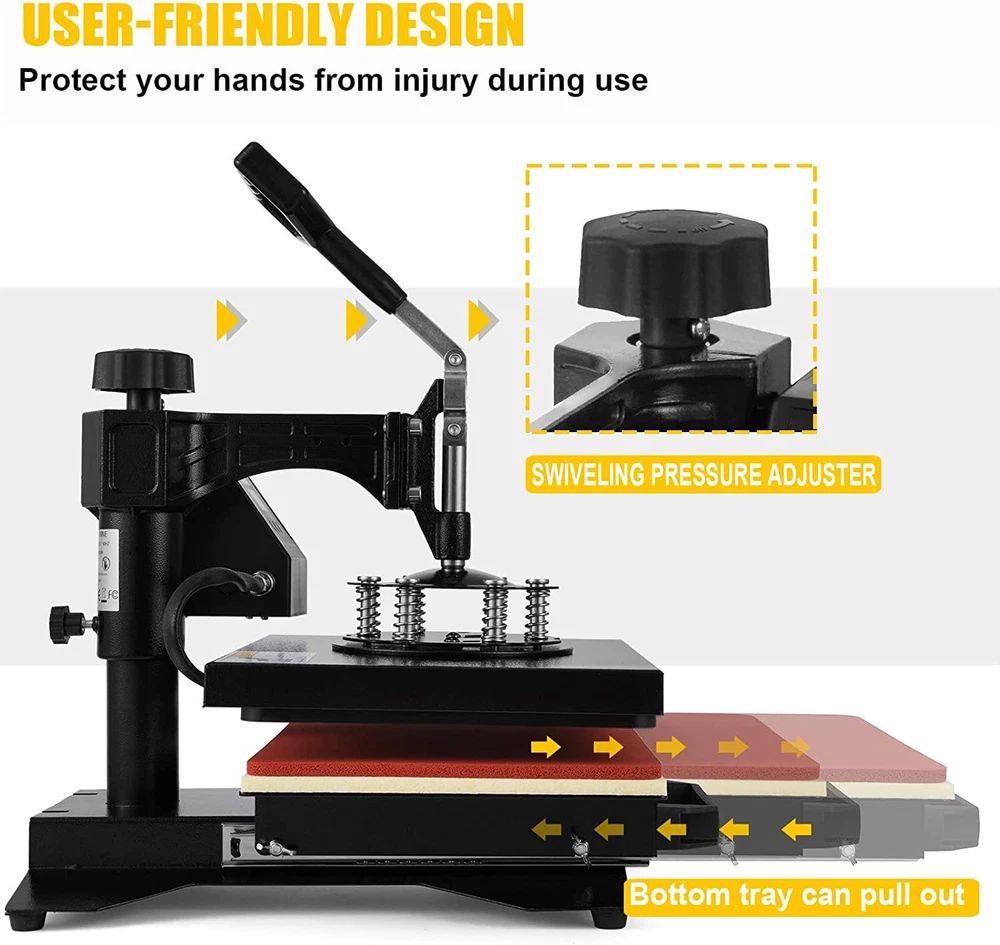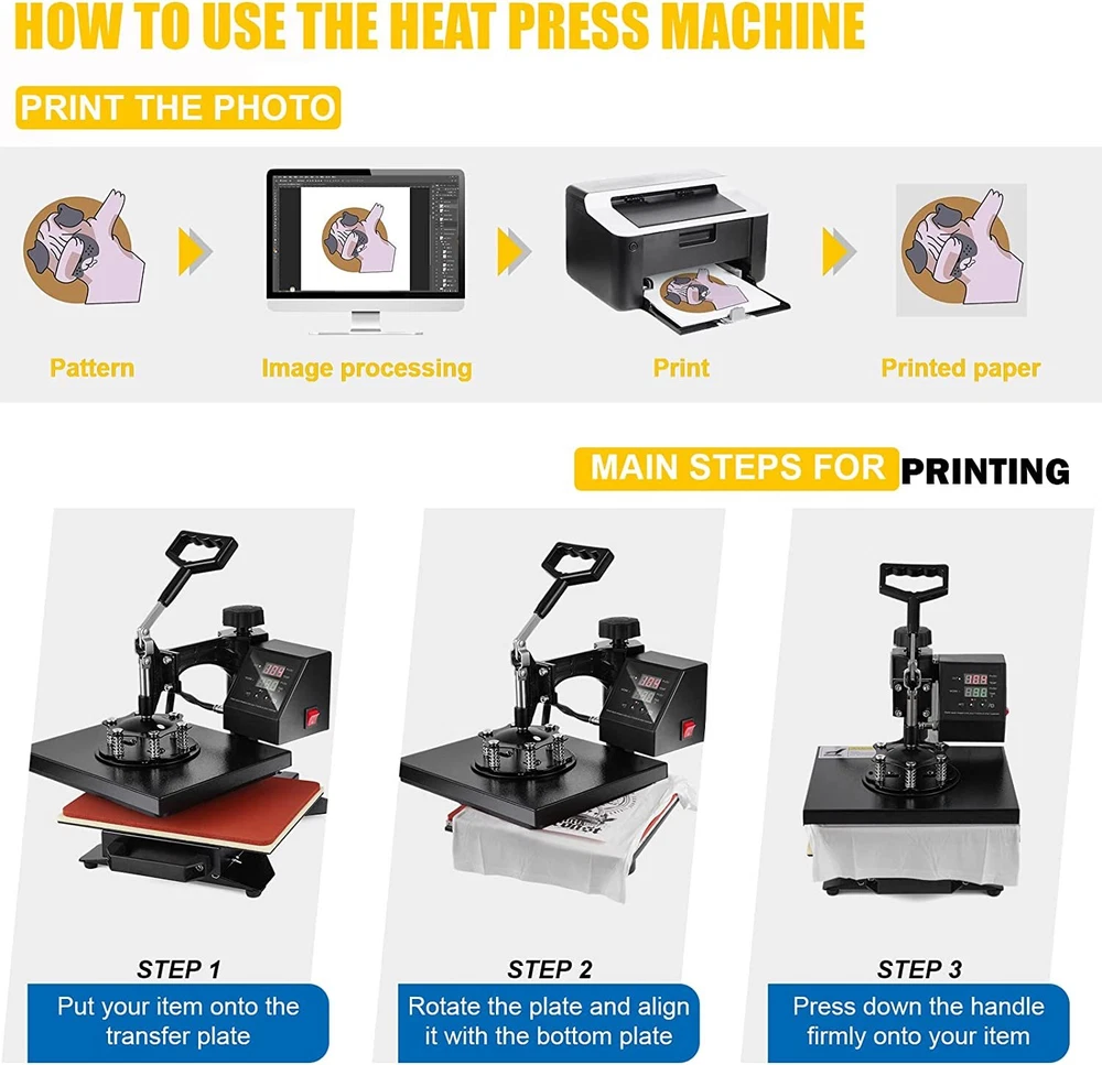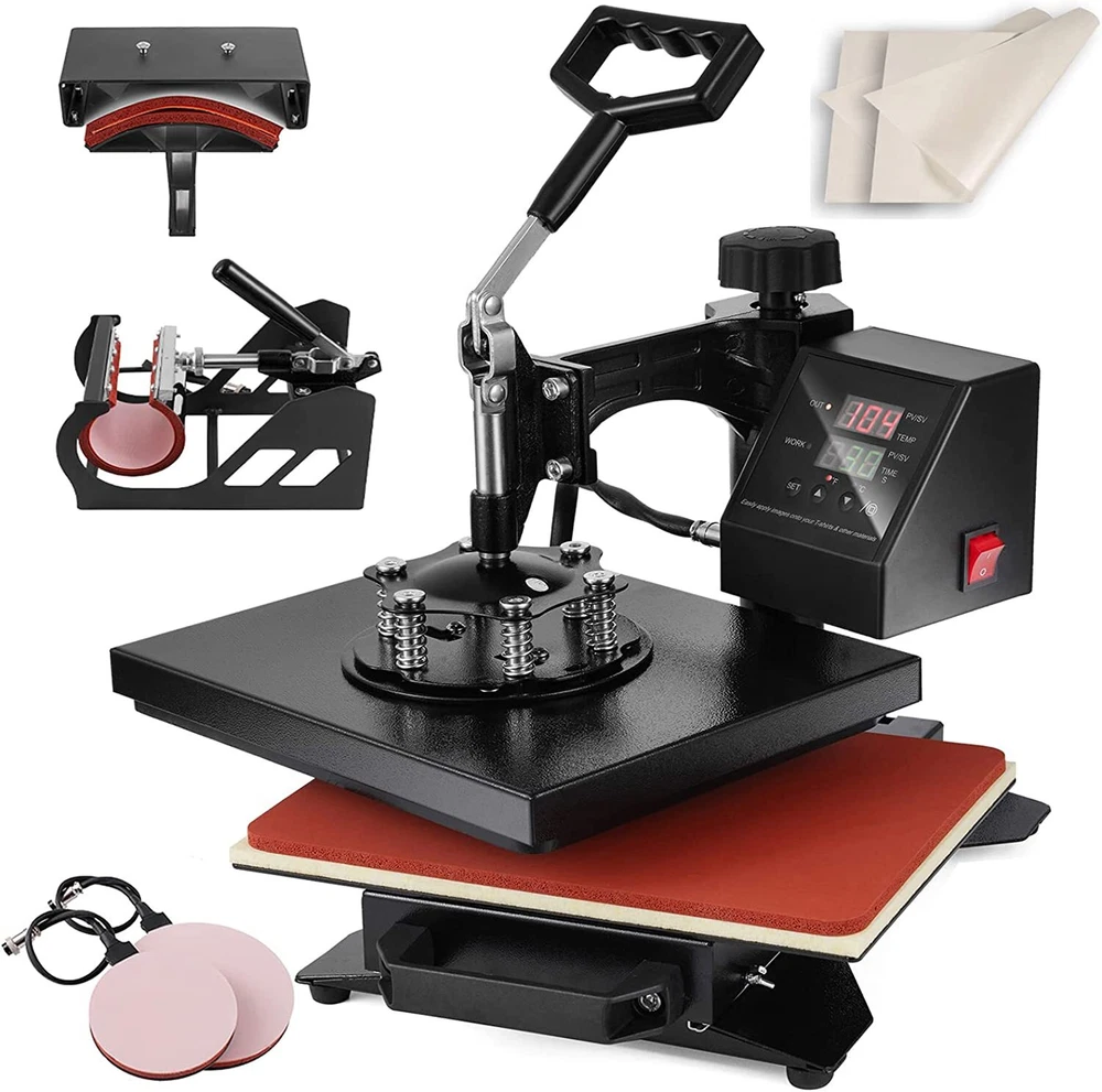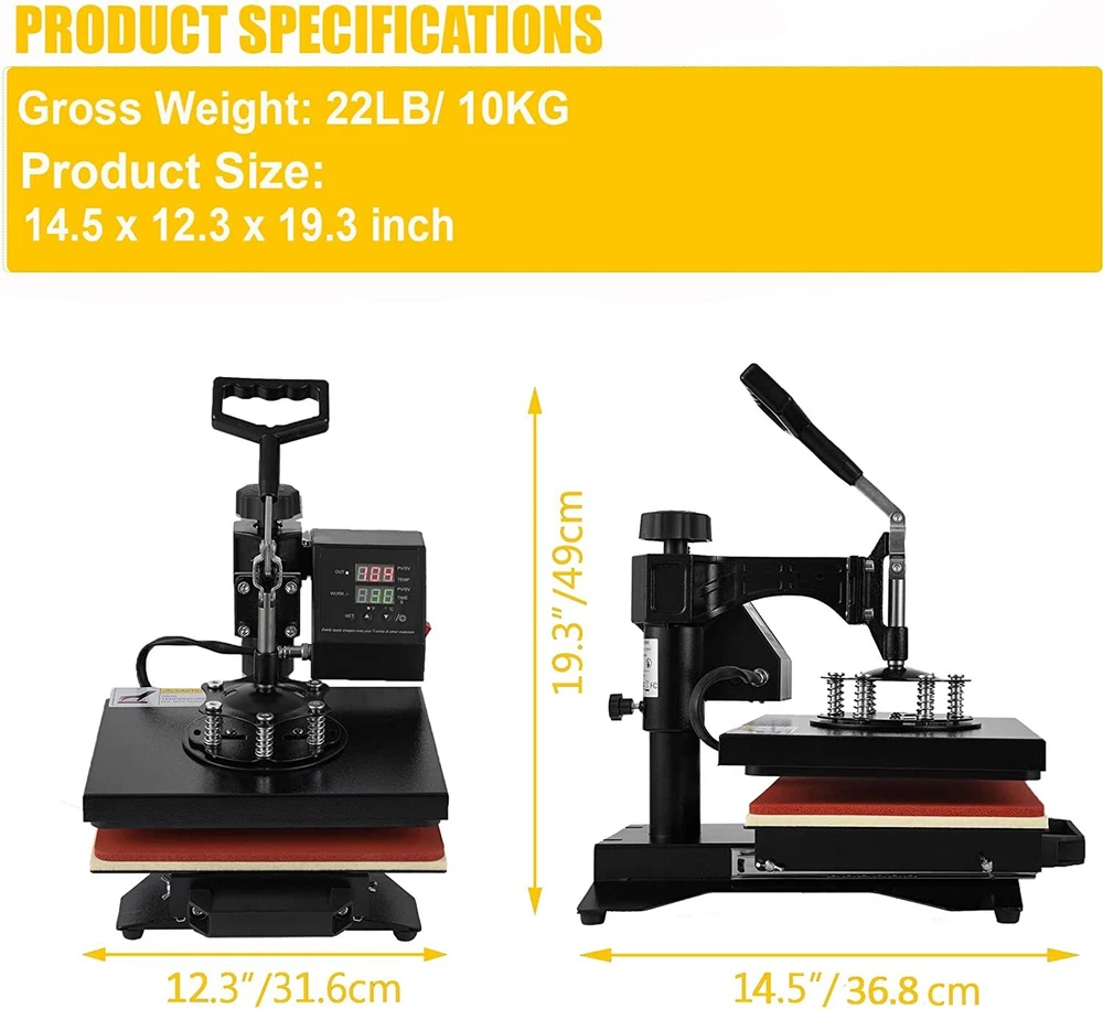 For more information on our products Please send message to us Why Choose Us 5 In 1 Digital Heat Press Machine Sublimation For T-Shirt/Mug/Plate Hat Printer eBay Best Seller, Large Quantity Sold, Commercial Warranty Fast Shipping USA Stock, United States Wide Trusted Seller 12 Months Warranty 60 Days Return Policy (conditions apply) Customer Feedback What Customers Have To About Us "Just As It Says, Got here fast. Have not used yet. Can't wait to use it" n***3(155) "Item was received quickly and was exactly as described. THANKS to a great Ebayer" s***1( 283) "Fast shipping and very good communication!" h***r "excellent, very good seller" r***a( 107) "5++ Stars the product works wonders" m***w( 93) "Great seller to work with. Extremely professional, takes care of cust. AAA+" j***8(15) "Item as described!!!!!! Thank you!!" d***s(115) "Fast ship would buy from seller again" p***4(198) Picture Description This 5 in 1 heat press machine with 2in1 digital controller is out now. This swing-away heat press boasts all of the must-have attachments. This includes flat platen, mugs and plates. It can transfer colorful pictures and characters of sublimating and dissolved printing ink onto ceramics, glasses and textiles such as cotton, flax, chemical fiber, nylon, etc. This all-in-one press can be used for T-shirts, caps, ceramic plates, ceramic tiles, mugs, coasters, mouse pads, jigsaw puzzles, lettering, other misc. fabrics & materials. Temperature setting: Press “SET”, the upper display will showing “SP”, and the lower of display will showing the temperature of last setting. Then enter into temperature setting option, press ▼ or ▲ (increase or decrease) to set the needed temperature. After setting well, please press “SET”, the upper display will show “SK” to go on the next step for time setting Time setting : Press “SET” again, H1 LDE will showing “ST”, then enter into the time setting. Press ▼ or ▲ (increase or decrease) to setting the needed time. (Normally the time is 180 seconds for mugs and 15-20 seconds for t shirt printing) Fault diagnosis and solution : 1. If the controller box showing nothing when power on, there are 2 solutions: a. Please check the fuse wire, checking the glass wire to see if the wire damaged or fusing, if damaged, please change the wire. b. open up the back cover of controller box, and examine the electricity box,to see if some thread fall off or not, if fall off, please match it accordingly. 2. When power on, if the controller display showing 3 lines, please take out the heating platen, and replaced it with another heating panel, or mug heater. If the display is normal, then maybe is the second situation of “b”, the thread wire were disconnect. If still showing 3 line, then is the first situation of “a”, the socket wire were fall out or break. a. Checking the inner wire of controller box, the white metal socket with 4 lines, please check if the thread is break or disconnect, if disconnect, please match it accordingly or replace it. b. Checking the wire of heating panel , the red cycle is showing the ends of the cable, one end is 3 thread, please replace 2 thread will be okay. 3. When power on, the controller box showing values but cannot heating up: the display showing the actual room’s temperature, please takes out the plug of head machine, and replaced it with other mugs heater or plate heater. If temperature is heating up normally, then will be the next situation “a”, if cannot heat up, will be “b”situation. a. Checking the heating wire, the red cycle showing the ends of thread, please replace the white thread will ok. b. Open up the back cover, and examine the thread to see if some thread disconnected or break, if disconnected, please follow the above “a”, if nothing showing, please following “b” to maintenance. If no break, then replace the controller box. 4. The head controller box heating up normally, the other parts will be not heating up, please change the heating part directly. 5. The head machine’s function is ok, but cannot count down, then please press the third button, this machine will count down. If still cannot count down, please replace the controller box. Application : This heat press machine enjoys multifunctions in one machine, it can be used for transferring on t-shirt, mug, plate, cap and so on. Moreover the heating accessory can be joined. You can replace the heating plate easily and conveniently without using any special tools. Advanced Characters: Fahrenheit and Celsius scale are selectable Adjustable multi-spring balancer Allows pressure to be more evenly distributed across the entire platen when it is closed 4/5" thick heating board Built-in structural support to maintain flatness Warm up quickly Offers even heating Upgraded aluminium alloy cradle Detached cradle for use of the mug elements Compact size and lightweight, as compared to standard mug cradles Press O bject I nitial T emperature H ighest T emperature P roper H eating T ime Mugs 230 360 30 Tiles 230 360 30 Metal board 230 360 30 Plate 230 360 40 T-shirt 230 360 Sublimation paper: 20~30 sec Specifications Condition Brand New Power input 110v(USA Plug) Wattage 900W Temperature range 32 - 430 Fahrenheit degree (0 - 250 Centigrade) Timer control 0 - 999 seconds Cord length 4.5" Adjustable height 13 1/2" to 17" Platen Press (telfon-coated) 12" x 10" Hat/Cap Press 6"x 3"( curved ) Plate Press #1 5" max diameter Plate Press #2 6" max diameter Mug Press 3"-3.5" diameter ( 11oz ) In The Box Fully-assembled machine with platen press x 1 Hat press x 1 Mug press x 1 Plate presses x 2 Silicone pad x 1 Cotton pad x 1 Manual x 1 Feature Brand new 5 in 1 heat press machine Large 12" x 10" transfer element Provides a big surface to create your own custom T-shirt Digital LED controller Temperature: set the desired temperature Timer: set the desired time Intelligent audible alarm after the transfer done Full 360-degree rotation of swing-away