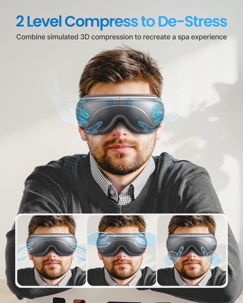 This heated eye mask is a game-changer! The kneading, compression, and heat features melt away stress and soothe tired eyes after long screen sessions. The adjustable intensity and dual-zone massage make it perfect for migraines, dry eyes, or unwinding before bed. Super soft, durable, and packed with relaxing options—I wake up feeling refreshed every time. Highly recommend for anyone needing serious relief!