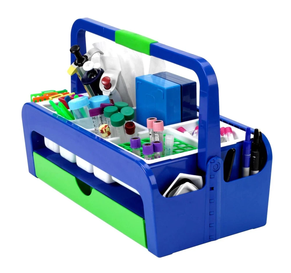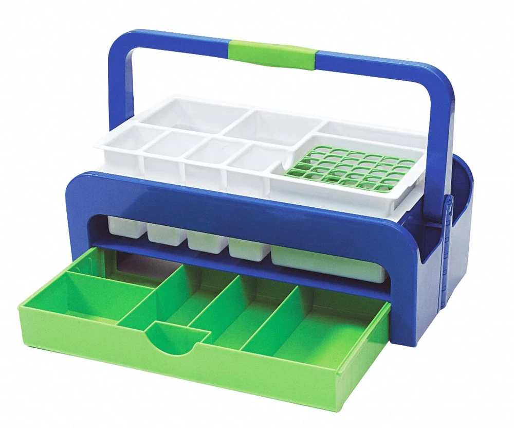 Product Description Organize a variety of items efficiently. Use the compartments surrounding the handle, the supply drawer and side pockets. Centered soft rubber gripped handle keeps balance during transport. Rotate the ratcheting handle out of the way for quick loading. Replace insert and wash tray for easy cleanup. ABS tray, polystyrene insert and Delrin test tube rack. Tray comes with a 13mm OneRack test tube rack and two disposable polystyrene inserts. Manufacturer Contact Information 1.847.816-5070 Sturdy tray frame holds polystyrene inserts on top and supply drawer below Built-in side pockets offer additional storage space for beepers or draw slips Ratcheting handle folds out of the way for easy access even over tall sharps boxes Soft rubber grip reduces hand and finger strain Multiple compartments keep a variety of supplies neatly at hand and organized Inserts include extra-deep compartment for sharps container Drawer "clicks" shut and will not pop open while carrying