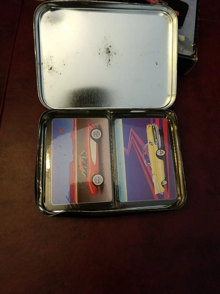 Heaven 57 Automotive Playing Cards - Two Sets in Metal Box New. There is a dent in the tin.