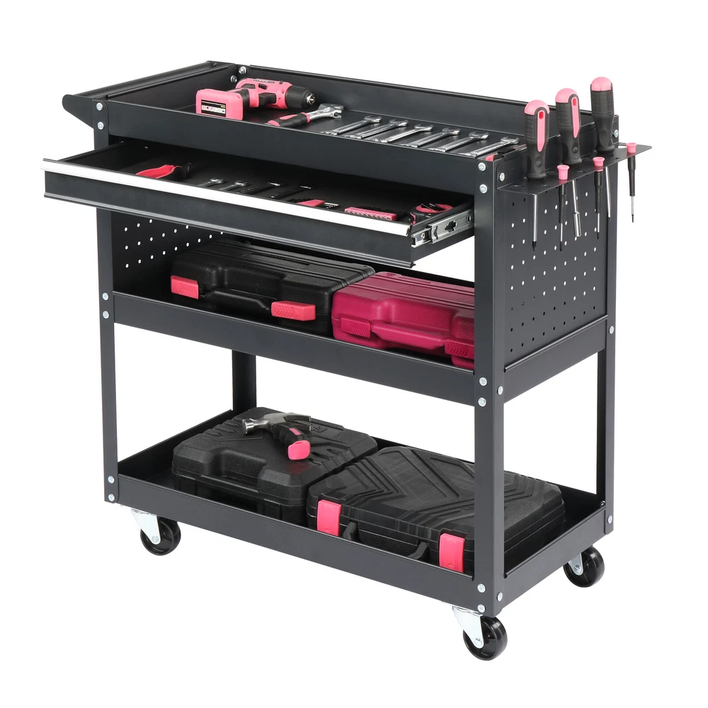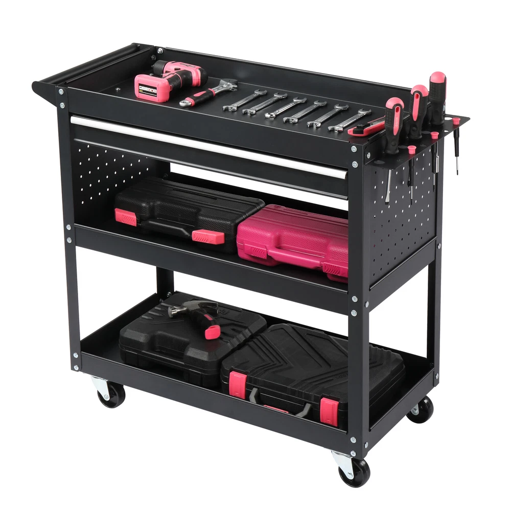 Introductions: Maximize your tool storage and organization with this 3-Tier Rolling Tool Cart. Designed for garages, repair shops, and warehouses, this heavy-duty utility cart is crafted from premium thickened steel to withstand demanding tasks. Its large 330 lb load capacity ensures you can securely store and transport tools, supplies, and heavy items with ease. The addition of a pegboard, hooks, and a spacious drawer provides extra convenience, while the 360-degree swivel wheels and ergonomic side handle make maneuvering effortless. Whether you're a professional or a DIY enthusiast, this rolling tool cart is your ideal workspace companion. Features: 1. Durable Steel Construction: Crafted from premium thickened steel, this tool cart boasts excellent durability and resistance to bending, dents, rust, and corrosion. The powder-coated surface maintains its vibrant finish and is easy to clean and maintain. 2. Spacious Multi-Tier Storage: Featuring two spacious open shelves, a top tray, and a smooth-glide drawer, this tool cart provides ample room to store tools, parts, and accessories. The pegboard and included hooks keep your frequently used items organized and within reach, ensuring a clutter-free workspace. 3. Smooth Mobility with Locking Wheels: Equipped with 4 swivel casters, including 2 lockable wheels, this cart glides smoothly across any surface while offering stable positioning when needed. The ergonomic side handle enhances control, making movement and positioning hassle-free. 4. Quick and Easy Assembly: With straightforward instructions and all necessary hardware included, assembling your new tool cart is a breeze. You'll have it ready for use in no time, so you can focus on your projects. 5. Versatile Applications: Ideal for garages, workshops, warehouses, and home use, this utility cart is perfect for storing and transporting tools, boxes, and supplies. Its sleek design and robust functionality make it an essential addition to any professional or personal workspace. Specifications: 1. Color: Black 2. Material: Steel 3. Load Capacity: 330 lb 4. Overall Dimensions: (33.5 x 14.2 x 29.1) in / (85 x 36 x 74) cm (L x W x H) 5. Top Tray Inner Dimensions: (27.9 x 13.7) in / (71 x 34.8) cm 6. Drawer Inner Dimensions: (24.4 x 11.8 x 1.9) in / (62 x 30 x 4.8) cm (L x W x H) 7. Wheel Diameter: 2.4 in / 6 cm Package Includes: 1 x Rolling Tool Cart 4 x Free Hooks 1 x Free Mini Screwdriver