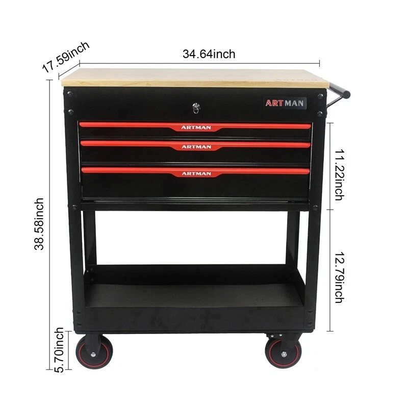Number of Items: 1 MPN: Does not apply Item Length: 31.88 in Size: Large Item Height: 38.38 in Item Width: 17.51 in Number of Drawers: 3 Features: Lockable, Wheels, Rolling Manufacturer Warranty: 6 Months Color: Black Brand: ATRMAN Item Weight: 80.4 lb Type: Tool Cart