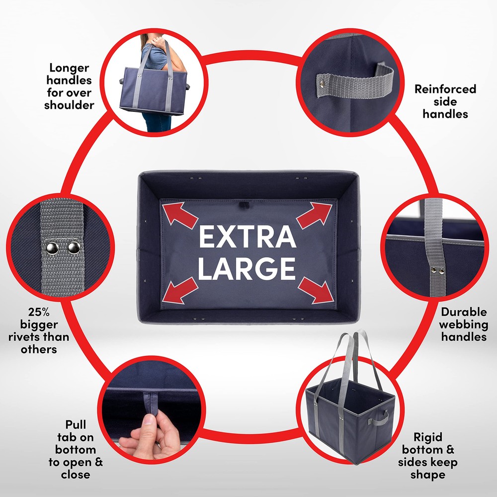 BAG-THAT! 4pk Reusable Grocery Bags Shopping Bags Tote Box Bag Large Heavy Duty Kitchen Reuse Trolly Cart Groceries Bag Long Handles Collapsible Foldable Reinforced Bottom Durable Organizer Carrier STANDS ON IT'S OWN AND STAYS OPEN - Grocery bag box, EZ load and unload, rigid sides and bottom insures they stand and stay open while you pack and unpack the tote. BAG-THAT! - Bag That is a BOX! "Does not fall over in the trunk!" MORE FLOOR SPACE - EXTRA LARGE - more bottom floor space at 14.5" L x 10" W x 10" H the reusable shopping bags were designed to load heavy items on the bottom leaving the top space for light items. HEAVY DUTY MADE TO BE USED - Stronger longer webbing carry and side handles using 25% larger rivets heavy duty insert board covered with a thicker material for these reusable grocery bags. MANY USES FOR THIS STURDY AND DURABLE - Tote utility bag kitchen reusable grocery bags organize toys arts crafts home projects cleaning supplies picnics camping trunk organizer trolley bags lotus bags FOLDABLE - EASY TO CLEAN - ECO FRIENDLY - Reusable bags collapse flat for EZ storage in your pantry or trunk. simply wipe clean with a damp cloth and allow to dry. Made with some recycled materials.