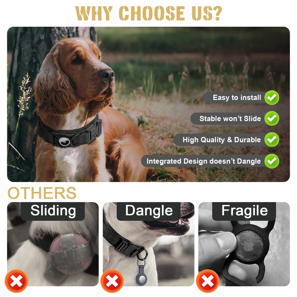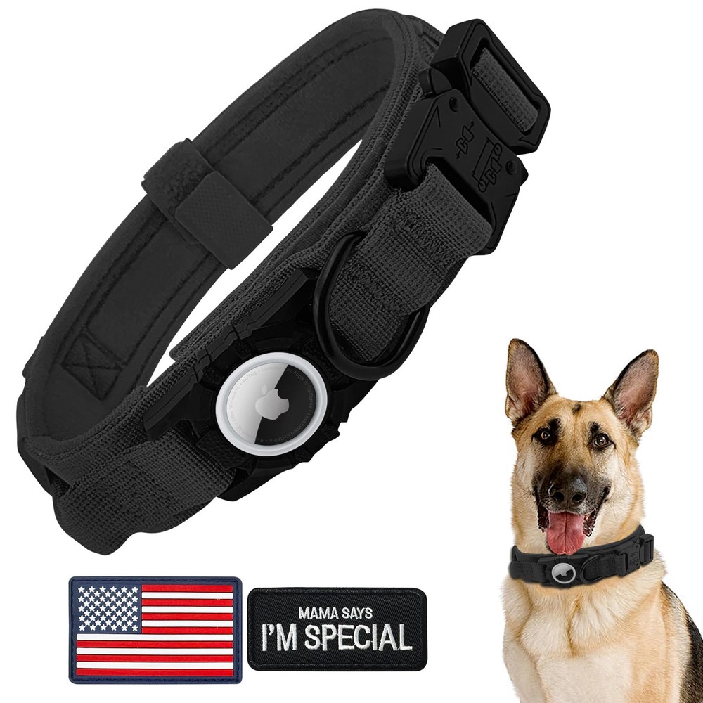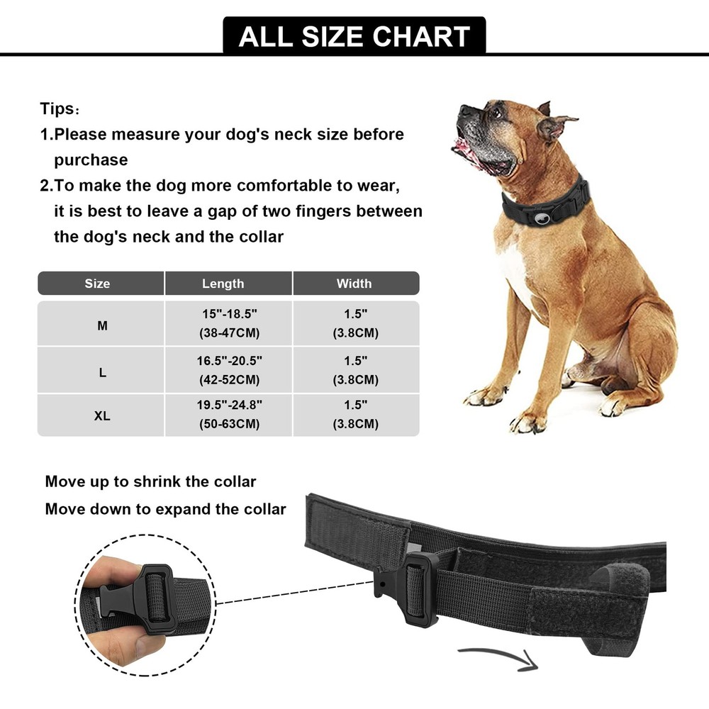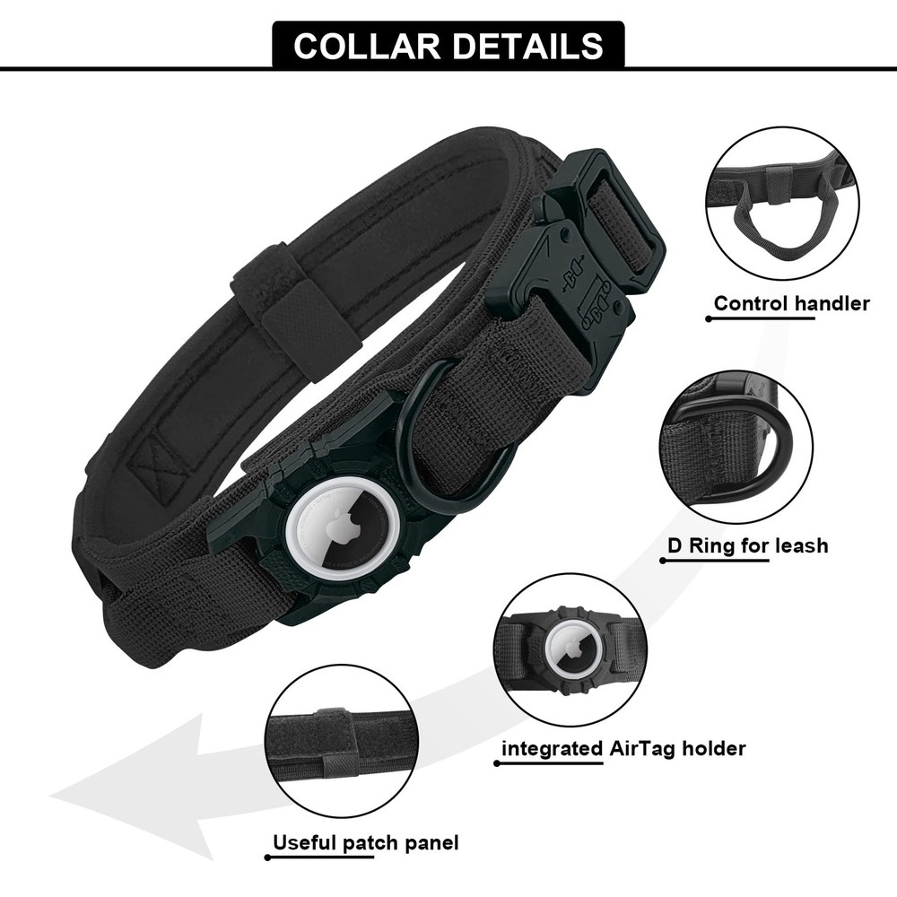 DESIGNED FOR APPLE AIRTAG:The AirTag holder can be 1:1 compatible with AirTag, and effectively prevent the Airtag from falling off, dangling or dog biting. Compared with other Air Tag holder, our integrated AirTag dog collar is more cost-effective. No need to buy additional AirTag holder for dog collar. Our Apple Air Tag collar is exactly what you need for tracking your dog safely and easily. PREMIUM MATERIAL:Tactical Dog Collars is made of high-quality 1000D nylon fabric and utilizes Zinc alloy buckle,which is durable enough for long-term wearing. The padded inner lining is soft and comfortable, that won't hurt dog's fur and protect its neck well.It is highly recommended by military and police equipment lovers. Double Safety Dog Collar for Large Dogs:Buckle Training Dog Collar Adopt Integrated Collar And Quick Release Metal Clasp Dual Design. Adjustable Dog Collar Easy To Put On And Take Off,The Metal Clasp Can Be Released Quickly In Case Of Emergency,guaranteeing safety for your dog. Control Handle:We have improved the control handle of our large dog collars to the widen one, which is more comfortable for you to control your dog better, and also avoid your palm injury caused by sudden pulling during training, hunting, jumping. 3 Size Option:GPS dog collar are available in 3 sizes, (neck size: M=15-18.5", L=16.5-20.5", XL=19.5-24.8" ).Please measure your dog's neck before ordering.If you buy the wrong size, please contact us for a free exchange.