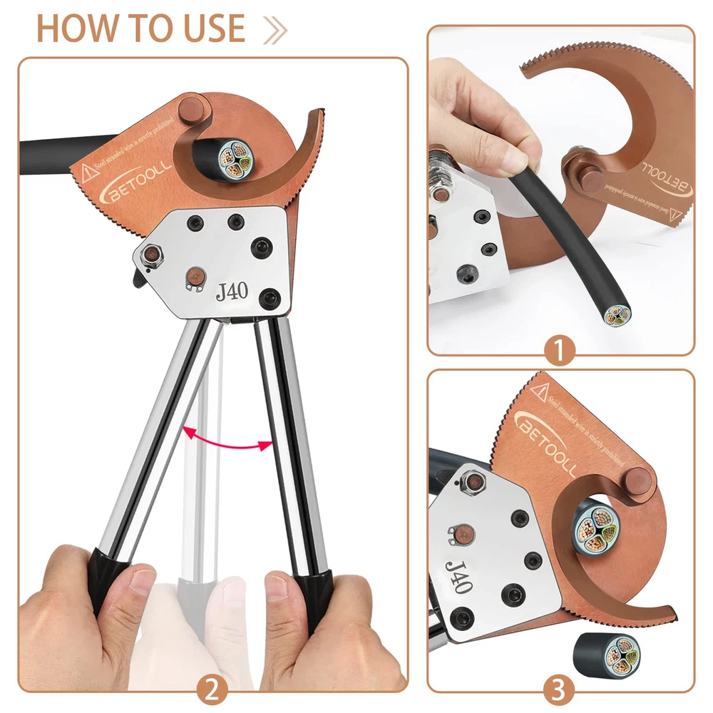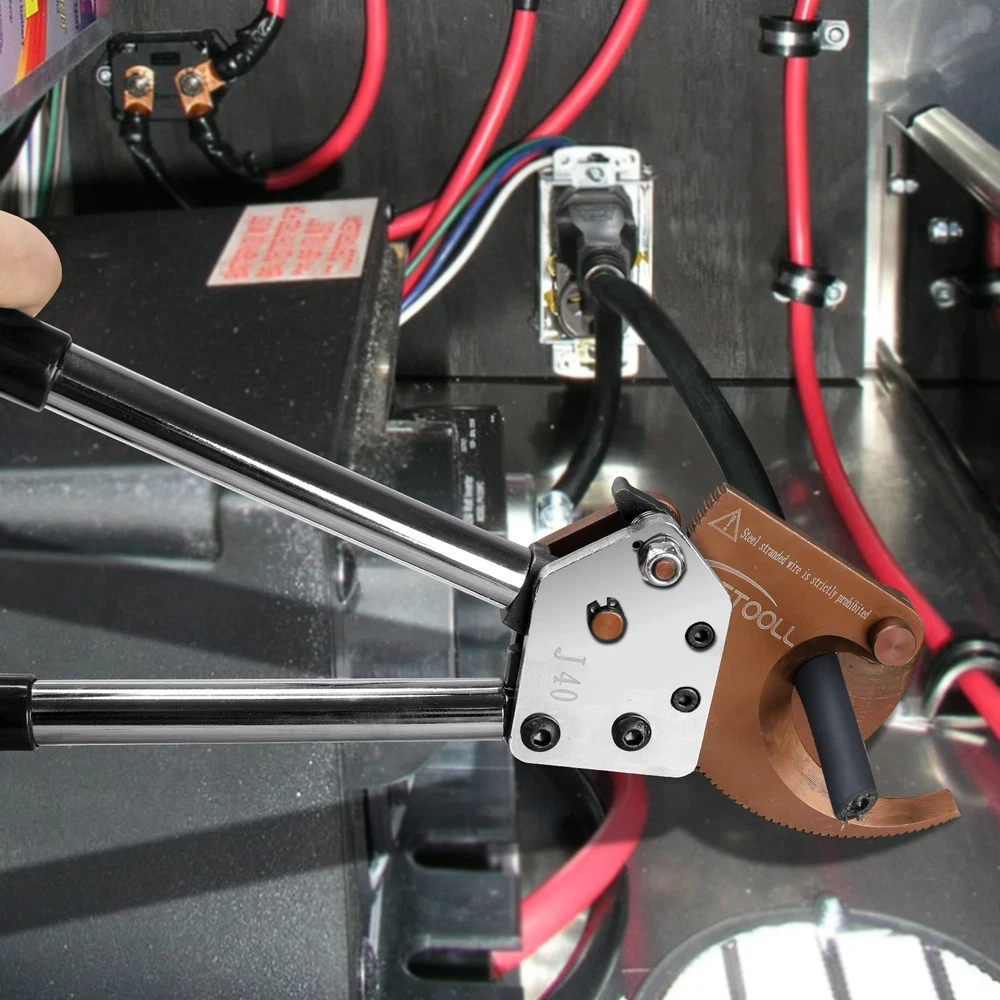 Description: This is a J Series Cable Cutter, which is an electrician tool and is suitable for peeling the external layer foreskin of a cable,comprising a knife frame, a knife blade arrangedin the knife frame, a fixing and regulating mechanism for the knife blade, a tailstock connected with the knife frame, etc. The cable stripper has reasonable structure, and the peeled cable thread end is orderly. The utility model has convenient operation, is labor saving and safe and can not damage cable wires and human bodies. Features: ----No damage of the conductor cores. ----Blade made of stainless steel. ----Ergonomically designed safety handle. ----With transparent protective cap. Top of the range heavy duty ratchet style cable cutters with carry case. Total length - 34cm Weight:1.3kg Manaul Cable Cutting Tool Ratcheting ratchet J40 300mm² Max Wire Cutter Plier Suits - Copper or Aluminium Cable Core Only