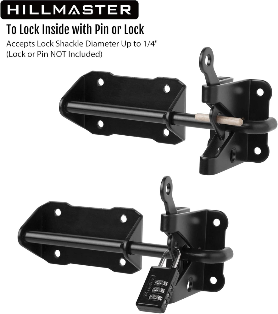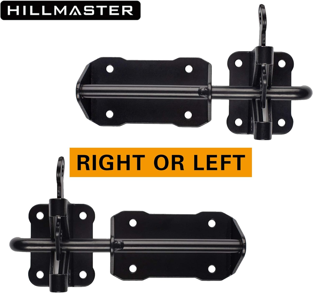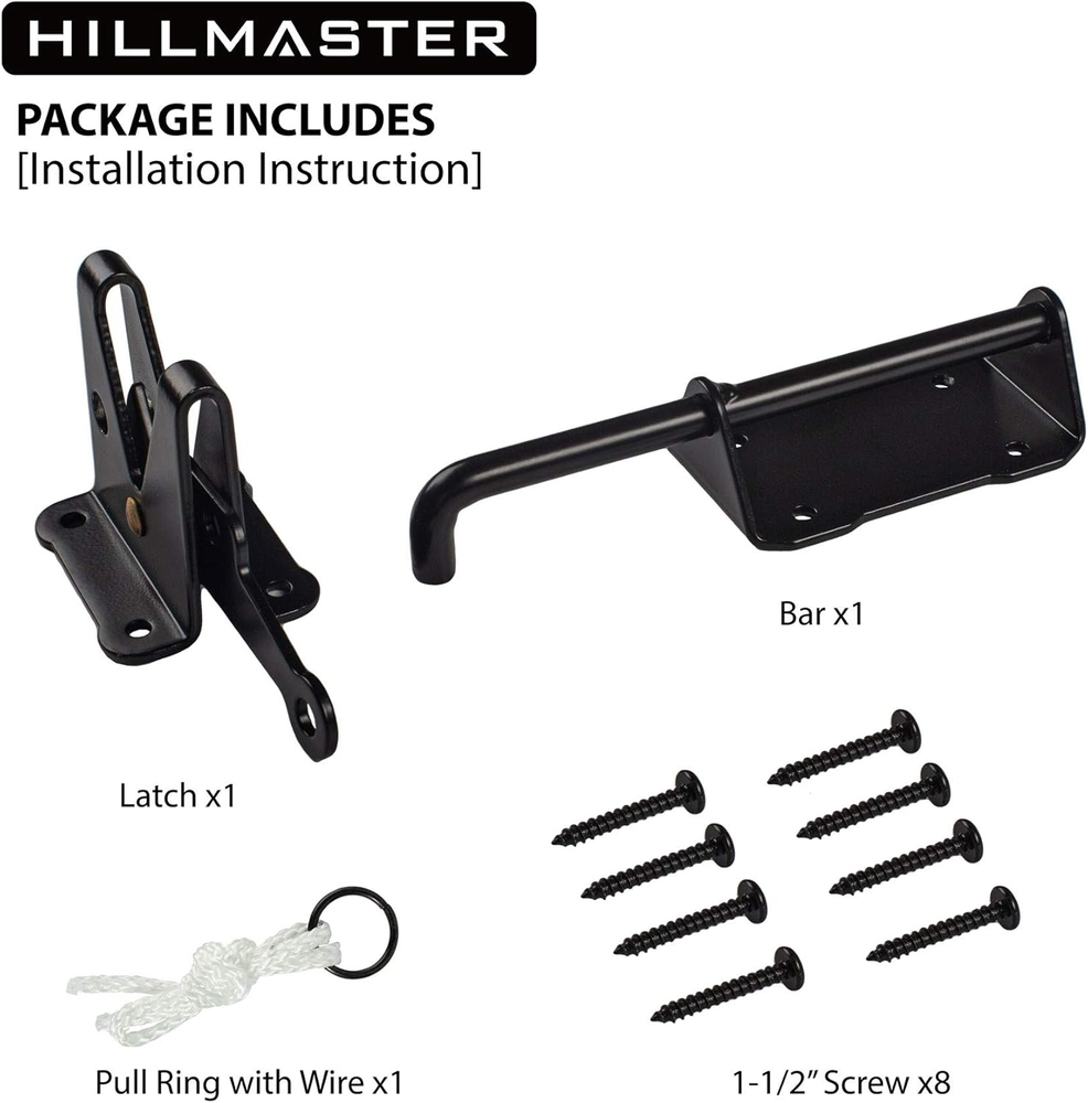 【Gravity Self-Locking Gate Latch】Automatic Garden Gate Latch made from heavy gauge steel construction with Superior black powder coat finish & Zinc Plated corrosion resistance, Designed to offer simple but solid security for inward and outward swinging gates and doors, features a self-latching fingertip release-can also be operated with a cord or wire.(Package included) 【Upgrade 1.5” Strong Screw】 The Heavy-duty Privacy Gate Latch apply the 2020 upgrade new 1.5”(38mm) screw to help fix the gate latch more deep and firm, Measured 1.4lb(675g), 4”x2” thick base-plate for strike bar fixed on fence more durably than a single bar, no need to install extra handle on fence. 【Multipurpose】Our Security Gate Lock Hardware Kit perfect for wood gates, wooden fence, vinyl gate, it can also be installed in aluminum alloy doors or metal gates(Tips: Please replace professional hard screws), Use on garden, vegetable farm, orchard, backyard, deck, sheds, ranch, baby gate, pool gate, barn door, carports, privacy fence, side fences, cattle, dog kennels, sheepfold, stable, animal pens or chicken coop door. 【Easy to Install &Padlockable】Longer self latching exterior door latch works better for the bigger gap up to 1.5" between gate and fence post. Get better reinforcement with a Lock or Pin when a large dog keeps banging on the door. Can be padlocked for added security with ordinary padlock (Padlock not included).Comes with installation instructions and all mounting screws, suitable for left or right hand application. 【Professional Guarantee】We are specialized in producing various hardware fittings, please go find all kinds of home hardware fittings you need in HILLMASTER store and enjoy it! If you are not satisfied with our products, please feel free to contact us. We are committed to providing the professional products and the caring service for every consumers. Product Description