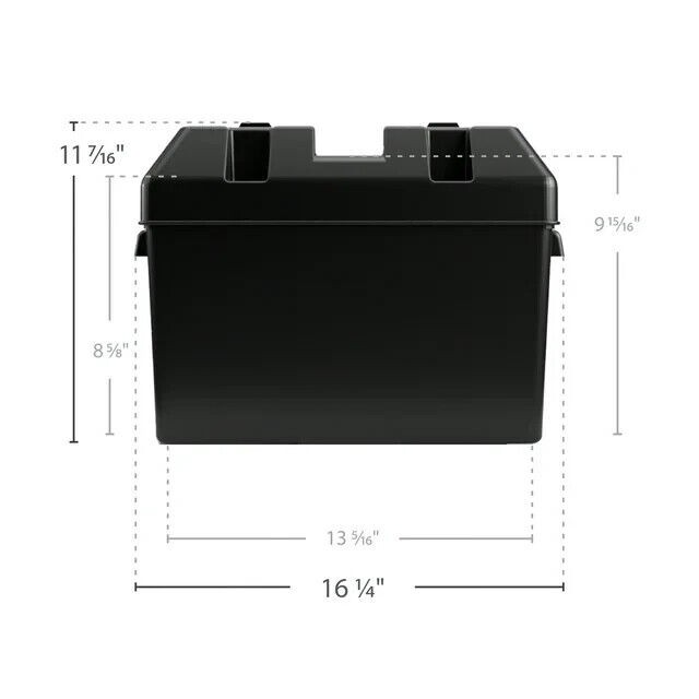 Product details: Large Battery Box is a black lightweight, heavy-duty corrosion-resistant polypropylene box which is designed to secure and protect your battery. It includes lift-off lid, durable woven hold-down strap, foot clamps and stainless steel screws. This box meets USCG CFR 183.420 and ABYC E-010.7 specifications. It fits group size 27, 30, and 31 batteries with inside dimensions measuring 7 ¼” Wide X 13 ¼” Long X 8 5/8” tall with 2” additional head room for battery terminals. Includes lift-off lid, durable woven hold-down strap, foot clamps and stainless steel screws Lightweight, heavy-duty corrosion-resistant polypropylene box Fits group size 27, 30 and 31 batteries Inside Dimensions = 7 ¼” Wide X 13 ¼” Long X 8 5/8” Tall with 2” additional head room for battery terminals Meets USCG CFR 183.420 and ABYC E-10.7 specifications On Jul 9, 2025 at 20:37:02 PDT, seller added the following information: On Jul 11, 2025 at 19:54:04 PDT, seller added the following information: