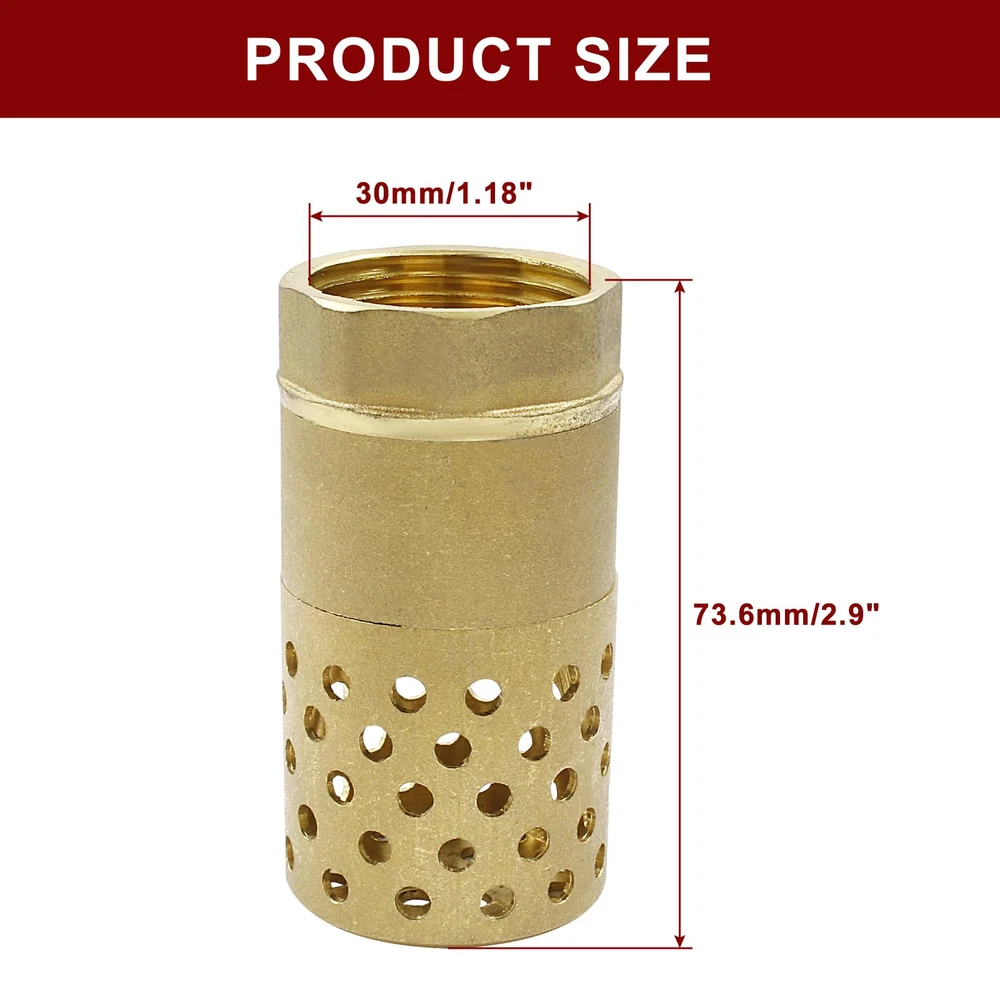 Brass Foot Valve Female Thread Backflow Preventer Check Valve Mesh Check Valve DN25 Feature: -Solid brass construction, strong and durable, aging and corrosion resistant. -Precision female thread, good connection and good sealing. -Easy to install, a nice replacement for old or broken valve. -Wide range of application, has check valve and pressure relief valve function. Specifications: Material: Brass Size: 73.6 x 38.5mm / 2.9" x 1.51" (L*W) Thread Type: DN25 Connection Mode: Screw Thread Applicable Medium: Water, non-corrosive liquids Package Included: 1Pcs x Brass Foot Valve Notices: 1.The color of the item may have slightly different from the pictures due to different photography light. 2.Due to manual measurement, please allow an error of 1-3mm. Thank you for your understanding. We hope you have a pleasant and satisfied experience. If there are any problems, welcome to contact us, we will deal with it within 24 hours usually. If the item has any manufacturer defect problems, please contact us first, we want to improve your experience by giving you a replacement or refund. Please give us the opportunity to resolve your problem, Thank you! 【What You Will Get】1 x Brass Foot Valve. Size: 73.6 x 38.5mm / 2.9" x 1.51" (L*W). Thread Type: DN25. The bottom of the foot valve is designed with many small round hole, which help filter out some large particles. It is also very easy to install and take off. 【Durable Material】The Female Thread Bottom Valve is made of high quality solid brass, with high strength and durability, anti-corrosion and wear resistant, more strong and sturdy than traditional grid mesh. The precision female thread ensures good connection and sealing performance. 【Function Well】The Mesh Check Valve is assisted with stainless steel spring, can maintain system pressure, prevent liquid backflow. The holes at the bottom help filter impurities in water, protect water pipes and prevent clogging. 【Widely Application】The Backflow Preventer Check Valve is used for well jet pump,maintains pump prime and strainer filters out debris, suitable for any pump in suction lift applications such as ponds, wells, tanks, irrigation systems, electric water heater and so on. 【100% Risk-Free Shopping】If you have any questions or problems during the purchasing or not satisfied with the product, please feel free to contact us via Amazon email, we will try our best to give you a satisfied solution. Please rest assured to order, we wish you a happy shopping experience.