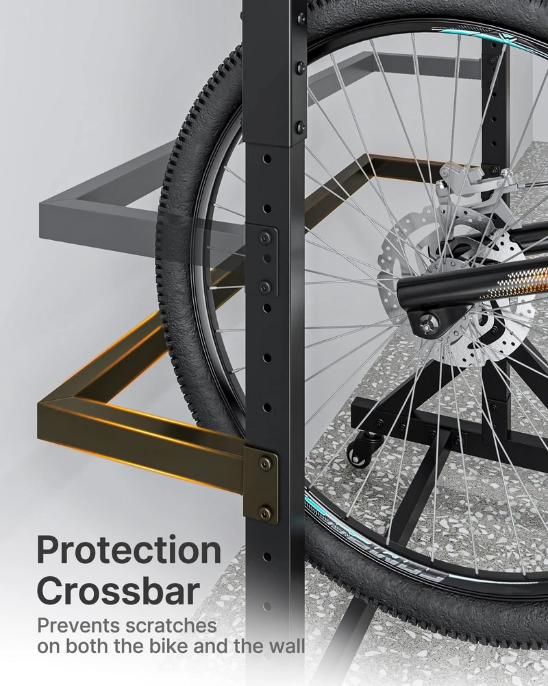 INDUSTRY LEADING HOOK ECOSYSTEM: Revolutionize your bike storage rack system! 5 sliding PVC-coated hooks (55lbs each) + 6 height-adjustable accessory hooks (2 helmet + 4 utility). Securely organize bikes, helmets, and gear in one vertical bike stand station. LOCKING CASTERS & FLOOR STAND DESIGN: Effortlessly relocate 5 bikes! Our freestanding bike stand features 4 large-scale, locking casters with full 360° swivel and ultra-quiet rolling. Glide smoothly over any surface, then brake instantly to stabilize this vertical bike stand on uneven floors. PRECISION FIT FOR PREMIUM BIKES: Our bike storage rack height adjusts (49"-78.5") & bike hooks slide laterally to fit e-bikes/road bikes/kids' bikes (tires ≤ 3.5"W x 3.1"H). The height-adjustable protection crossbar safeguards both bike and wall from scratches. COMMERCIAL-GRADE CONSTRUCTION: This freestanding bike stand features a reinforced triangular base for maximum stability and holds 350lbs total capacity, exceeding ASTM safety standards. Premium matte-black powder-coated steel resists scratches/rust. EASY INSTALLATION: There are all necessary accessories and dtailed installation instruction in our package, the vertical bike stand has a simple structure and is equipped with pre-drilled holes. You can quickly install the entire bike rack. Before hanging the bike, please check if all the screws are installed firmly. ELEGANT GARAGE INTEGRATION: Vertical bike stand frees 80% floor space. Tool-free hook slides and luxury finish integrate seamlessly with modern bike storage rack systems.