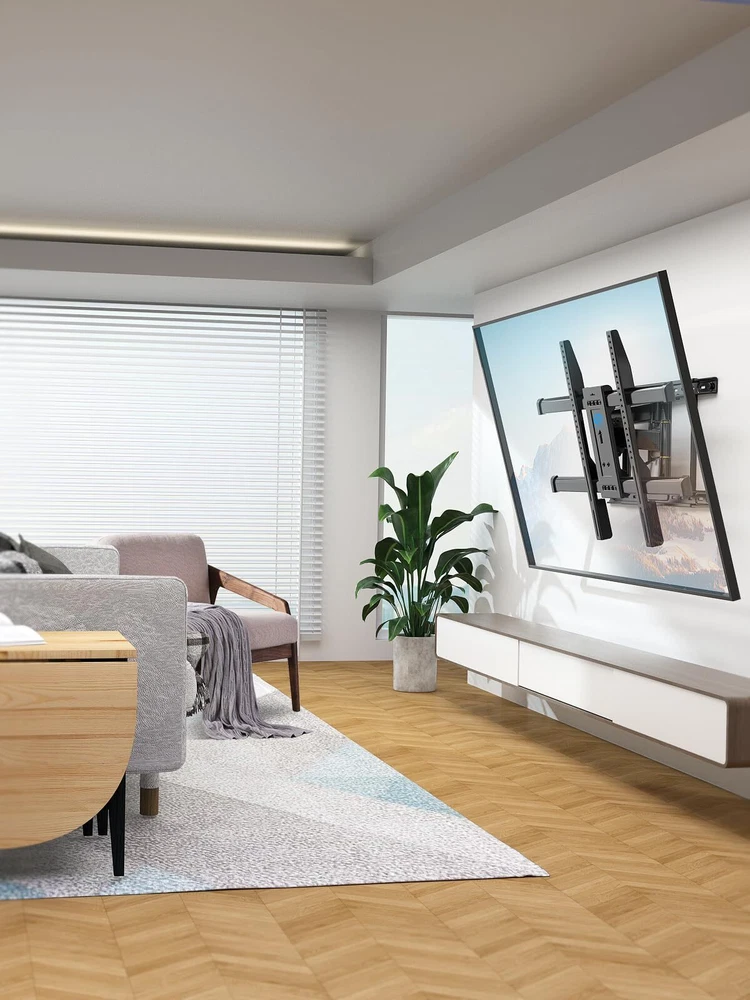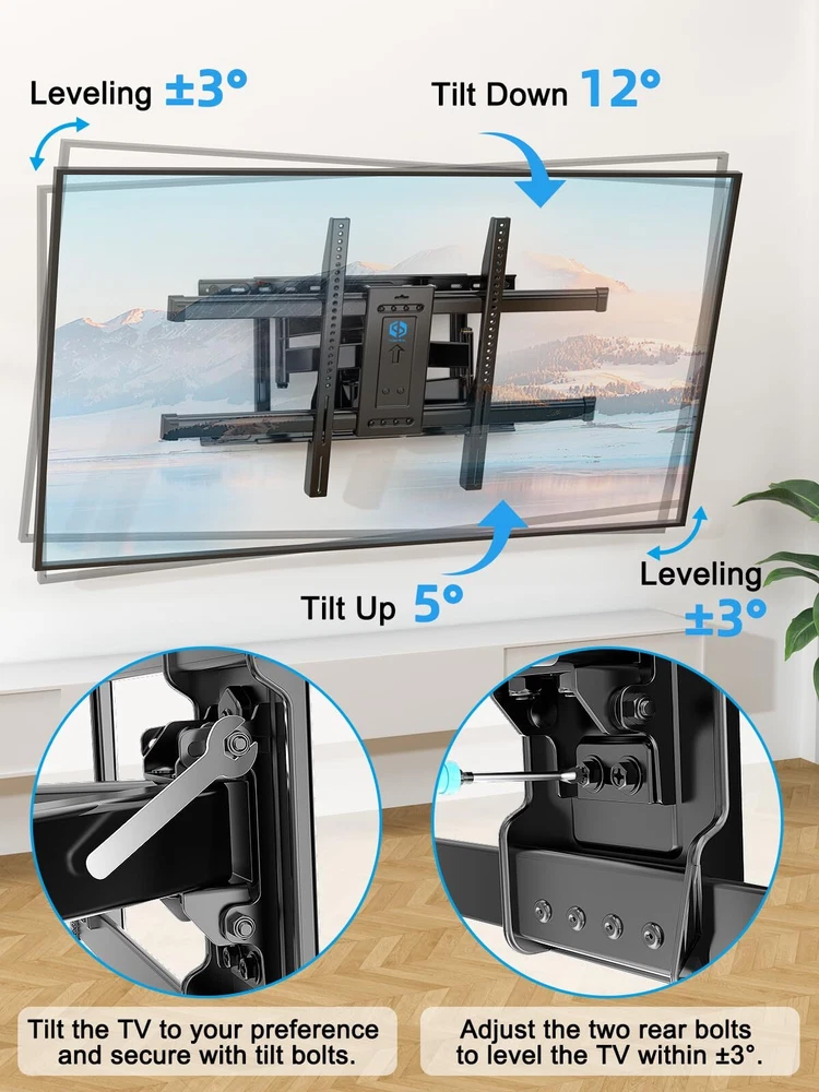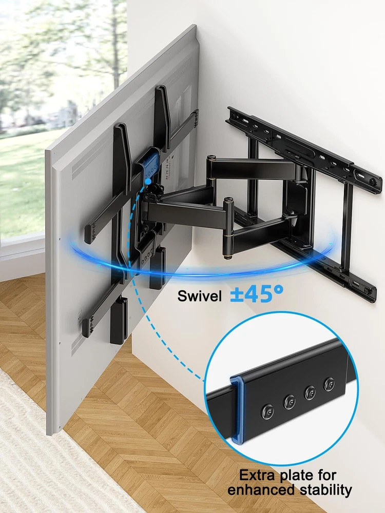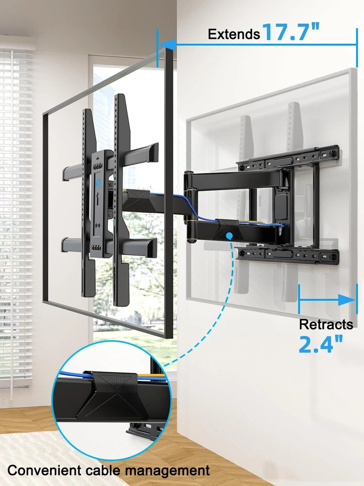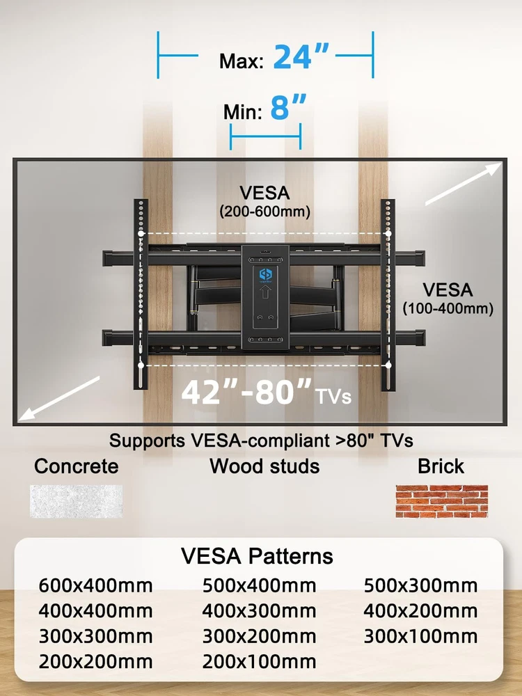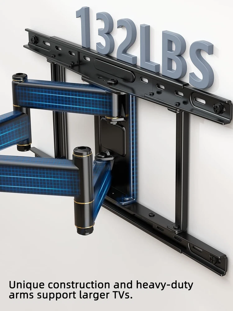 Large TV Wall Mount: This full motion TV wall mount supports TVs from 42″ to 80″, weighing up to 132 lbs, and accommodates VESA wall mounting patterns ranging from 200x200 to 600x400mm (suitable for TVs 80in+, ensuring VESA falls within this range). It's designed for easy installation on 8″/12″/16″/18″/24″ wood studs, as well as solid concrete or brick walls Extra Long Extension Arm: Compared to similar products, our articulating arms can be extended to further(up to 17.7") and also retracted to closer to the wall (2.4"). Extend freely for more immersive viewing and retract to improve the look of your home. It also includes a cable management feature which eliminates cable clutter Adjustable Swivel Tilt: Enjoy a customizable viewing experience with this articulating TV mount. Enhanced hinges allow for smoother movements, while the dual articulating arms provide a +5° /-12° tilt, ±45° swivel (dependent on your TV), and +/-3° post-installation adjustment for perfect leveling Heavy Duty Thickened: Crafted with durability in mind, our heavy duty TV wall mount boasts thick arms made of high-quality steel to provide solid support for large TVs. The enhanced wall plate ensures maximum stability, featuring anti-drop end caps and security locks to keep your TV securely in place. With reinforced panel joints, this wall TV mount prevents any tilting, offering lasting stability Easy Assembly: Our universal TV mount includes a drilling template, detailed instructions, bubble level, cable clips, ties, and all necessary mounting hardwares for a hassle-free setup. You can mount it within 20 minutes. Please do not mount on drywall alone