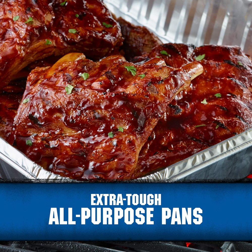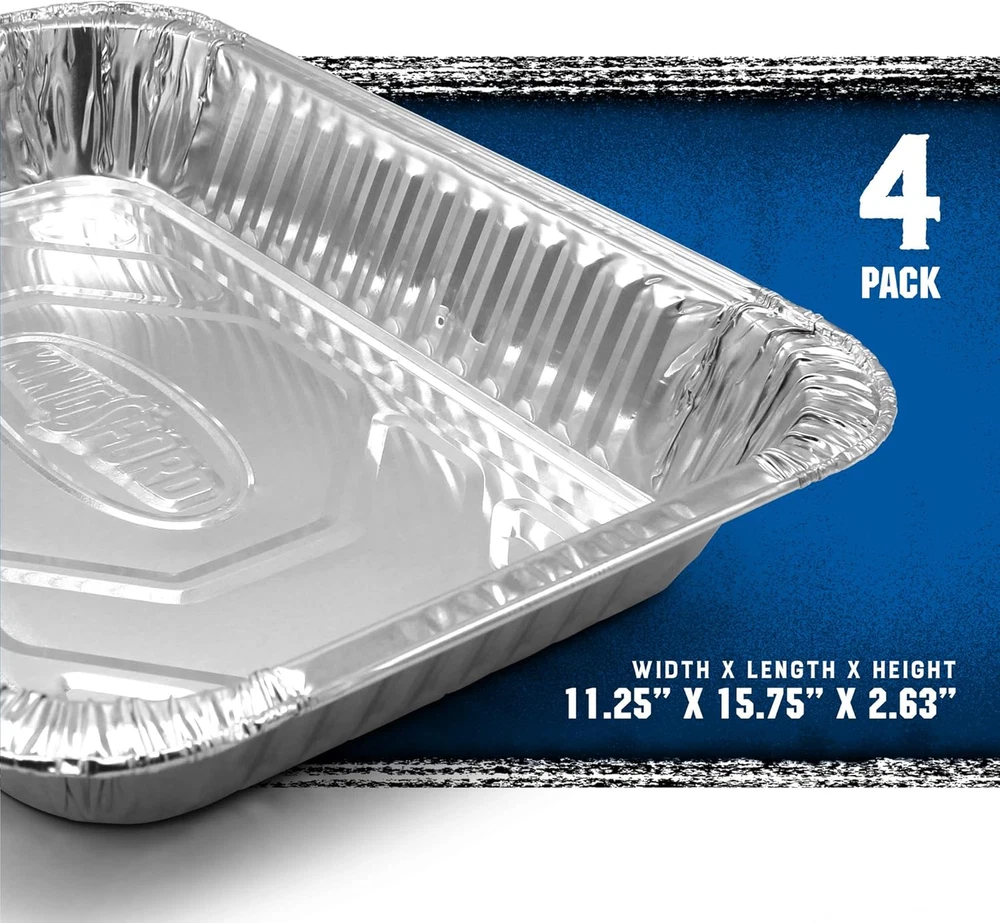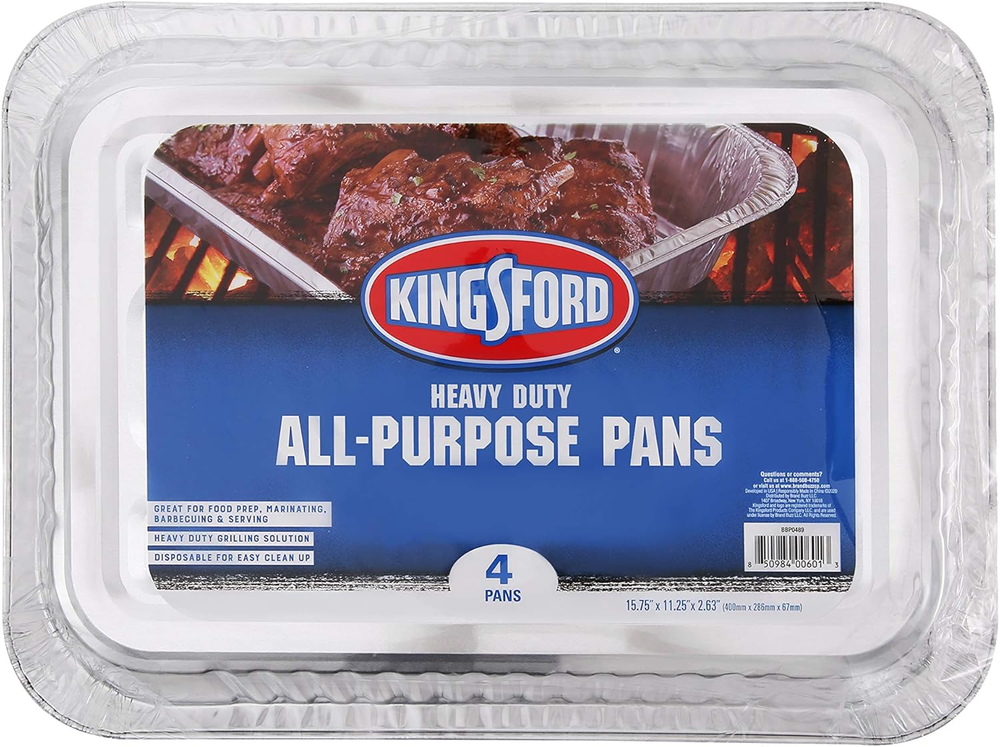 EXTRA-TOUGH DISPOSABLE COOKWARE - Kingsford aluminium foil pans provide a heavy duty grilling companion. These large aluminum pans withstand high heat for baking, roasting, or grilling, making them perfect for any outdoor cooking or serving need IDEAL FOR GRILLING AND FOOD PREP - Use these disposable aluminum pans for grilling, prepping, marinating, and serving. The disposable tray can also serve as disposable cookware for frying, roasting, or baking for any outdoor or indoor meal preparation 4 DISPOSABLE ALUMINIUM PANS INCLUDED - This set includes 4 disposable aluminum pans, ideal for use as disposable chafing dishes or as aluminium trays for baking, cooking, and serving. These aluminum trays are great for large gatherings and events AMPLE SIZE FOR COOKING NEEDS - Each large aluminum pan measures 15.75" X 11.25" X 2.63", providing plenty of space for frying, grilling, or baking dishes like pizza, turkey, or roasting vegetables, perfect for all your outdoor or indoor cooking needs QUICK, EASY CLEAN-UP EVERY TIME - With these disposable aluminum pans, clean-up is easy after a long day of cooking, grilling, or baking. The disposable cookware allows you to simply use and throw the aluminium trays, making post-meal cleanup fast Kingsford Heavy Duty Aluminum Pans are the ultimate addition to your next barbecue or event. These disposable aluminum pans are designed for all-purpose use, making them ideal for cooking, baking, grilling, roasting, and smoking your favorite dishes. Whether you’re preparing a meal for a large family or hosting a party, these large aluminum pans can handle it all with ease. Each pack comes with 4 disposable pans, ensuring you have plenty for food prep, marinating, and serving. Crafted from durable aluminium foil, these aluminium trays are tough enough to hold even the heaviest of meals like turkey or pizza and withstand high heat during grilling or frying. Their size, 15.75" X 11.25" X 2.63", makes them perfect for a variety of foods, while also ensuring they fit well on any grill or oven. These disposable cookware solutions are not only convenient but also versatile, suitable for serving, carrying, or transporting food for any occasion. From everyday meals to large gatherings, these disposable aluminum pans make your cleanup easy—simply use and throw them away, or recycle when done.
