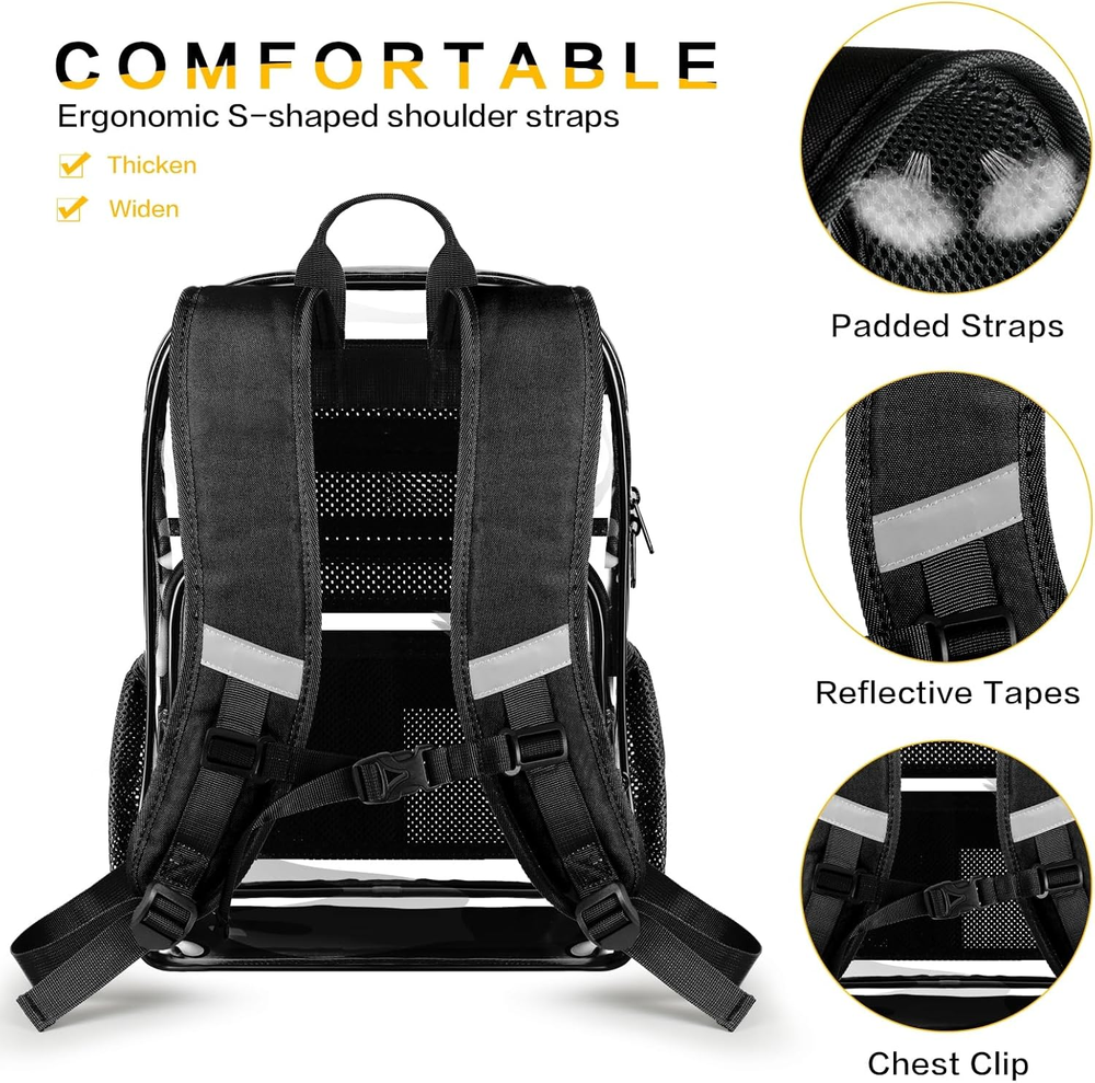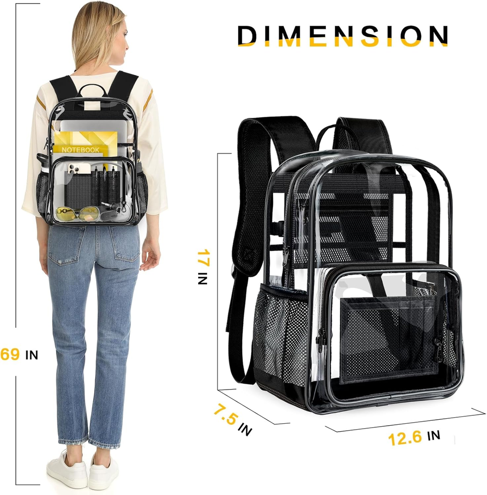This heavy-duty clear backpack is a total game-changer! The spacious 27.5L capacity easily fits my laptop, books, and gym gear with room to spare. I love the reinforced bottom for extra durability and the multiple pockets keep me organized. Perfect for school, travel, or events with security checks—it’s stylish, practical, and super sturdy. Definitely worth every penny!