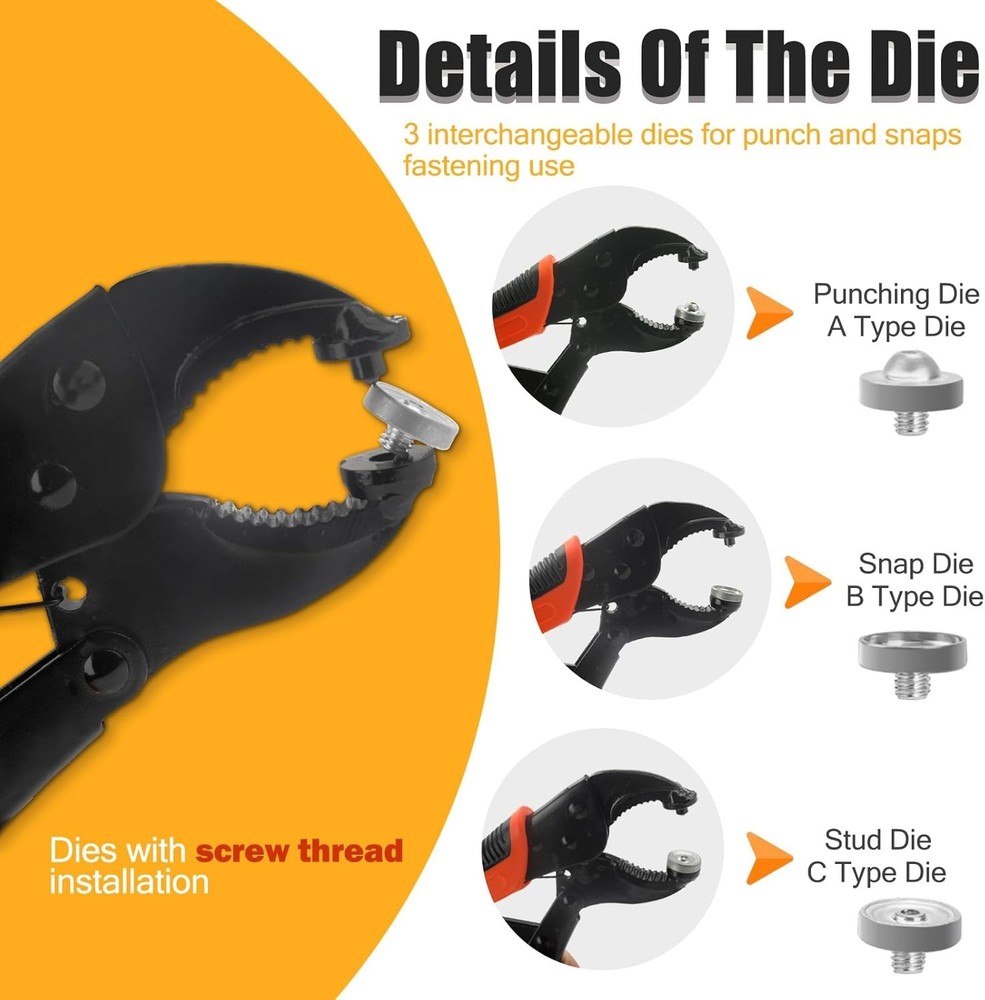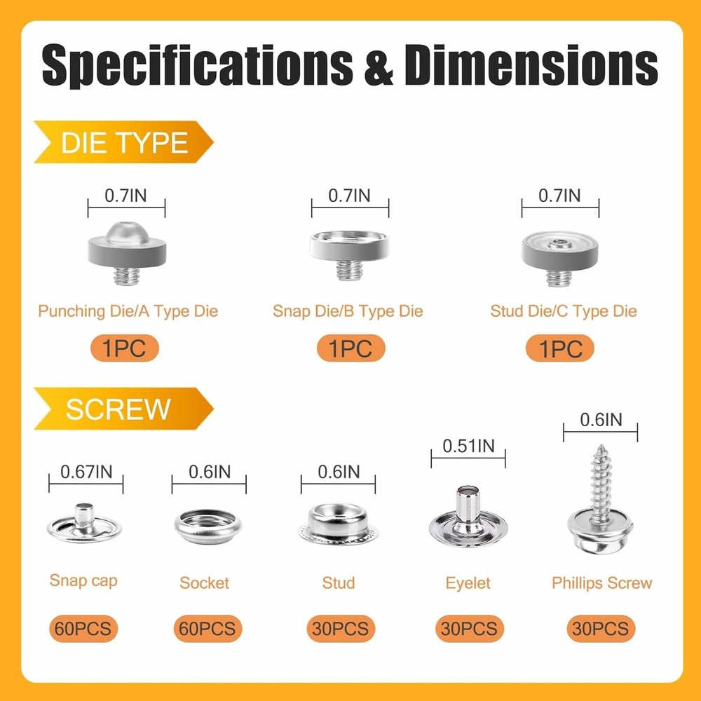 Snap Fastener Tool Kit Marine Metal Snap Buttons Heavy Duty Pliers for Canvas ‹ › ‹ › ‹ › ‹ › ‹ › ‹ › ‹ › ‹ › ‹ › Snap Fastener Tool Kit Marine Metal Snap Buttons Heavy Duty Pliers for Canvas What's Included: Heavy-duty snap fastener pliers Storage bag for easy organization 1 Tweezer to aid in delicate tasks 60 sets of marine snaps, featuring: 60 snap caps 60 sockets 30 fabric base studs 30 eyelets 30 solid base stud screws 1 hole punch die 1 snap die 1 stud die A transparent plastic box to keep all components organized Versatile Applications: This heavyweight tool can handle a variety of scenarios with grace. Use it for: Boat seats and marine canvas Boat covers and tarps Tents and fabric awnings Clothing and leather applications Furniture and golf cart covers Motorcycle helmets Exceptional Durability: Crafted from high-grade materials, this marine snap kit is built to last. Features include: High-grade heat-treated alloy steel pliers for maximum toughness and durability Stainless steel snaps that resist deformation and withstand various environments Adjustable & Flexible Design: Enjoy the ease of a compact tool: Lightweight and portable compared to traditional counterparts Simple die replacements eliminate the need for multiple accessories Height-adjustable parts ensure precision and accuracy with each snap Easy to Operate: Our snap tool comes with clear instructions for effortless use. Follow these steps: Insert the button and die correctly Align the crimping head with the button axis Press firmly to secure Recommended: Practice on a scrap cloth with the first use to avoid mistakes Why Choose Our Snap Button Kit Tool? Upgrade your craft with quick and efficient snap installations Reusability and durability for long-term use Marine-grade components prevent wear and tear in challenging environments Versatile functionality for various applications - wherever a snap is needed Transform your canvas work and ensure longevity with our Snap Fastener Tool Kit. Durable, versatile, and easy to use - the ultimate companion for both professionals and DIY enthusiasts alike. Shipping Free & Fast Shipping - We offer free shipping to most of the USA with a normal delivery time of 3-7 days. However, due to the current situation, additional delivery time (up to 3 weeks) may be required for some items. Alternative Carriers - We may use alternative carriers (e.g. USPS, FedEx, UPS, etc.) to ensure your package arrives safely and on time. Due to the use of multiple carriers, we are unable to provide a tracking number automatically. Handling Time - Orders are processed and shipped within 1-2 business days of receiving cleared payment. Shipping Restrictions - Shipping to Alaska, Hawaii, Puerto Rico, Guam, and other US territories may incur shipping charges or delivery restrictions. Please contact us before ordering, or your order can be refunded/cancelled. State Restrictions - There may be restrictions based on your state of purchase. For example, certain items may not be shipped to California due to state regulations. Contact for Tracking Updates - If you require tracking updates or have any concerns about the delivery of your order, please feel free to contact us, and we will be happy to assist you. Return 30-Day Hassle-Free Returns - We want you to be completely satisfied with your purchase. If you are not, you can return the item within 30 days of receiving it for a full refund or exchange. Easy Return Process - To start a return, simply contact us and we will provide you with a prepaid return shipping label and detailed instructions. Restocking Fee - There are no restocking fees for returns. However, the buyer is responsible for return shipping costs if the return is not due to a seller's error. Refund Processing Time - Refunds will be processed within 5 business days of receiving the returned item in its condition. Payment We accept all major credit cards, PayPal, and Apple Pay for your convenience. Your payment information is secure and encrypted to ensure a safe and seamless transaction. Please complete your payment within 3 days of purchase to avoid any delays in shipping. Feedback Your feedback is extremely important to us. We strive to provide the best products and customer service possible. If you are satisfied with your purchase, please take a moment to leave us a positive review. If you have any concerns or issues with your order, please contact us before leaving negative feedback. We are committed to resolving any problems and ensuring your satisfaction. Contact Us If you have any questions or concerns, please feel free to out to our customer support team. You can contact us through the eBay messaging system. We are available Monday to Friday, 9:00 am to 5:00 pm EST, and we will do our best to respond to your inquiry within 24 hours. Buy it now and enjoy a pleasant shopping experience! Unit Quantity: 60 sets Suitable For: Costumes,Crafts,Drapery,Jackets & Coats,Shirts & Blouses,Upholstery,Boat covers,Canvas,Leather,Furniture,Tents,Fabric,Awnings,Golf cart cover,Motorcycle helmet Color: Orange Material: Stainless Steel Type: Snap Buttons Shape: Round Unit of Sale: Pack