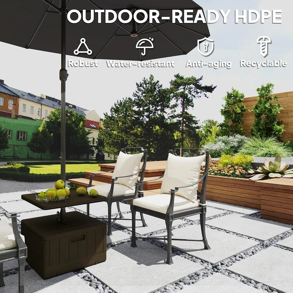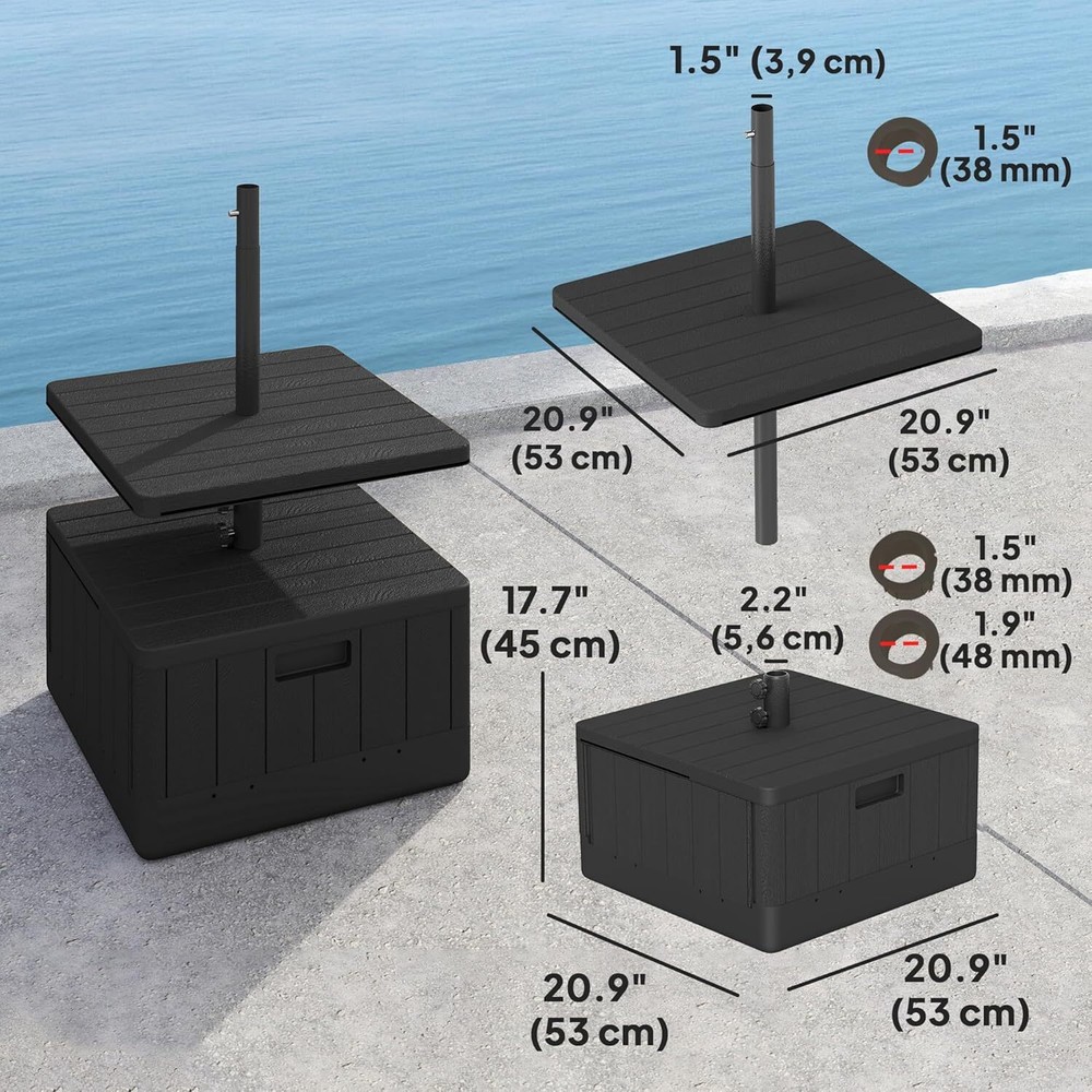 Outsunny Weighted Umbrella Stand with Table Tray, Heavy Duty Patio Umbrella Weighted Base with Wheels, Handles, 176lbs with Stand Filling, Patio Umbrella Base Weight for Garden Poolside, Black Item Description Umbrella Stand with Adjustable Table: This box-shaped outdoor umbrella base with a lid can be used as a garden end table or a planter box. A height-adjustable table tray (Only Fit Φ1.5" Poles) is included that provides easy access to drinks or snacks Fillable Umbrella Base: Achieve added stability with this patio umbrella base. Designed to ensure your patio umbrellas with 1.5"/1.9" poles stay securely in place, it can be filled with sand, reaching a maximum weight of 176 lbs Umbrella Base with Wheels and Handles: This umbrella stand base is designed with two built-in wheels and two side handles, making it mobile and easy to move and transport to your desired places Built to Last: Crafted from high-quality, recyclable HDPE plastic, this patio umbrella stand base is engineered for durability. Its anti-aging properties make it resistant to wear and weather, ensuring long-lasting use in all outdoor conditions Outdoor Umbrella Base Info: Overall Dimension: 20.9" L x 20.9" W x 17.7" H; Pole Size: Φ2.2" x 17.3" H; Suitable Outsunny Parasol Parent SKU: X-84D-031; Assembly required › See more product details *Parasol base weight suitable for garden parasols with a pole size of 1.5"/1.9" *Two tightening knobs to secure umbrella poles in place *Made of recyclable and anti-aging HDPE plastic for outdoor use *Suitable for use in your garden, patio, poolside, or other outdoor spaces Ensure your parasol is always firmly in place with the Outsunny fillable patio umbrella base weight and an adjustable table tray. Made from strong anti-aging HDPE plastic, it must be filled with sand to increase the total weight, keeping stability outdoors. Wheels and handles are included for convenient moving. Combine our weighted umbrella base with a patio umbrella and create your oasis under the shade. Payment We accept payment only through PAYPAL Shipping We ship products worldwide through standard express courier service, it will reach within 7 to 10 days to abroad buyers, we ship the product after recieved clear payment and give full information about shipment to the buyer Return We accept product return within 7 to 21 days from delivery date but product should be in original position and not in damaged condition,the return shipping charges will be buyer responsibility