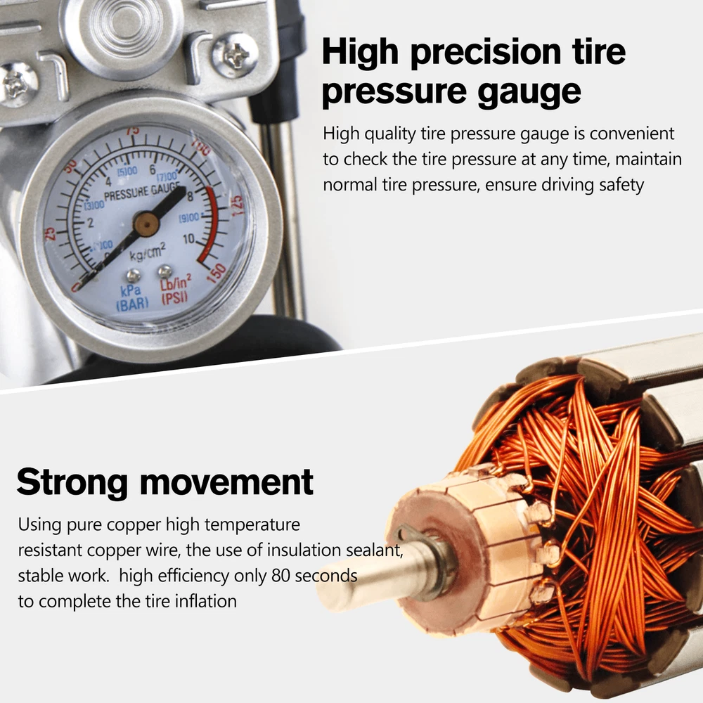 Product Description: 🥳 Feature : 【Inflate in seconds】 Unlike ordinary air compressor tire inflators that take a long time, ours does the job in 1.5 minutes or less. This 12V portable air compressor has dual cylinders with a maximum pressure of 150Psi and a flow rate of 60L/min; 4 times faster than other products. 【Equipment included】 Considering the problem of tire leaks, we put a tire repair tool in the tool pouch. The tire repair tool kit includes pliers, knife, screwdriver, tire repair strip, split-eye pins, and sharpeners. It also comes with 3 nozzle adapters and locking air clips to easily inflate air cushions/bikes/toys/inflatables. 【LCD Digital Pressure Gauge (with backlight)】 In addition to inflating the tire pump, the built-in digital air gauge checks and monitors tire pressure with a large bright LCD backlit digital display. 【Application scope】 Especially suitable for SUV, truck, van, RV, crossover, MPV, camper, trailer, van, also can be used for car, motorcycle, golf cart, bicycle, etc. 【Travel Gift】 Carry our small air compressor on your car trip, it's easy to use and keep your tires in good condition, you can buy a small tire inflator as a gift for your friends or family. 🚗 Specification: Air Flow: 60L/min Use 12 Volt DC 23A Only Color: Silver Material: Carbon Steel+Plastic+Electronic Component Power: DC 12V 280W Power Cord Length: 300cm Current: 23A(Max) Maximum Output: 150 PSI Working Temperature: -55°C to 60°C Size: 9.6*4.7*4.7inch (L x W x H) 🎁 Package Include: Package Included 1 x Portable Air Compressor Pump 1 x Power Cord with Battery Clip 1 x Extended Air Hose 3 x Inflation Adapters 1 x tool pouch 1 x User Manual 【Application scope 】 Especially suitable for SUV, truck, van, RV, crossover, MPV, camper, trailer, van, also can be used for car, motorcycle, golf cart, bicycle, etc. 【 Inflate in seconds 】 Unlike ordinary air compressor tire inflators that take a long time, ours does the job in 1.5 minutes or less. This 12V portable air compressor has dual cylinders with a maximum pressure of 150Psi and a flow rate of 60L/min; 4 times faster than other products. 【 LCD Digital Pressure Gauge (with backlight) 】 In addition to inflating the tire pump, the built-in digital air gauge checks and monitors tire pressure with a large bright LCD backlit digital display.