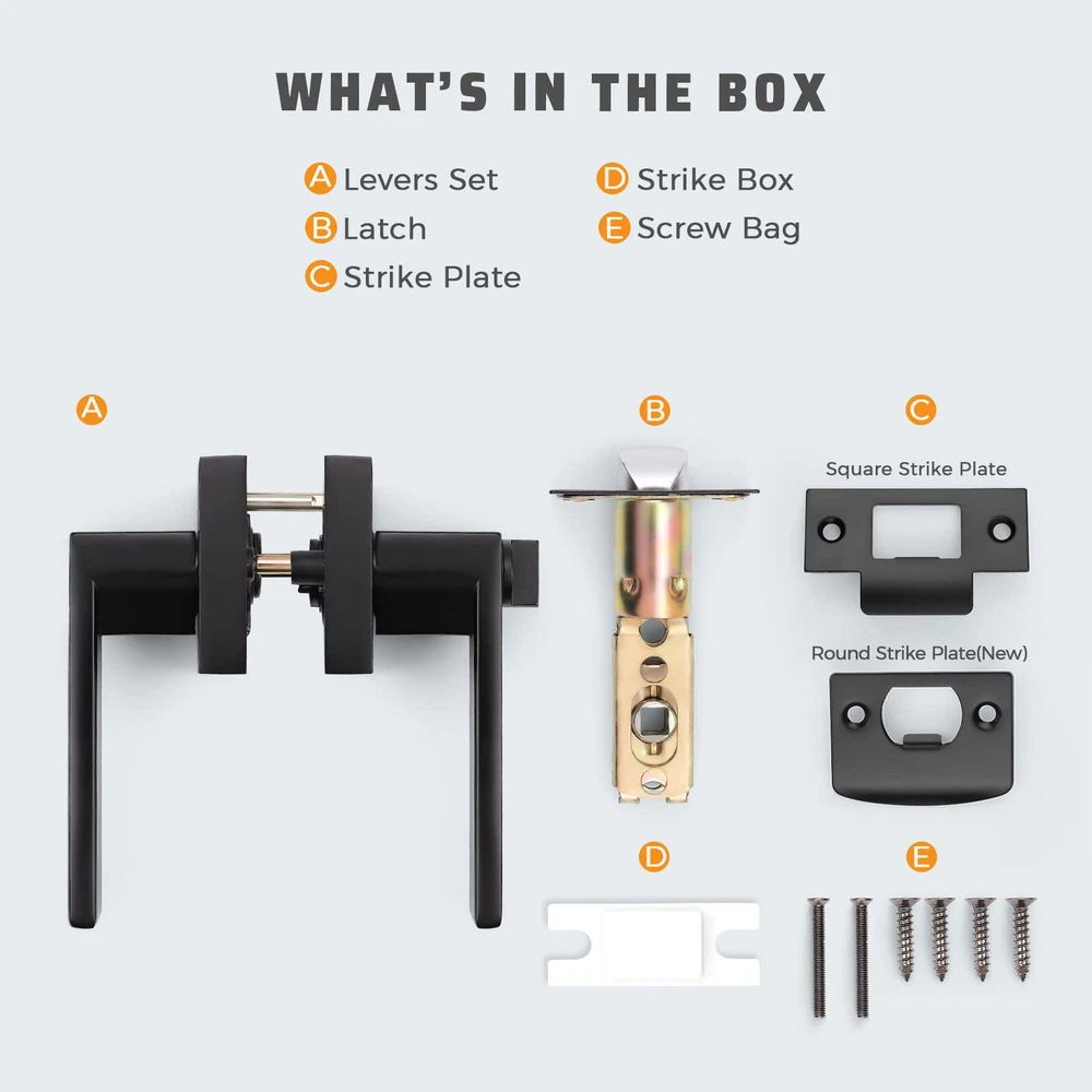 EASY INSTALLATION: Install your leverset in a flash. All you need is a door and a tool set! No need for professional door fitters, you can do it yourself! PRIVACY FUNCTION: The door lever can be locked inside and opened outside in emergency WITHOUT keys(use coin or card). Use it for your guest rooms, bedrooms, bathrooms, interior locking doors and other privacy needs. ONE SIZE FITS MOST: This black door lever fits 1-3/8" to 1-3/4" doors; Reversible for both left handed and right handed doors. (Notice: The latch plate is unremovable.) 365 DAYS GUARANTEE: The solid zinc alloy and brass, smooth finish, polished appearance and substantial, easy-to-grasp lever will subtly elevate and enhance commercial areas or residences alike. If it does not meet your satisfaction, we will surely help you. VERSION UPGRADING: New Paint Technology and New Round Strike Plate. We respect all the reviews and are dedicated to providing better products and experience. Welcome to try the updated version and let us know if you get the wrong one or have any problem!