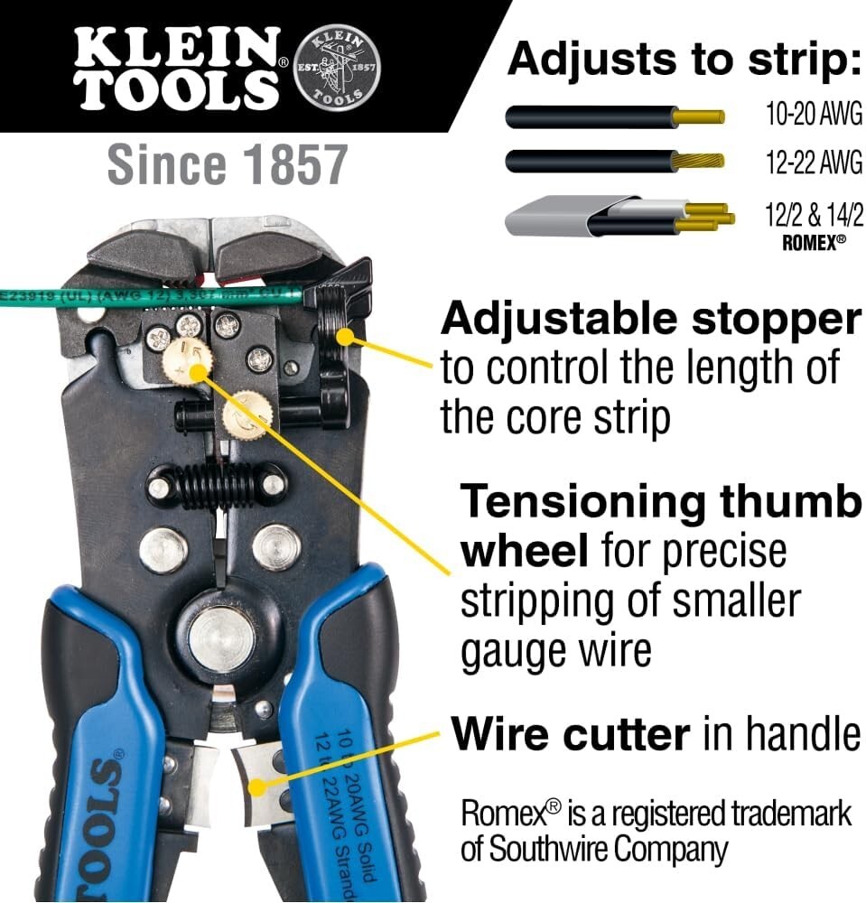 Self-Adjusting Heavy Duty Wire Stripper for 10-20 AWG Solid & 12-22 AWG Stranded VERSATILE WIRE STRIPPER AND CUTTER: For stripping and cutting on 10-20 AWG solid, 12-22 AWG stranded, and 12/2 and 14/2 Romex cable (all sizes) and other nonmetallic (type NM) sheathed cable ADJUSTABLE: Control the length of the core strip with the adjustable stopper IMPROVED PERFORMANCE: Precise stripping of smaller gauge wire with the tensioning thumb wheel HANDLE FEATURE: Equipped with an integrated wire cutter for added convenience REDUCED HAND FATIGUE: Grooved grips on the handles provide ergonomic support HVAC APPLICATIONS: Easily strip the outer jacket of thermostat wires and individual wires with this specialized tool Romex: Registered trademark of Southwire Company