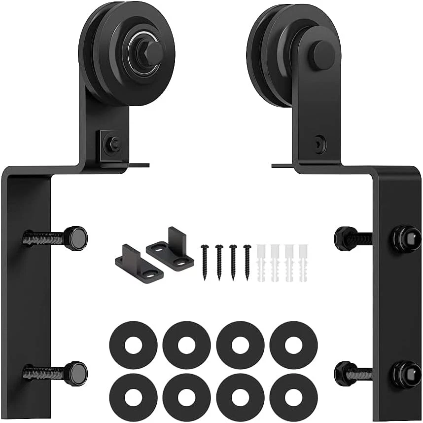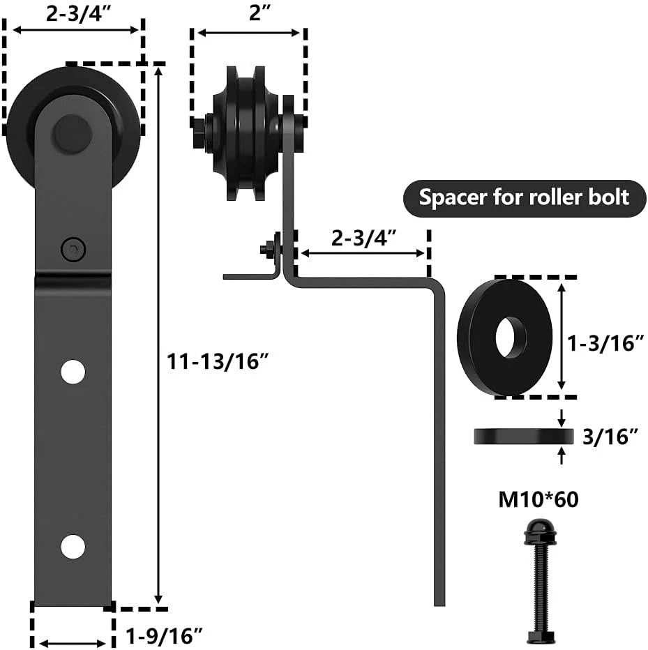 ✅ Barn Door Roller - Material: Carbon Steel, Surface: Black Powder Coated . ✅ Package Included: 2 x Right Angle Roller, 2 x anti-jump kit, 1 x Floor Guide,8 x Spacer (for hanger bolts if your barn door is thin) ✅ Door weight capacity: 265 lbs, Door Thickness: 1-3/8" and 1-3/4". ✅ Barn door hanger will fit for barn door track in thickess of 1/4" maximum , ✅ "Only the barn door roller for sale ,barn doors are not including."All the hardware have been inspection in factory before delivery,Passed 150,000 times opening and closing test bypass barn door hardware Roller Hanger Set