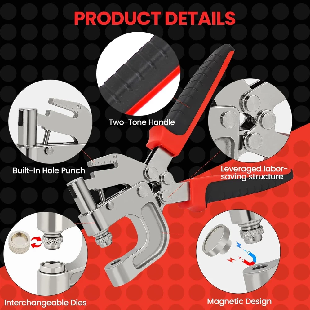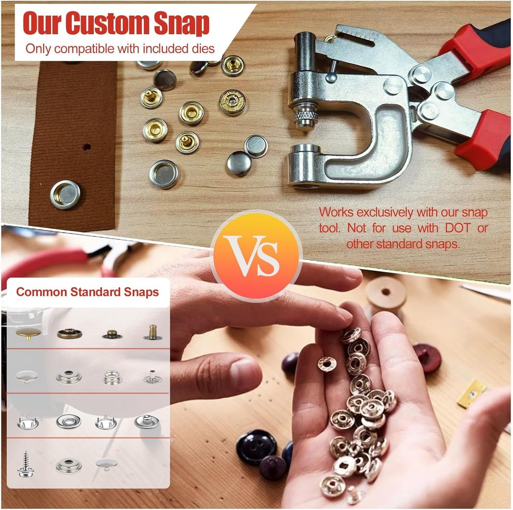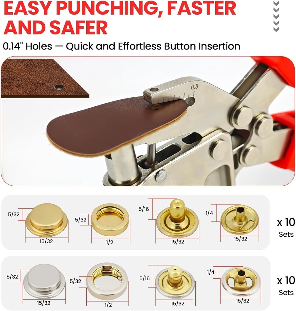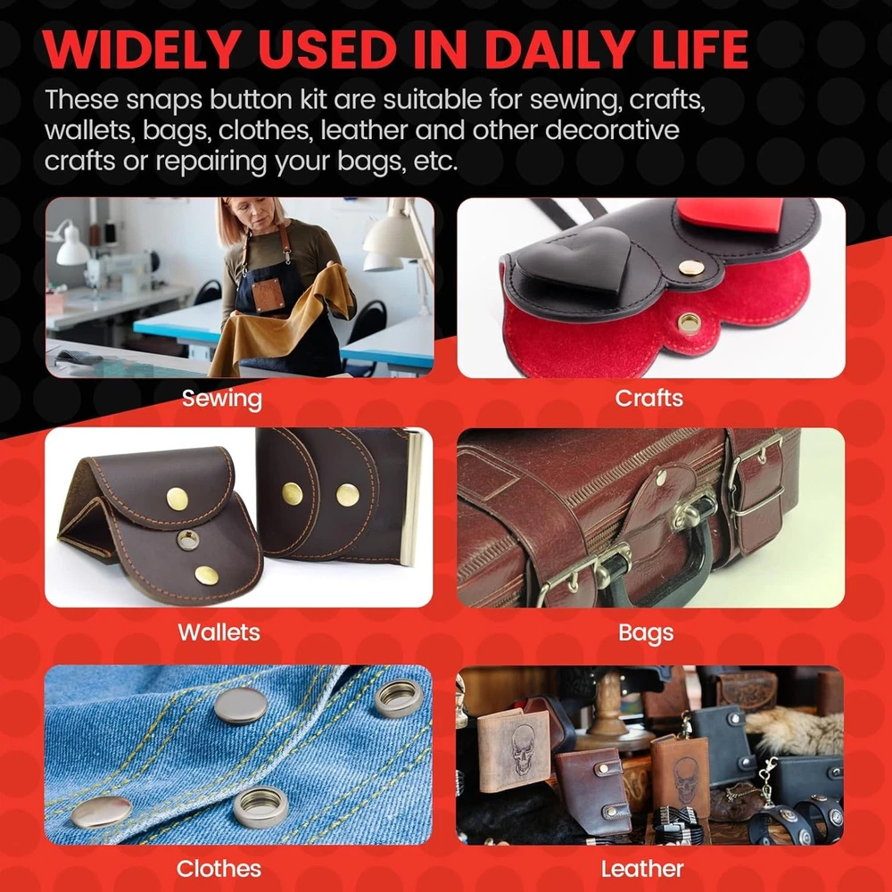 This snap button kit is a game-changer for DIY projects! The heavy-duty tool feels sturdy, and the built-in hole punch makes installation a breeze. The included snaps are high-quality and hold securely on leather and fabric. Love that it comes with everything needed—no extra purchases! Perfect for repairing bags, jackets, or crafting. Highly recommend for durability and ease of use.