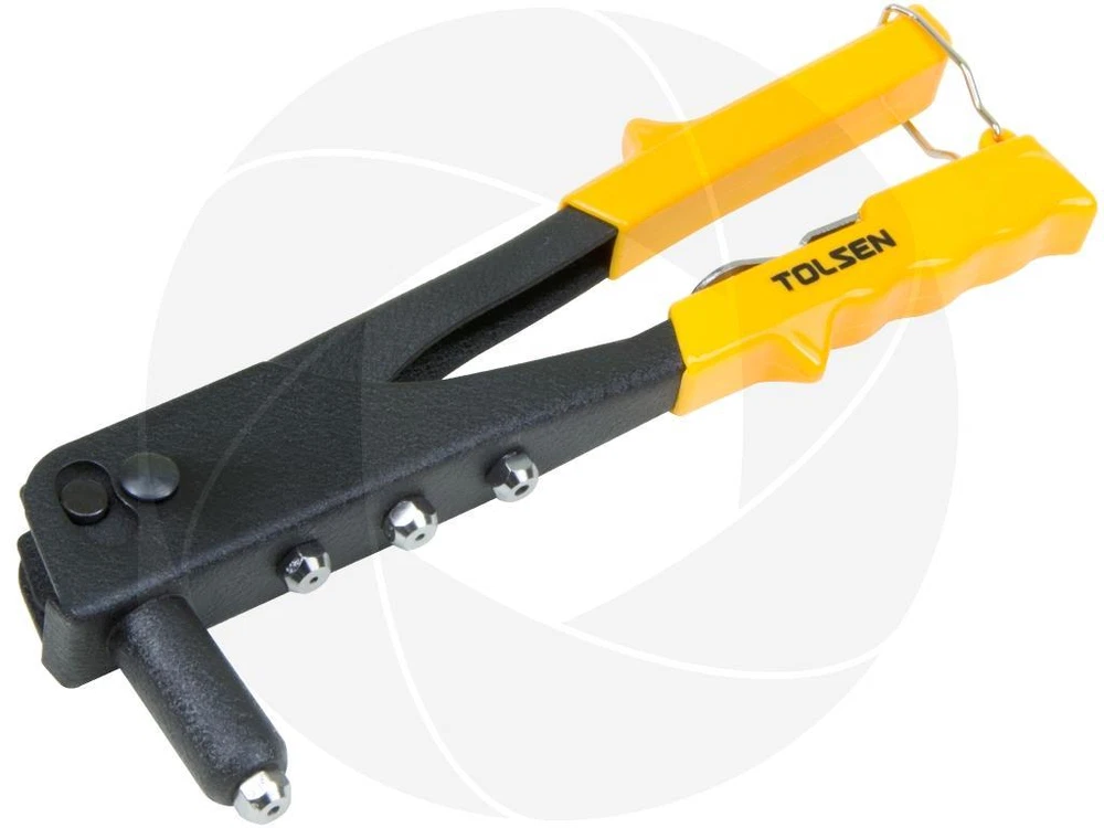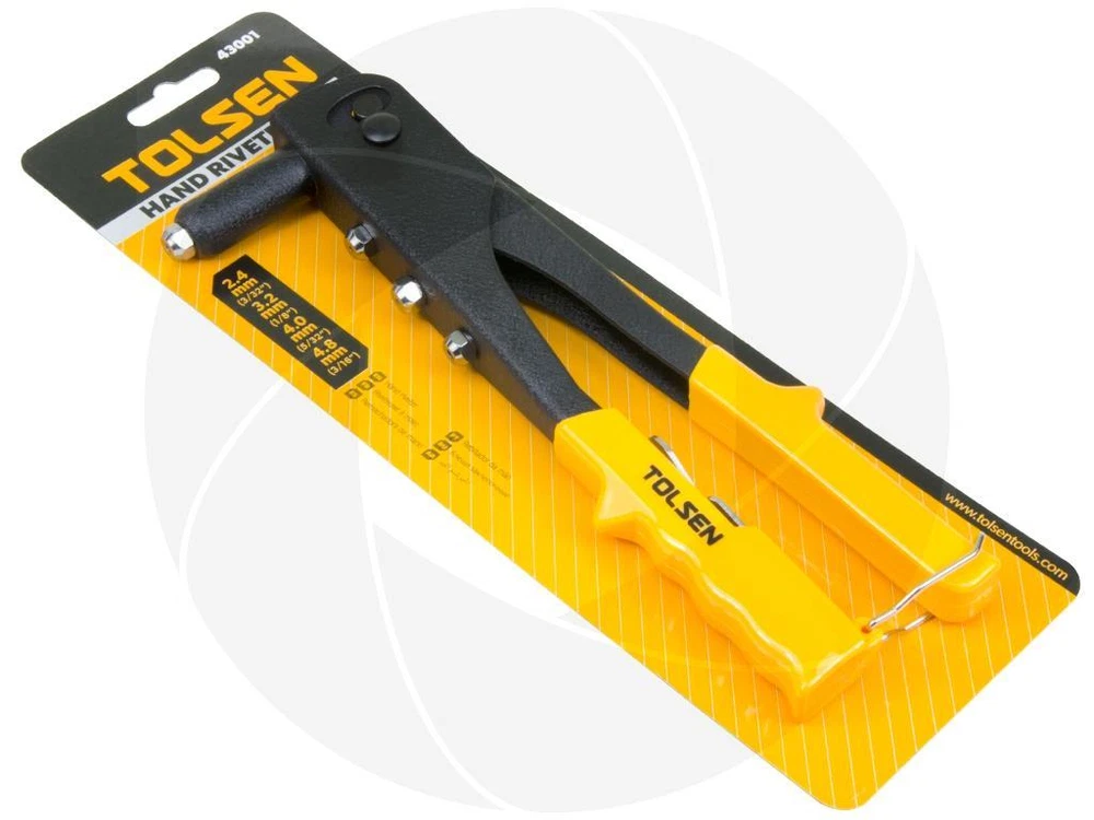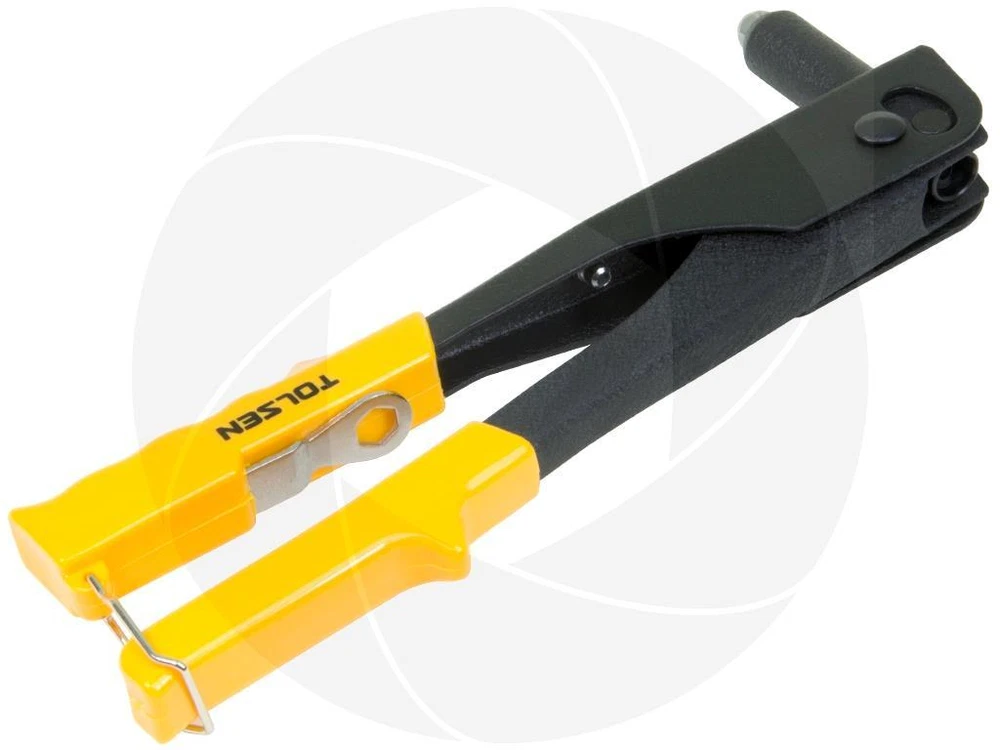Securely fastens sheet metal and heavy fabric in a wide variety of duct-work, construction, and auto body repair applications with the Tolsen rivet gun. Head of the wrench and three additional rivet heads stored on-board in the handle for quick size changes. Its strong and reliable all-steel construction is protected by a durable black wrinkle finish. Features: Rugged all-steel construction Durable black wrinkle finish Nonslip cushioned handle grips Rivet fittings and wrench are stored inside the handle Supplied nozzle wrench Suitable for aluminum rivets Specifications: Brand: Tolsen Model: 43001 Made of rugged steel PVC smooth handles Applicable rivet: 2.4mm (3/32"), 3.2mm (1/8"), 4.0mm (5/32"), 4.8mm (3/16") Length: 10¼in or 25cm Weight: 18oz or 510g Package Includes: Heavy duty industrial steel hand riveter Retail packaging Get Images that Make Supersized Seem Small. Attention Sellers - Get Templates Image Hosting, Scheduling at Auctiva.com. Track Page Views With Auctiva's FREE Counter