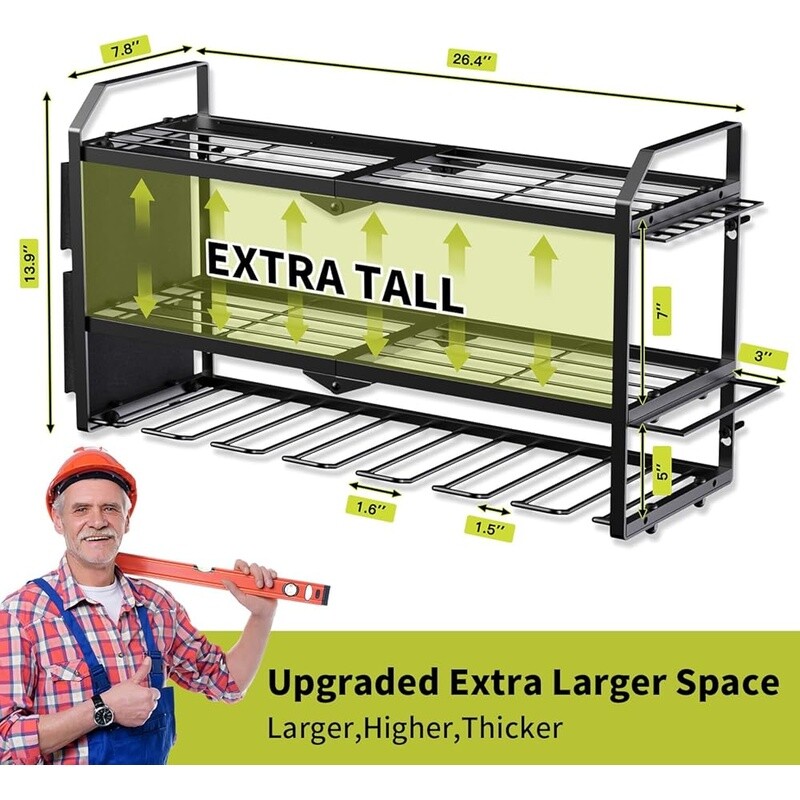 You may also like Tool Organizer Wall Mount 7 Drill Holders Heavy Duty Garage Storage Utility Rack 49.39 USD 51.99 USD Free shipping 5% off 2 Drawer Tool Box Portable Storage Small Parts Organizer Stacking System Resin 49.36 USD 51.96 USD Free shipping 5% off Heavy Duty Toolbox 19 In W/ Lockable Lid Organizers Removable Tray Eye Plastic 18.96 USD 19.96 USD Free shipping 5% off Heavy Duty Tool Organizer Wall Mount 4 Layer Power Tool Rack 8 Drill Holder New 70.66 USD 74.38 USD Free shipping 5% off 34 Compartment Durable Plastic Tool Organizer Box Double Sided Screw Storage New 33.85 USD 35.63 USD Free shipping 5% off Stack-n-Roll Tool Box W/ Two Drawers Customizable Dividers Portable Storage New 49.36 USD 51.96 USD Free shipping 5% off New Heavy Duty 19inch Plastic Toolbox W/ Lid & Removable Tray Organizers Storage 18.96 USD 19.96 USD Free shipping 5% off Heavy Duty 19 In Toolbox W/ Lid Lockable Black New Removable Tray Organizers Eye 18.96 USD 19.96 USD Free shipping 5% off About this item MULTI-PURPOSE WALL MOUNT POWER TOOL ORGANIZER: Perfect storage solution tool to turn your mess workbench or wasted wall space into a tidy and high efficiency working place. It’s a perfect choice for keeping the garages, workshops or sheds items well organized and within easy reach. Also, an amazing christmas or father's day gift for men HEAVY DUTY & STURDIER: Built with premium thickened heavy-duty steel metal materials and high-temperature baking paint process, each tool shelf is durable, rustproof and scratch-proof. No need to worry about broken weld, drill holders break or uneven frame issues UPGRADED DESIGN: The power tool organizer wall mount adopts the latest high-capacity design, the height of the mid-tier shelf is 7 inch, which is enough to place more large tools. Besides, Attached power strip has overload protection, which is UL and FCC certified, you can charge everything right in the rack and avoid searching for sockets 150-POUND BEARING WEIGHT: Tested by professional institutions, the power tool organizer gives ultra-strong reliability with up to 150 lbs of bearing weight after proper installation. Included expansion bolts for greater load bearing, without any shelf breaking or annoying slipping HASSLE-FREE INSTALLATION: Along with your new power tool organizer with charging station and screws & anchors needed to mount it securely, you will receive extra screws, two small tool organizers and bag for place screwdriver/plier/hammer. Also, we offer professional, clear step-by-step manuals that allow everyone easily install it in just minutes Material: Alloy Steel Color: Black Special Feature: Drill bit storage, Tool organizer bag, Hammer storage rack, Screwdriver storage rack, Handheld tool storage, Battery holder storage See more Product Dimensions: 26. 37"D x 7. 87"W x 14. 14"H Shelf Type: Hanging Shelf You may also like Digital Rice Cooker 10 Cup Multi Cooker Steamer Keep Warm Auto Oatmeal Non Stick 61.09 USD 64.31 USD Free shipping 5% off Night Stand W/ Charging Station 4 Drawer Dresser Bedroom Storage Organizer New 67.92 USD 71.49 USD Free shipping 5% off 6FT Pre-Lit Artificial Palm Tree W/ 210 Multi-Color LED Lights Holiday Decor New 97.56 USD 102.69 USD Free shipping 5% off Ergonomic High Back Leather Executive Desk Chair NEW Home Office Computer Chair 111.14 USD 116.99 USD Free shipping 5% off Cutting Board Set of 3 Dishwasher Safe Non Slip Juice Groove Easy Grip Kitchen 22.07 USD 23.23 USD Free shipping 5% off Lightweight Beach Tent Canopy UPF 50 Portable Shelter Family Outdoor Activities 92.39 USD 97.25 USD Free shipping 5% off Portable Countertop Ice Maker Self-Cleaning Efficient 26lbs Daily Noise-Free New 113.41 USD 119.38 USD Free shipping 5% off 6 Inch CBN Grinding Wheel 180 Grit Steel Wheel Bench Grinder Tools Sharpening US 93.85 USD 98.79 USD Free shipping 5% off 60L Slim Laundry Hamper Wicker Design Portable Durable Plastic Lid Storage New 49.39 USD 51.99 USD Free shipping 5% off 7 Abrasives Knife Sharpener Set Carbon Steel Fine 3 Piece W/ Carrying Case Hot 98.74 USD 103.94 USD Free shipping 5% off 32x32x63 Hydroponic Grow Tent High Reflective Mylar Lightproof W/ Window New 74.09 USD 77.99 USD Free shipping 5% off Wooden Heavy Duty Indoor Gun Racks Shotgun Display Rack 12 Rifle Organizer Stand 81.5 USD 85.79 USD Free shipping 5% off