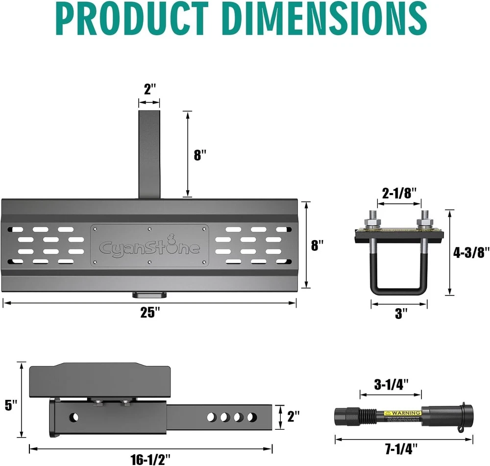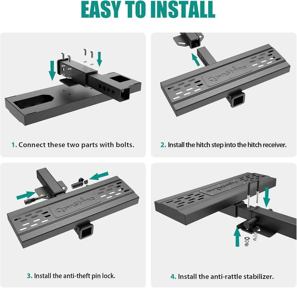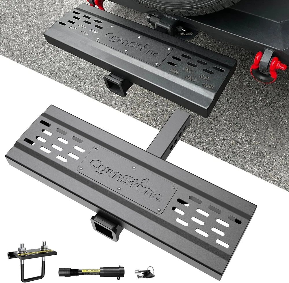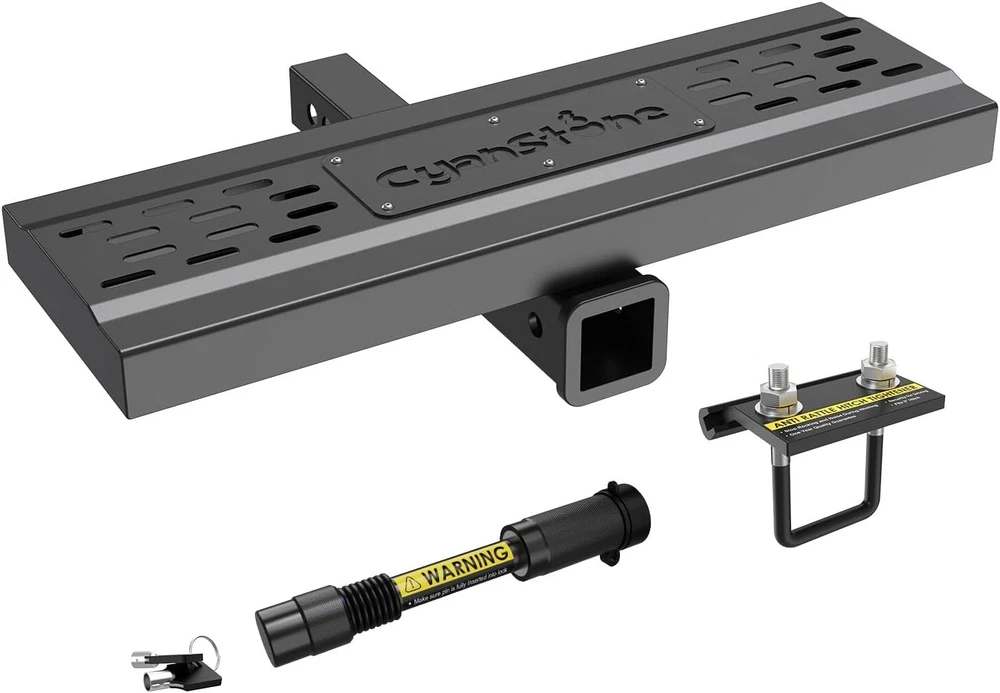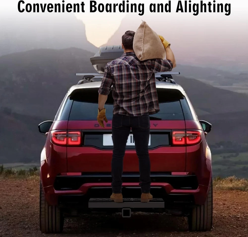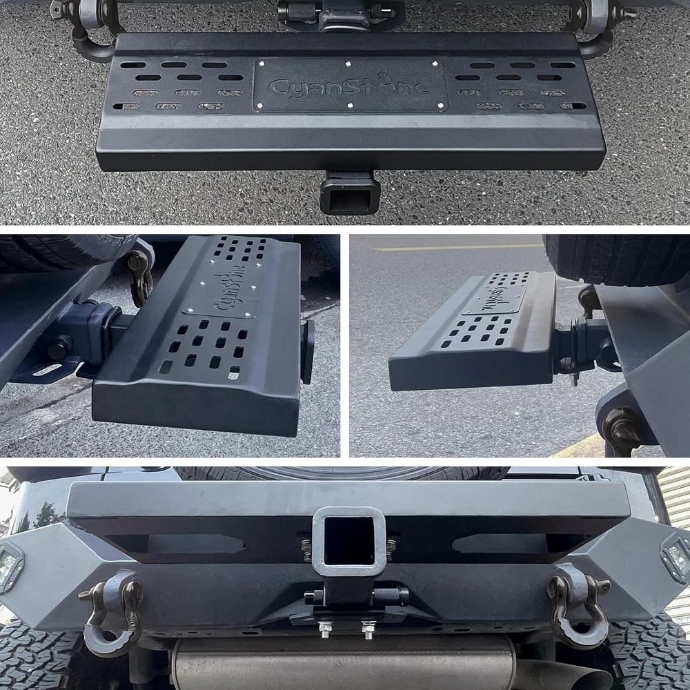 About this item 【Universal Fitment】 Compatible with 2-inch rear hitch receiver, install fast with no drilling or removing(Including safety locks and stabilizers) 【Heavy Duty Hitch Step】 Size for Length: 25". Width: 4". Height: 6.5". Made of 0.12 inch wall thickness tubes with black powder coated finish, durable durability and rust resistance, carrying capacity up to 800 lbs. 【Unique Double Sides Design】 Change the pattern easily as your favor, both side has non-slip design, the height of the pedal can adjusted 4 inch(via converting two sides) 【Helps in Daily Life】 Easy access to roof rack, truck compartment, rear cargo area, has drain holes design no worry with outdoor using, strong and beefy body can reduce the rear end collision. 【Buy With Confidence】 Generally fit for pickup truck/suv/van/Jeep/Ford. We have absolute confidence in the quality of our product, and provide free replacement if you have any issue during your use.