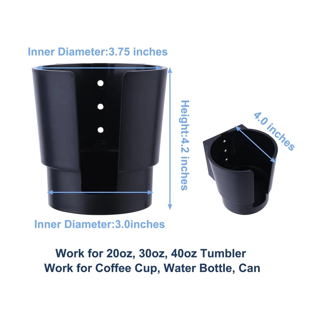 Package includes: 1*plastic cup holder Fit Various Bottles and Cups: With a top diameter of 3.7 inches and a bottom diameter of 3.2 inches, this drink holder is ideal for most cups, bottles, cans, and tumblers, including popular 20 oz, 30 oz, and 40 oz sizes. Versatile Mounting Options: Designed for both horizontal and vertical mounting, this cup holder adapts to your needs. Whether it's a wall, vehicle, or any surface, it's easy to install and secure. Sturdy and Reliable: Made from 4mm thick premium ABS material, this heavy-duty cup holder is built to last. It holds drinks of varying weights with ease, making it a dependable choice for any setting. Rustproof: Crafted with 304 stainless steel screws, the cup holder resists rust, making it perfect for indoor and outdoor use. Ideal for boats, cars, RVs, tractors, wood swing, and more. Easy Installation: Includes one sturdy plastic cup holder and 2 types of stainless steel screws for mounting on wall, wood, or plastic surfaces. With pre-drilled holes, installation is quick and hassle-free.