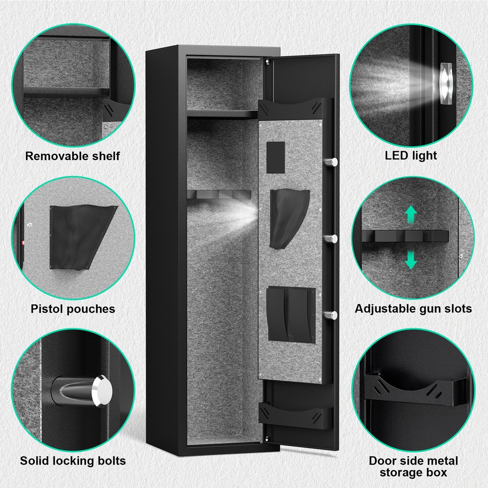 3-4 Rifle Gun Safe Heavy-Duty Deeper Gun Safe for Home Rifle Pistols and Shotgun 【Wider and Deeper Gun Safe】External Dimensions: H47.24''xD11.02''xW11.81''. Wider and deeper than products of the same height,can hold almost 5 rifles up to 47 inches long.The interior features soft foam gun rack and carpeted floor to protect your gun. LED light provide lighting in the dark,allowing you to find your guns in the dark easily. 【Security Gun Safe for Rifles and Shotguns】Rifle safe is constructed from low carbon alloy steel, offering excellent anti-drilling, anti-smashing, and temperature resistance performance. The scratch and stain-resistant powder coat protects the safe from rust and damage. For added security, it can be fixed to the ground, in closets, or any other location. 【Quick Access Gun Safe】The long gun safe for home rifle and shotguns allows you to program your own code for rapid firearm access during emergencies. This gun safe can store 2 sets of digital codes, providing flexibility for multiple users or backup access methods. Additionally, the code memory function ensures that your programmed codes will not be lost even if the batteries are drained, giving you peace of mind and reliable access at all times. 【Dual Alarm System & Mute Function】The gun safe activates its alarm system after 3 consecutive incorrect code. Additionally, a vibration alarm will be triggered if the safe is moved violently. You can cancel the alarm by entering your code or fingerprint to open the door. If you prefer the gun safe to operate silently, you can enable the Mute Function. 【3 Ways to Unlock】The shotgun safe offers 3 convenient methods for unlocking to ensure you can always access your firearms when needed - 1. Code + Handle (Daily Use) 2. Emergency Key + Handle (First opening, forget the code or the batteries drain) 3. USB Type-c Cable + Code + Handle (Batteries drain). 【Complete Accessories & Excellent Customer Service】Includes - 1 x Rifle gun safe, 2 x Emergency keys, 5 x Expansion screws, 1 x USB Type-c Cable, 1 x Instruction manual. If there are any problems with the gun cabinet, please tell us directly, our experienced customer service team will respond within 24 hours and solve the problem.