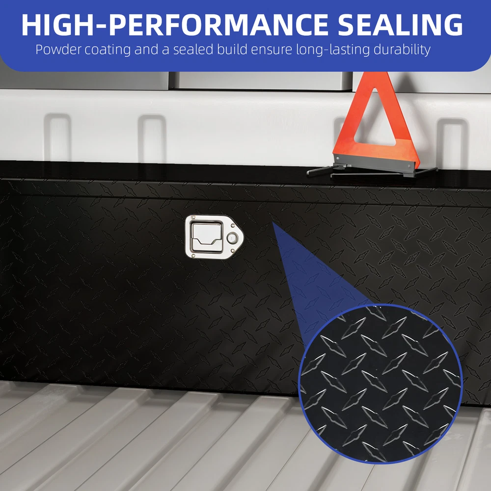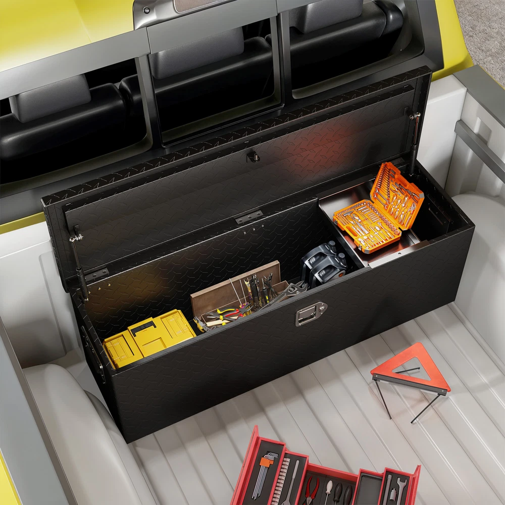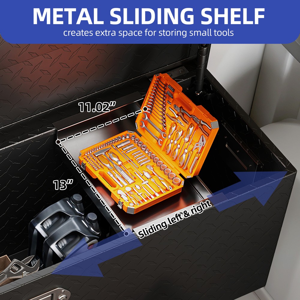 Heavy-Duty Tool Boxes 49"x15" Sliding Shelf Chest Storage Lockable Pickup Truck Product Description NOTE: Professional Installation would be Highly Recommended. Description: 1. Color: Black 2. Material: Alumunium 3. Product Type: Tool Box 4. Shape: Rectangular 5. Finish: Powder Coating 6. Special Features: Heavy-Duty Tool Box, Durable Alumunium, 2 Gas Sturt, Sturdy Lock, 2 Handle, Metal Sliding Shelf, High-Performance Sealing Features: Effortless Access with Sliding Shelf & Gas Struts: Stay organized with a built-in sliding shelf, making it easy to locate small tools quickly. Dual gas struts allow for smooth, hands-free lid opening, providing full visibility and easy access to your equipment. Heavy-Duty Aluminum for Maximum Durability: Built from high-density aluminum with a non-slip surface, this toolbox delivers exceptional strength, stability, and oxidation resistance, ensuring long-lasting performance even in tough environments. Secure, Smooth & Built to Perform: Keep your gear protected with a robust locking system, while stainless steel handles offer easy, rust-resistant portability. The gas strut lid opens smoothly for instant, stable access —perfect for quick grabs on the job. Whether in a truck, garage, or workshop, this toolbox delivers secure storage and effortless functionality wherever you need it. Weatherproof & Rust-Resistant Protection: Engineered with professional-grade sealing strips and a durable powder coating, this toolbox offers superior water and rust resistance, keeping your tools dry, secure, and protected in any weather condition. Versatile Storage for Any Application: Designed for pickup trucks, trailers, RVs, and warehouses, this toolbox extends your storage capabilities, ensuring your tools remain organized, secure, and within reach wherever the job takes you. Dimensions: 1. Product Dimensions: 49"L x 15"W x 15"H 2. Sliding Shelf Dimensions: 11.02"L x 13"W 3. Item Weight: 33.7 lb Package Included: 1 x Tool Box 1 x Assembling Hardware Kits 1 x Instruction Manual Book Shipping 1. Normally the item will be dipatched within 1 business day if payment is cleared before 12pm PST. 2. Please verify the correct shipping address in your PayPal account before making the payment. We only dispatch the item to the address that is sent to us at the time of checkout. 3. We don't ship to Hawaii, Alaska, Puerto Rico, APO/FPO/PO Boxes. 4. We don't provide local pick-up service. 5. Normally we will use USPS, UPS, FedEx & LTL to dispatch items. Payment 1. We accept PayPal and credit card. 2. We will ship to the confirmed Paypal shipping address that is provided with the payment only. Return 1. 30 days Money Back Guarantee. 2. Please contact our customer service to receive a RMA form first if want to return the item. 3. All returned items MUST in new condition with the original package. Contact If has any problem, please contact us by sending an ebay message. Our customer service will resolve the problem as soon as possible. On Mar 26, 2025 at 05:58:14 PDT, seller added the following information: