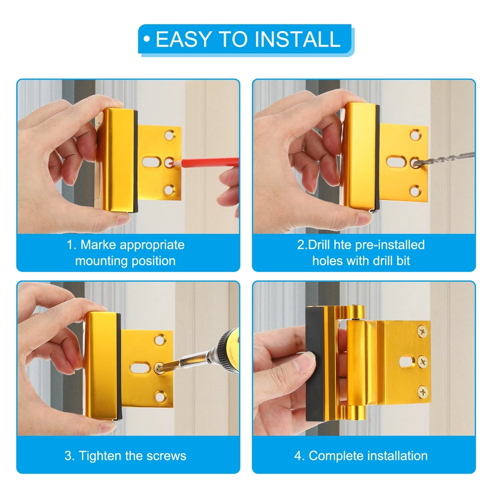 Document The high-security door reinforcement locks help prevent doors from being knocked away, enhancing your home security and keeping you and your family safe! Make sure none of the doors can be opened from the outside.SpecificationColor: SilverMaterial: aluminum AlloyMaximum Withstand Capacity: 800 LbsMounting Plate Size: 63.5 x 56 x 1.95 mm/ 2.5 x 2.2 x 0.08 inch (L*W*Thickness)Lock Part Size: 76 x 25.4 x 35 mm/ 2.99 x 1 x 1.38 inch (L*W*H)Screw Mounting Distance: 20mm/ 0.79 inchScrew Length: 28.9mm/ 1.14 inchPacking List: 1 x Door Reinforcement Lock with 4 ScrewsAdvantage1. The security door lock is made of aluminum alloy with electroplating technology on the surface, which is rust-proof, moisture-proof, corrosion-resistant, comfortable to touch, durable, and has a long service life.2. The home anti-theft door lock is a tamper-resistant, child-safe lock that prevents unauthorized entry through lock bumping. Designed to withstand up to 800 pounds of force when opening an interior door, it enhances home security and prevents doors from being knocked away, keeping your family safe.InstructionEquipped with 4 pieces of 28.9mm(1.13") screws and operation manual to help ensure an easy and quick installation.To unlock, pinch the top and bottom of the door lock. Then slide the lock sideways along the door towards the hinge direction until it can be pulled outward.NOTE: Please measure the door plate thickness before ordering. Home Security Door Lock Aluminum Reinforcement Lock Withstand 800Lbs Silver The high-security door reinforcement locks help prevent doors from being knocked away, enhancing your home security and keeping you and your family safe! Make sure none of the doors can be opened from the outside. Specification Color: Silver Material: aluminum Alloy Maximum Withstand Capacity: 800 Lbs Mounting Plate Size: 63.5 x 56 x 1.95 mm/ 2.5 x 2.2 x 0.08 inch (L*W*Thickness) Lock Part Size: 76 x 25.4 x 35 mm/ 2.99 x 1 x 1.38 inch (L*W*H) Screw Mounting Distance: 20mm/ 0.79 inch Screw Length: 28.9mm/ 1.14 inch Packing List: 1 x Door Reinforcement Lock with 4 Screws Advantage 1. The security door lock is made of aluminum alloy with electroplating technology on the surface, which is rust-proof, moisture-proof, corrosion-resistant, comfortable to touch, durable, and has a long service life. 2. The home anti-theft door lock is a tamper-resistant, child-safe lock that prevents unauthorized entry through lock bumping. Designed to withstand up to 800 pounds of force when opening an interior door, it enhances home security and prevents doors from being knocked away, keeping your family safe. Instruction Equipped with 4 pieces of 28.9mm(1.13") screws and operation manual to help ensure an easy and quick installation. To unlock, pinch the top and bottom of the door lock. Then slide the lock sideways along the door towards the hinge direction until it can be pulled outward. NOTE: Please measure the door plate thickness before ordering. Hot Item Payment 1.We accept eBay payment . 2.Payment must be received within 7 business days of auction closing. Shipping 1.We ship to your eBay or Paypal address. Please make sure your eBay and Paypal address is correct before you pay. 2.Items will be shipped within 1-3 business day when we received payment. 3.Delivery time depends on destination and other factors. Description Policy Home Security Door Lock Aluminum Reinforcement Lock Withstand 800Lbs Silver The high-security door reinforcement locks help prevent doors from being knocked away, enhancing your home security and keeping you and your family safe! Make sure none of the doors can be opened from the outside. Specification Color: Silver Material: aluminum Alloy Maximum Withstand Capacity: 800 Lbs Mounting Plate Size: 63.5 x 56 x 1.95 mm/ 2.5 x 2.2 x 0.08 inch (L*W*Thickness) Lock Part Size: 76 x 25.4 x 35 mm/ 2.99 x 1 x 1.38 inch (L*W*H) Screw Mounting Distance: 20mm/ 0.79 inch Screw Length: 28.9mm/ 1.14 inch Packing List: 1 x Door Reinforcement Lock with 4 Screws Advantage 1. The security door lock is made of aluminum alloy with electroplating technology on the surface, which is rust-proof, moisture-proof, corrosion-resistant, comfortable to touch, durable, and has a long service life. 2. The home anti-theft door lock is a tamper-resistant, child-safe lock that prevents unauthorized entry through lock bumping. Designed to withstand up to 800 pounds of force when opening an interior door, it enhances home security and prevents doors from being knocked away, keeping your family safe. Instruction Equipped with 4 pieces of 28.9mm(1.13") screws and operation manual to help ensure an easy and quick installation. To unlock, pinch the top and bottom of the door lock. Then slide the lock sideways along the door towards the hinge direction until it can be pulled outward. NOTE: Please measure the door plate thickness before ordering. Hot Item Payment 1.We accept eBay payment . 2.Payment must be received within 7 business days of auction closing. Shipping 1.We ship to your eBay or Paypal address. Please make sure your eBay and Paypal address is correct before you pay. 2.Items will be shipped within 1-3 business day when we received payment. 3.Delivery time depends on destination and other factors.