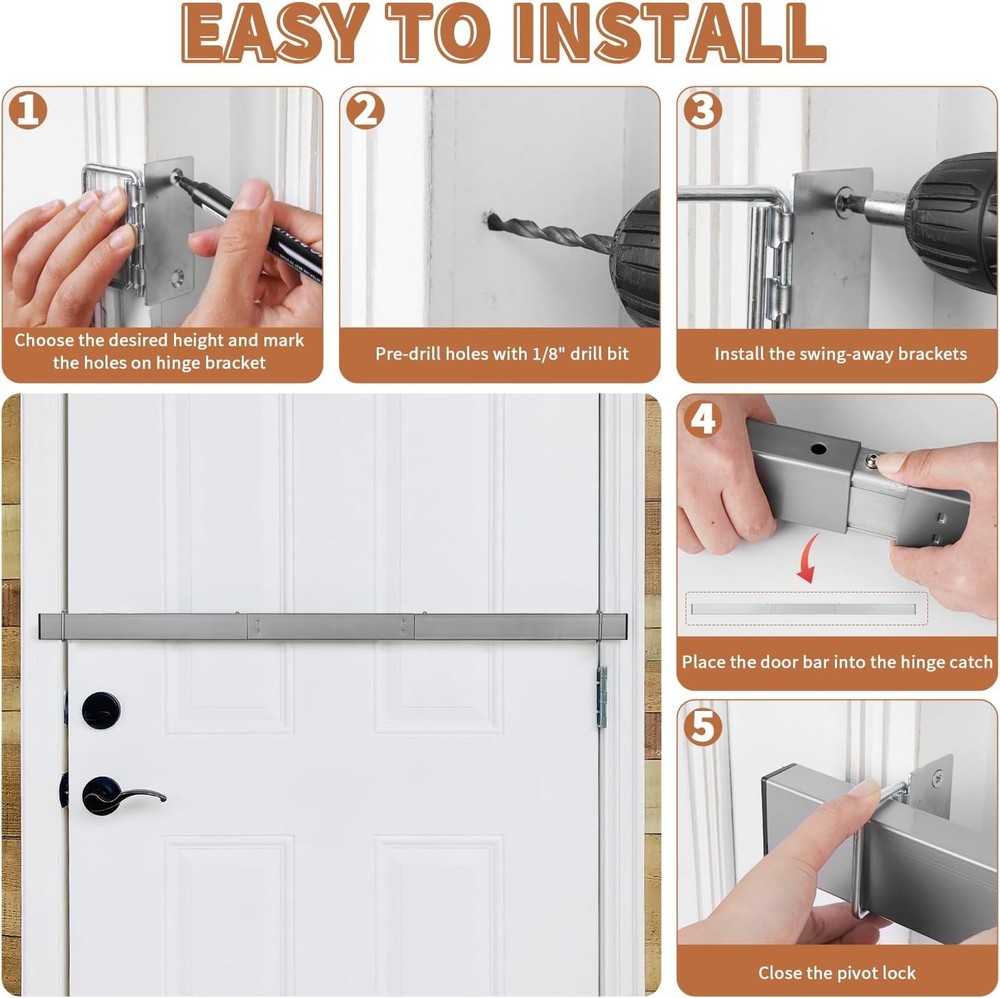 Door Security Bar Barricade Brackets Kit Set Door Stopper Home Defense Security Devices for Front Door Product Details Manufacturer: yingranlock Item Weight: 4.11 pounds Package Dimensions: 16.61 x 4.61 x 2.44 inches Batteries Included?: No Batteries Required?: No Only 4 screws are needed for installation, the installation can be referred to (Figure 5). We have prepared two sets of screws for you, including 4 long screws and 4 short screws. which you can choose according to your needs Fitting right across the door and its frame, the security bar locks in position to stop the door from being opened outward, protecting against attacks on the door to either the opening or the hinged side Heavy-duty: all-steel door lock provides a simple solution for making sure your building is secured. This is a great way to secure office, warehouse and trailer doors Enhanced Security: A great way to secure office, warehouse and trailer doors that are 32"W to 40"W Corrosion Resistant: Powder-coat paint stands up to the toughest outdoor elements, and Heavy-duty, all iron can't be broken or cut Door Security Bar