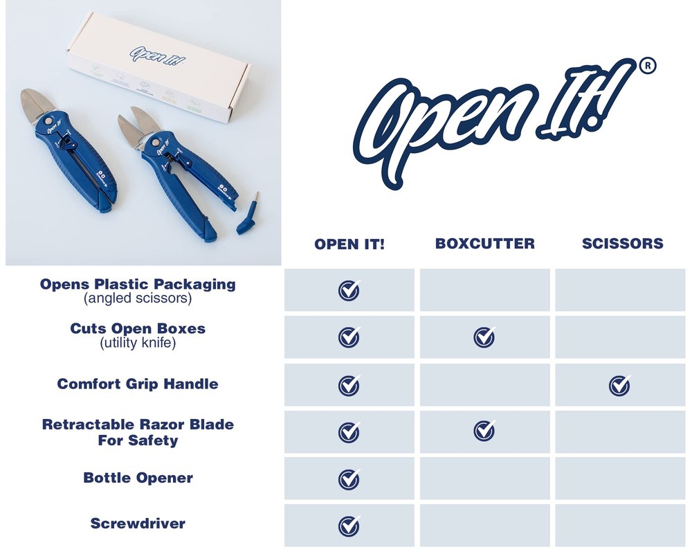 The Open It! is a 4-in-1 package opening tool. It has the ability to cut, slice, snip, and unscrew - open any packaging with speed, efficiency, and safety. Fitted with angled blades, a retractable razor blade, and a pull-out screwdriver, the Open It! can cut through tough plastic, delivery boxes, zip ties, cardboard, flower stems, thin wires, and more. Open-It! Tool Package Opener: This 4-in-1 package opener + box cutter gives you the ability to cut, slice, snip, and unscrew Versatile Multi Tool: Fitted with angled blades, a retractable razor blade, and a pull-out screwdriver, this package / box opener can cut through thicker packaging, zip ties, wire, and flower stems The Ultimate Gadget: The handle of this plastic package opener houses a retractable razor blade and a pull-out screwdriver with both flat and Phillips heads Quality Construction: Designed to safely open packages with speed and efficiency, the angled multi-tool blades cut through even the toughest plastic, including toy packaging containing zip ties and batteries Safe, Comfortable, and Easy To Use: These multi-purpose metal shears come equipped with a comfort grip handle