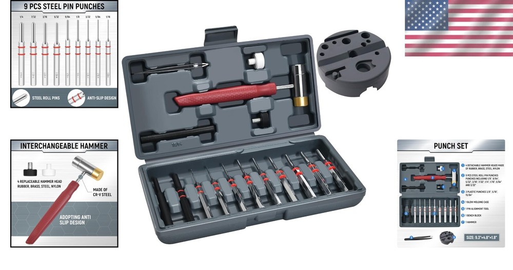 Precision Pin Punch Set with Magnetic Block and Hammer Heads
