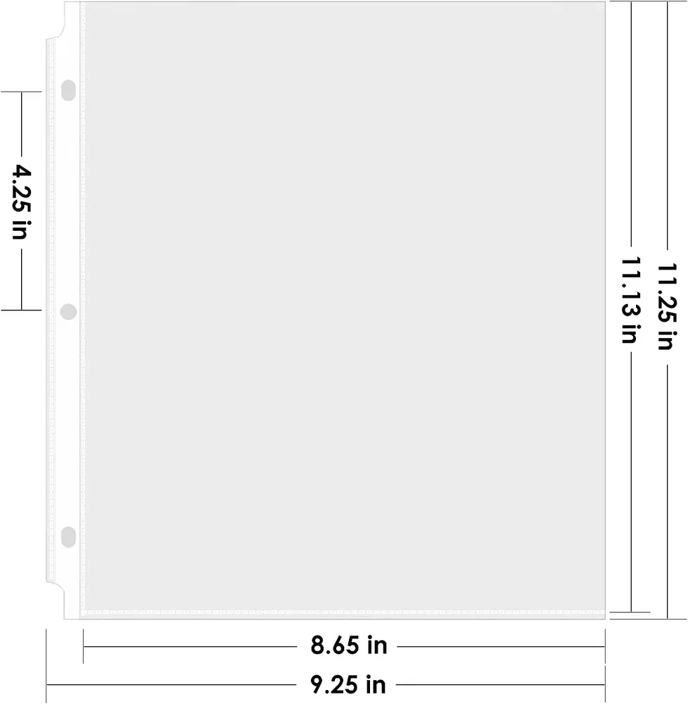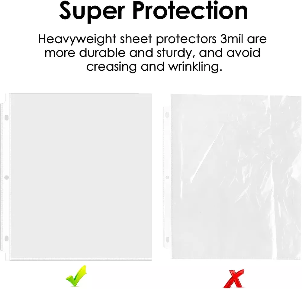 Heavyweight 3 Mil and Durable: Each sheet protector can hold 8.5 x 11 inches( letter size) sheet of paper, 3mil thickness, more durable than ordinary paper protectors. Top Loading: Easy top loading feature on clear sheet protectors provides a wider top opening, so paper is easy to slide in and take out. Transparent: Reinforced holes on the plastic sheets for three-ring binder, clear design offers complete transparency for easy viewing. Excellent Material: Made of high quality polypropylene, it is the excellent plastic paper sleeves for binders. Wide Application: Paper protector is ideal for keeping recipes, photos, important documents, certificates. Page protector keeps them from the wear and tear. Product Description KTRIO Clear Sheet Protector Series Add to Cart Add to Cart Add to Cart Add to Cart Add to Cart Add to Cart Add to Cart Customer Reviews 4.7 out of 5 stars 1,143 4.7 out of 5 stars 31,773 4.6 out of 5 stars 2,171 4.7 out of 5 stars 4,067 4.6 out of 5 stars 957 4.6 out of 5 stars 1,053 4.7 out of 5 stars 622 Price $5.99 $ 5 . 99 $5.99 $ 5 . 99 $5.64 $ 5 . 64 $12.88 $ 12 . 88 $25.99 $ 25 . 99 $5.49 $ 5 . 49 $6.99 $ 6 . 99 Features Storage photos, documents Storage photos, documents Non-glare, storage paper Storage photos, documents Storage photos, documents Classify documents Storage playbill, paper Color Clear Clear Clear Clear Clear Clear pocket & Colored tabs Clear Size 8.5 x 11 inch 8.5 x 11 inch 8.5 x 11 inch 8.5 x 11 inch 8.5 x 11 inch 8.5 x 11 inch 5.5 x 8.5 inch Material Durable PP Material Durable PP Material Durable PP Material Durable PP Material Durable PP Material Durable PP Material Durable PP Material Package 30 Pack 50 Pack 50 Pack 200 Pack 500 Pack 2 Sets 60 Pack