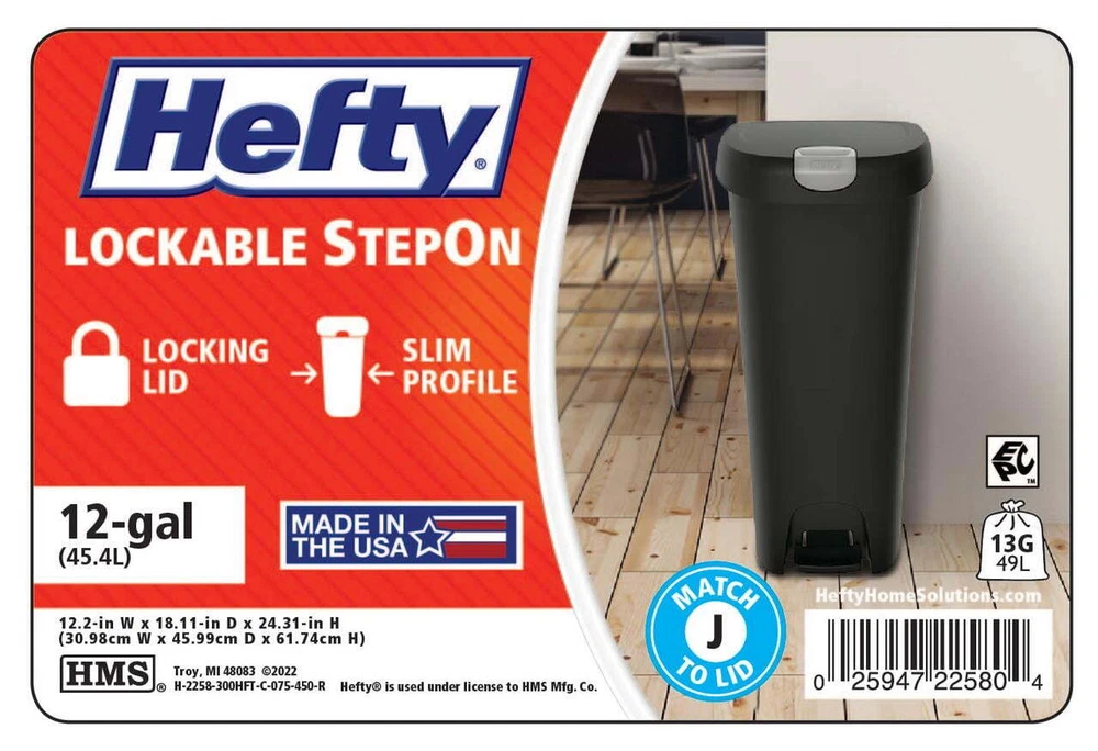 The Hefty Lockable Step On Plastic Trash Can has a locking lid to help keep curious pets and children out and easily avoid messes. The slim design in black with a 12-gallon capacity make this an large kitchen trash can great for busy families who want to limit trips to take the garbage out. Use the step on pedal for easy, hands-free trash disposal. It also uses standard 13 gallon kitchen trash bag. On Dec 22, 2024 at 17:41:50 PST, seller added the following information: